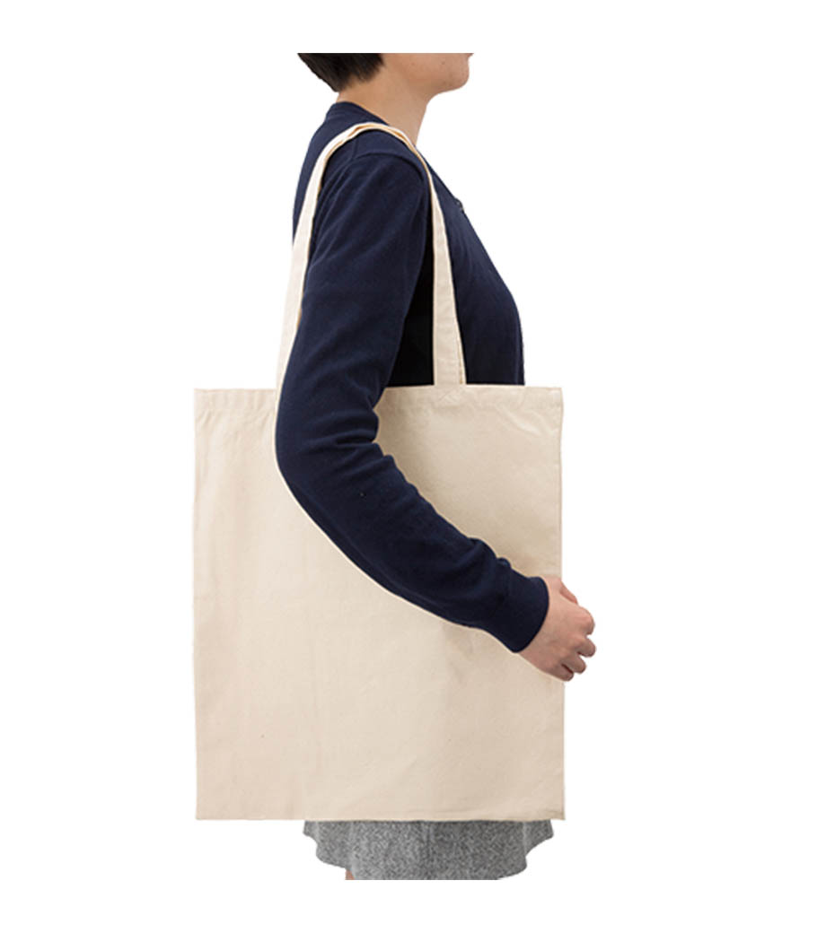 長めのハンドルで肩掛けできる、ちょっと大きめのマチなしコットンバッグ。お勤め帰りのお買い物や、急に荷物が増えたときも安心です。シンプルなデザインで軽いので、メインバッグとの2個持ちでもスマートに使えます。