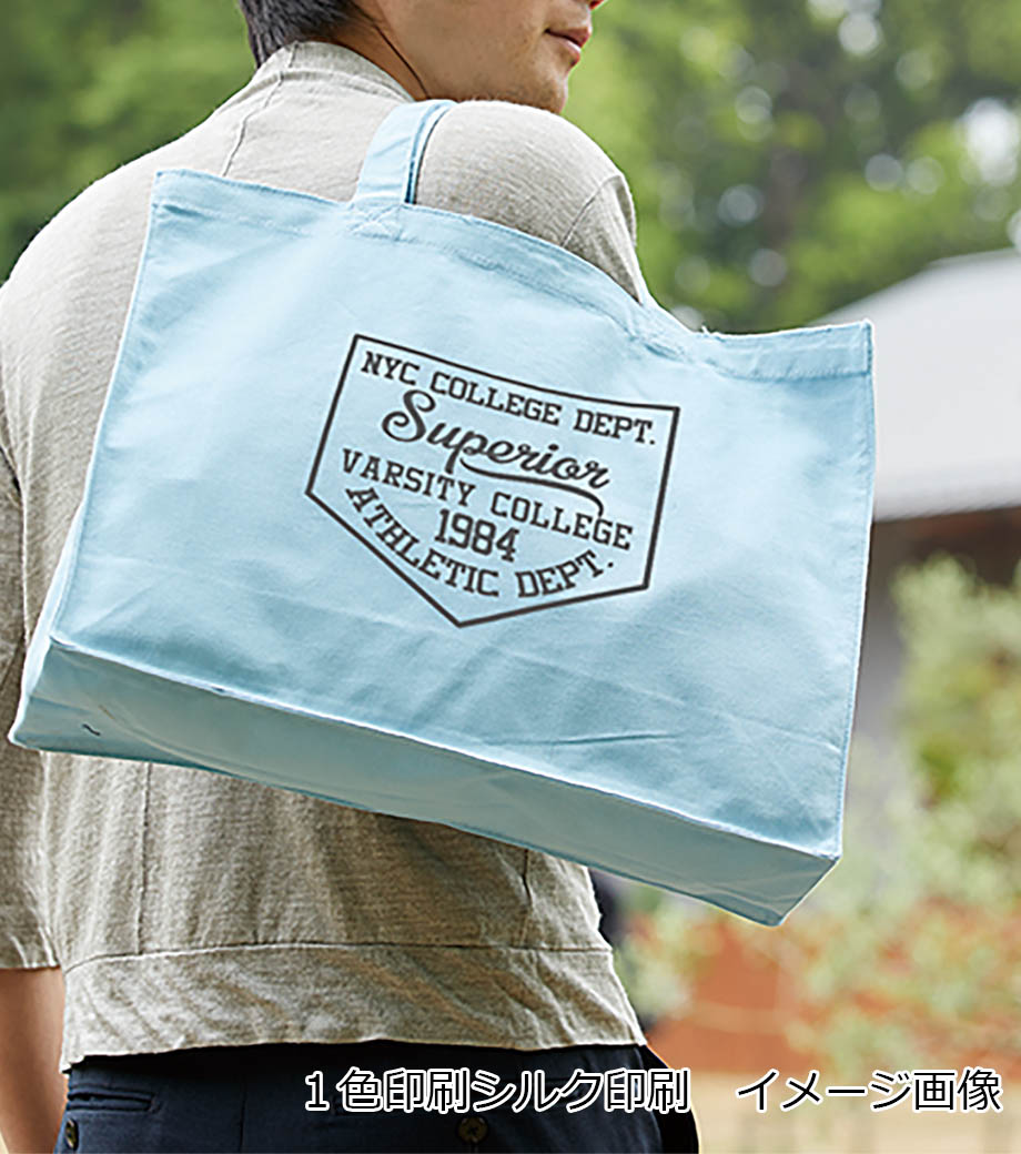 大き目サイズでマチが広く、B4書類と一緒に衣類もすっぽり入り、普段使いにもお勧めです。1色印刷か転写印刷をして記念日の限定ノベルティや、オリジナルバッグ作成にいかがでしょうか。