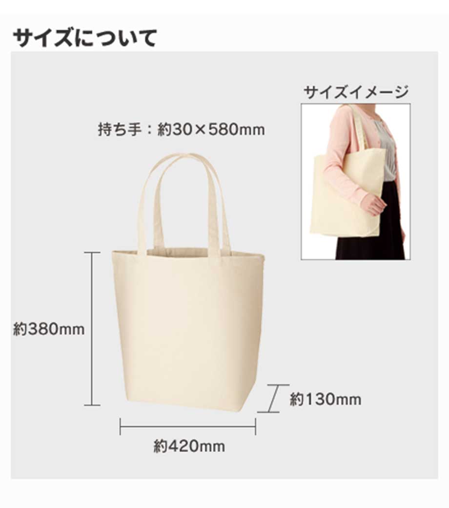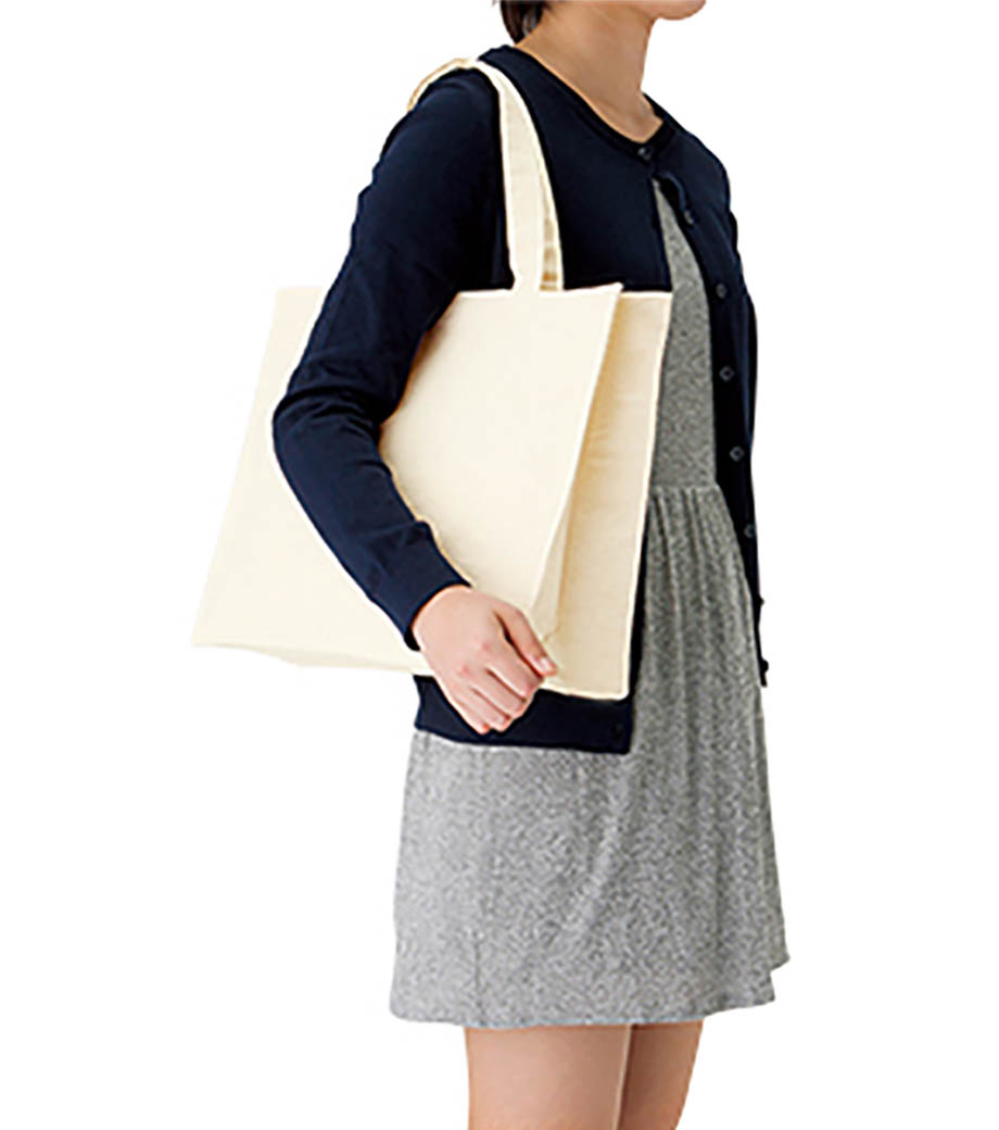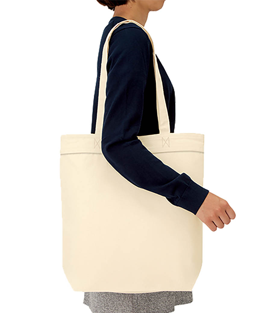 マチ付きでたっぷり収納できる大容量トートバッグ。 B4サイズの大きな荷物もすっきり収まり、ゆったり肩掛けできるので持ち運びも快適です。中身が透けにくい8オンスのコットン素材を使用しており実用性と安心感を兼ね備えています。通勤・通学・習い事、プチ旅行にも活躍する頼れるアイテムです。