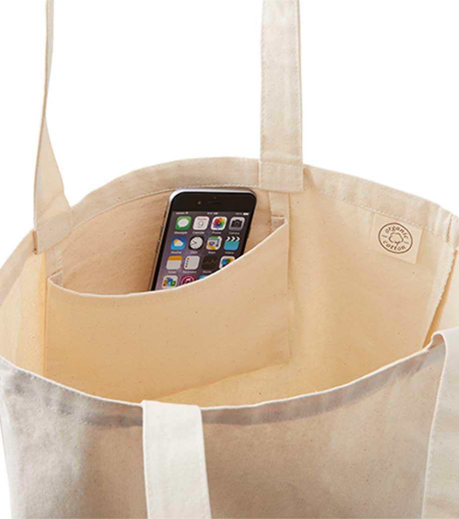 B4書類がすっきり入るマチ付きのトートバッグです。便利な内ポケットはスマホやカギがさっと取り出せて便利。オーガニックコットンを使用しており、SDGsへの取り組みアピールにも繋がります。