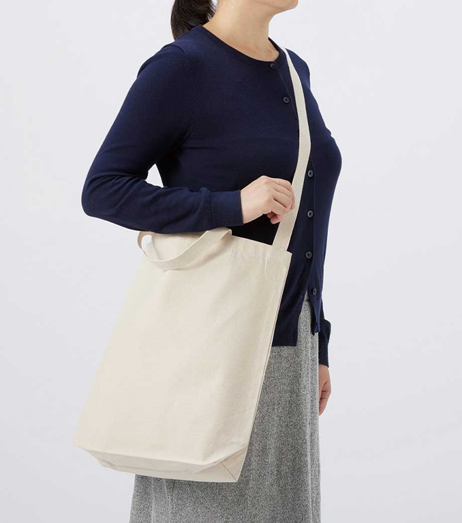 長めのハンドルで肩掛けできる、ちょっと大きめのマチなしコットンバッグ。お勤め帰りのお買い物や、急に荷物が増えたときも安心です。シンプルなデザインで軽いので、メインバッグとの2個持ちでもスマートに使えます。