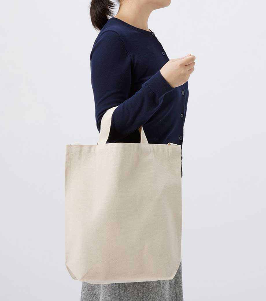 学校・保育園の定番手提げサイズです。印刷面が広く学校や習い事ロゴを印刷してノベルティや宣伝活動におススメです。短めのハンドルでフラットなマチなし。B4サイズがぴったり収まります。8ozは厚すぎないから、お子様にも持ちやすい生地感です。