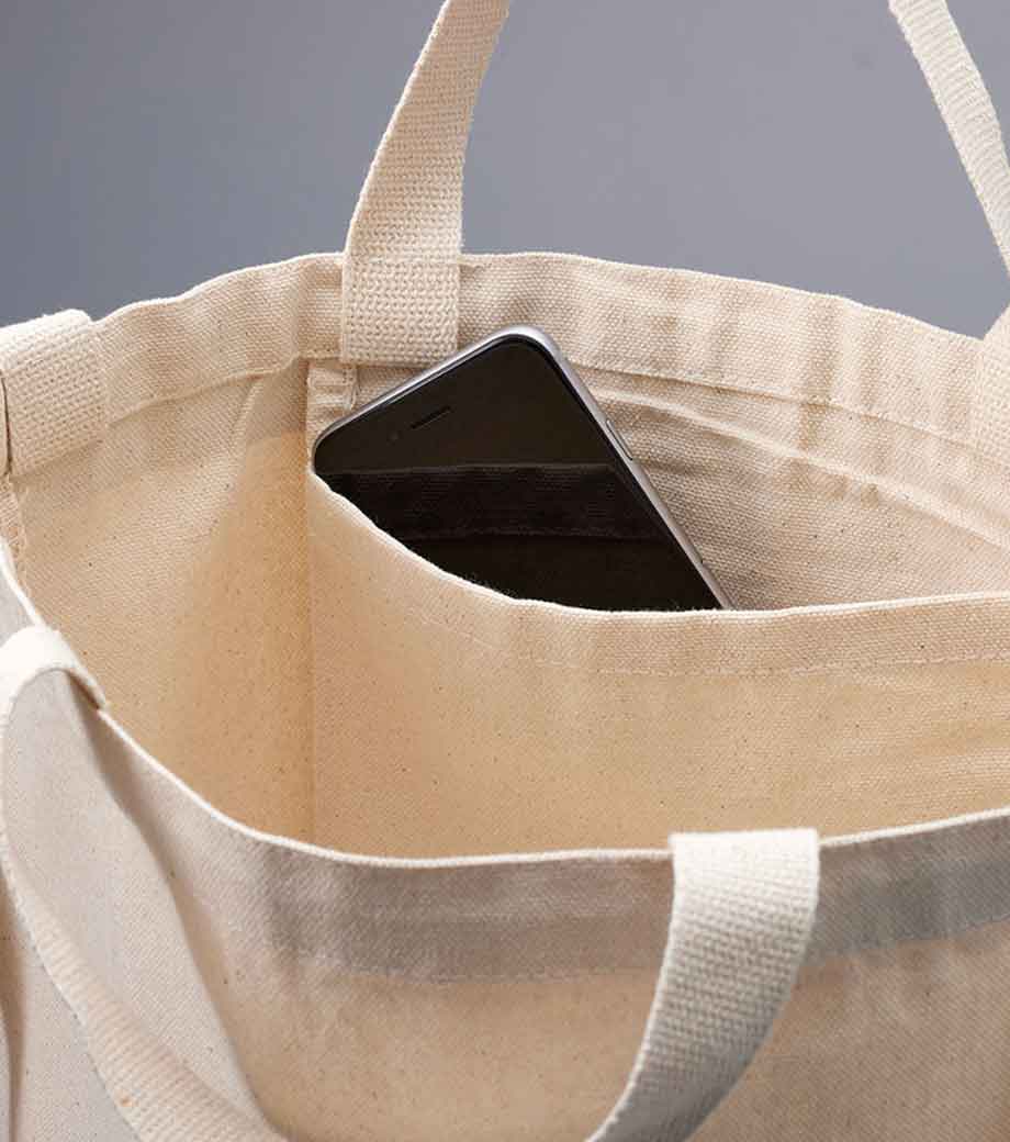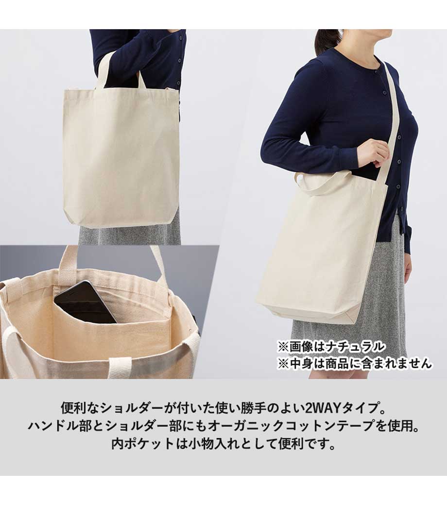 オーガニックコットンキャンバスWスタイルバッグはマチ付きでショルダーにも手さげにもなる2WAYコットントートバッグです。スマホやキーケースが入れられる内ポケット付き。厚さ10オンスのしっかりした生地で、中身が透けません。新聞の折り込みチラシほどの大きさがすっぽり入る大容量B4サイズ。持ち手は綿テープで持ちやすく、肩にもかけやすい柔らかいショルダー紐です。