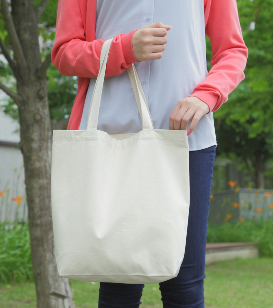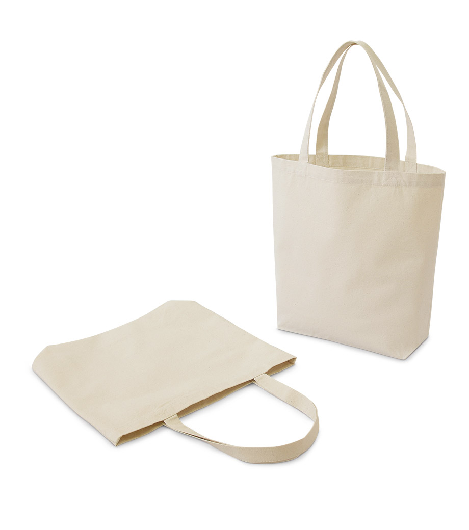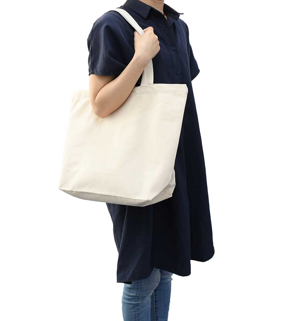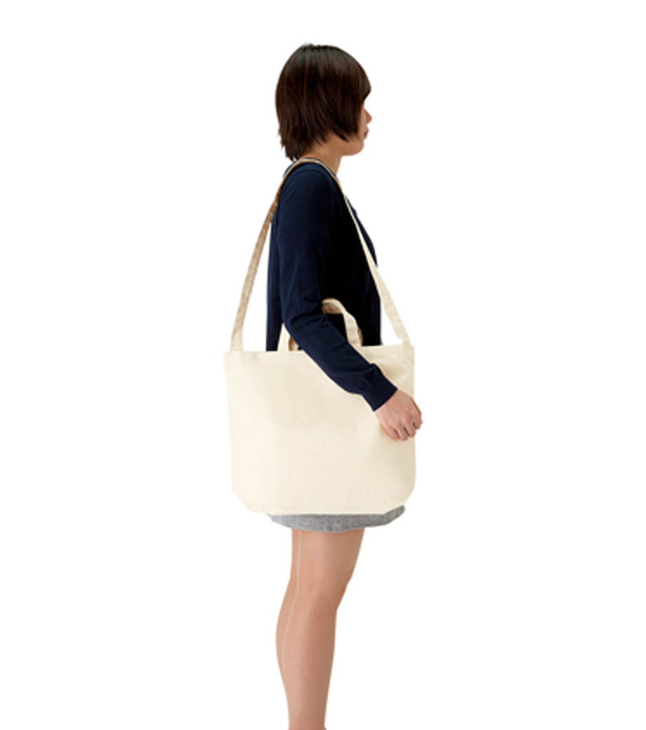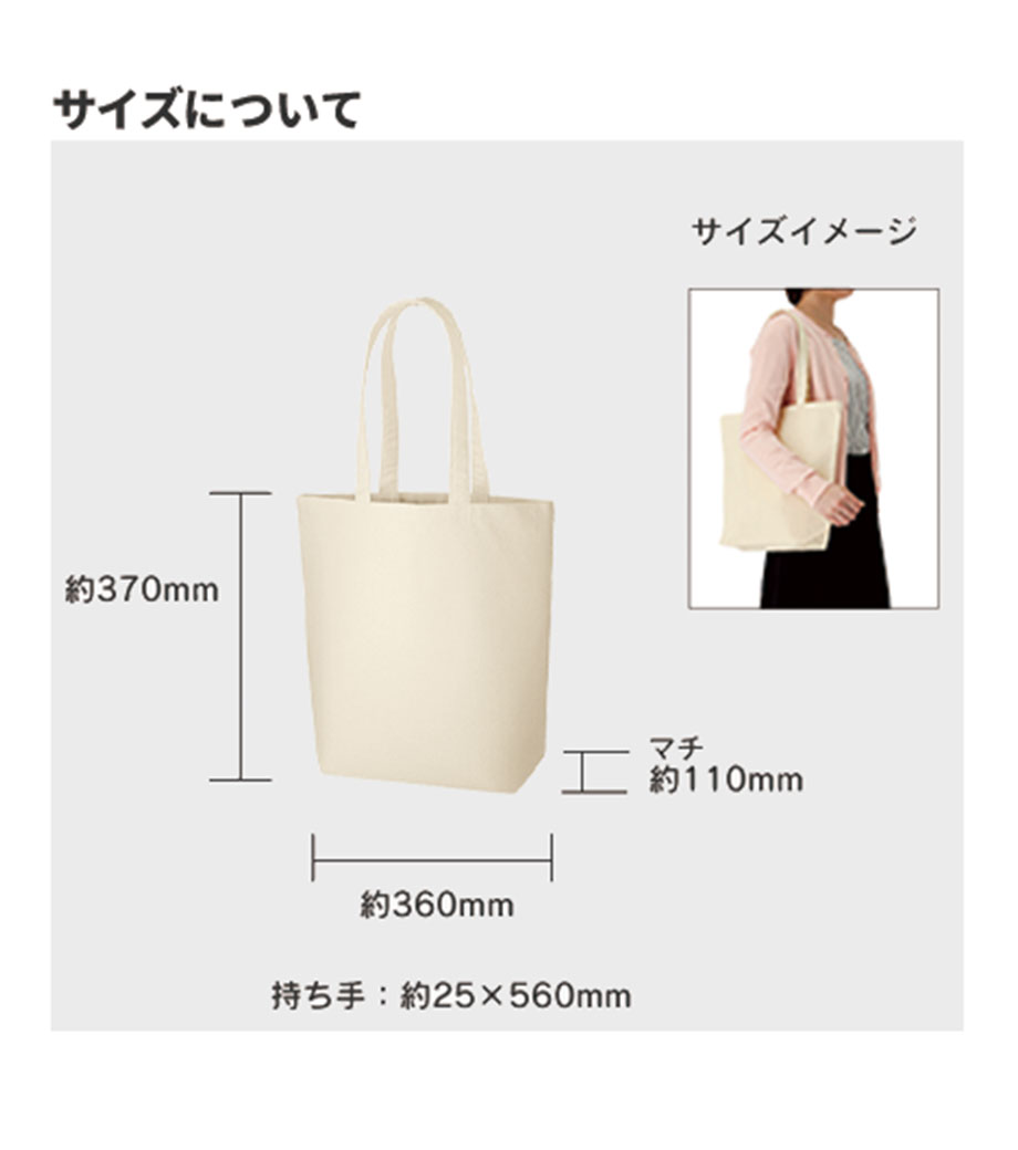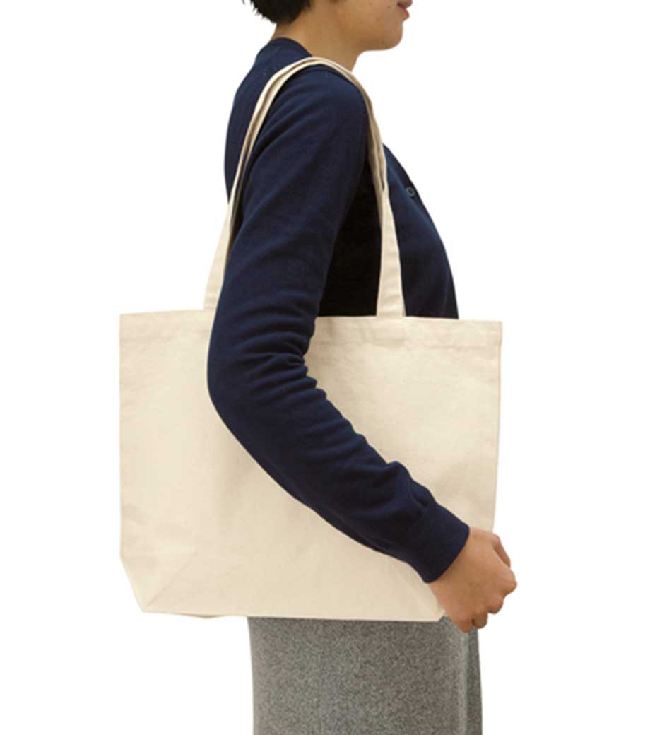 厚手コットンバッグ トートMワイドは、大きめサイズの肩掛けトートバッグ。A4サイズが縦に入るサイズです。12オンスのコットン生地で、しっかりとした厚み。肩掛けできる長さの持ち手は、大きい書類や重いものを運ぶのにも便利です。