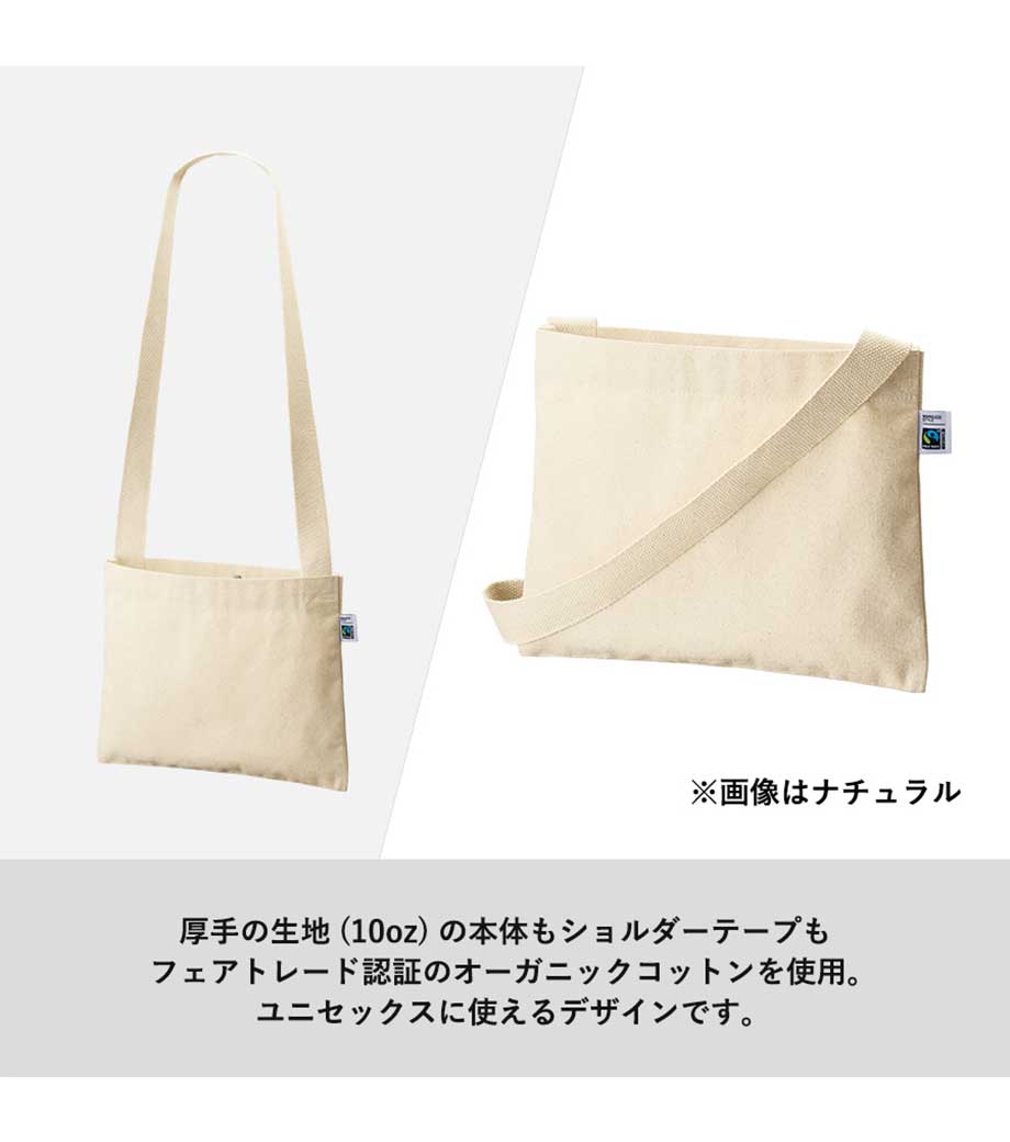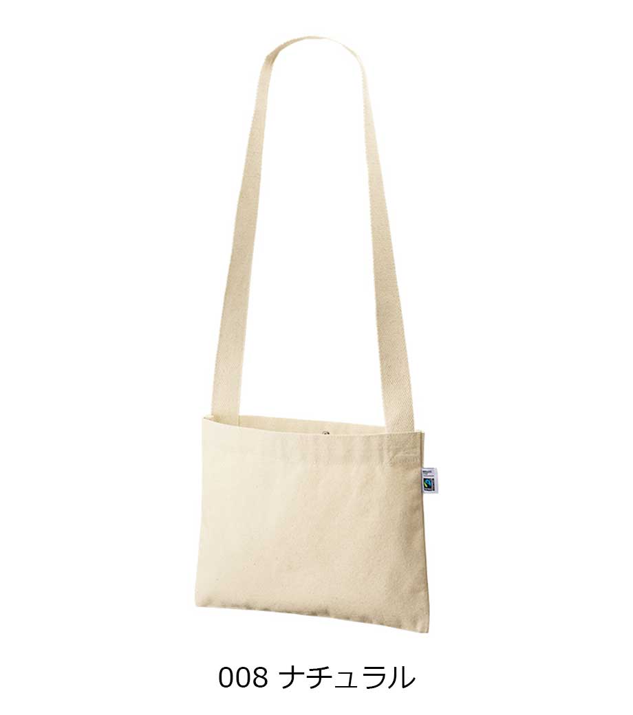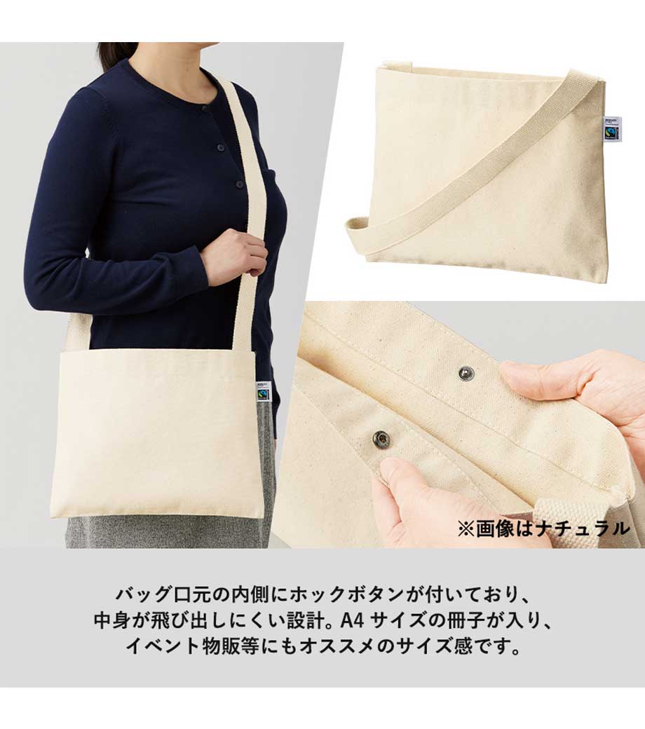 フェアトレードコットンキャンバスサコッシュは、国際フェアトレード基準に認証されたコットンを使用したマチなしのサコッシュ。約10オンス相当の丈夫なキャンバス生地で、縫製もしっかりしています。両手が空くので、イベント参加時のサブバッグやちょっとしたお出かけ用のバッグになります。ホックボタン付きで荷物が飛び出すのを防いでくれるのもポイント。