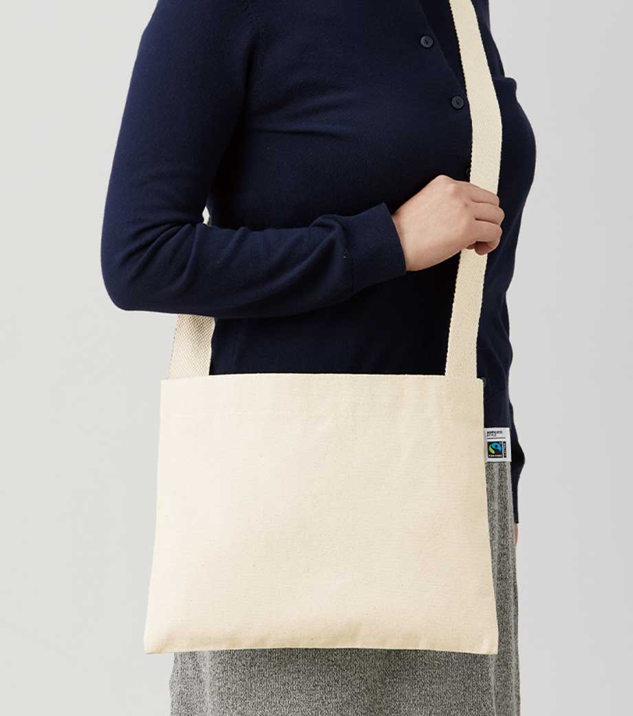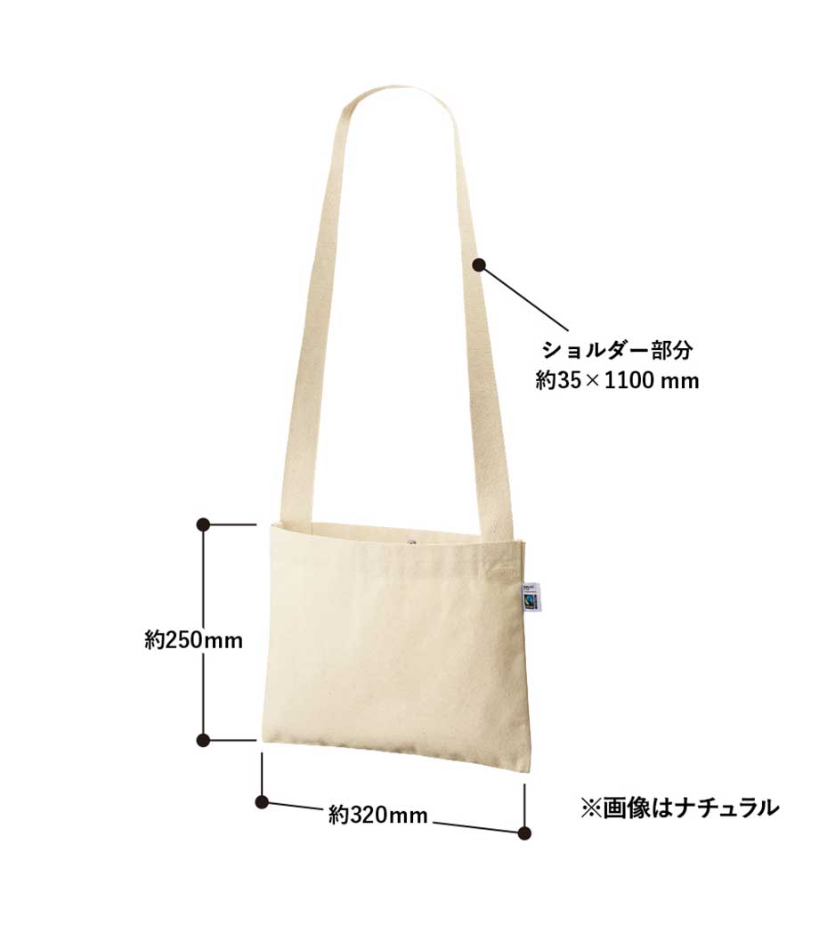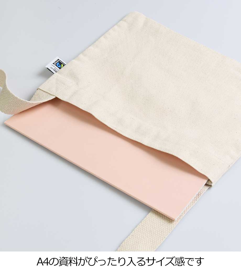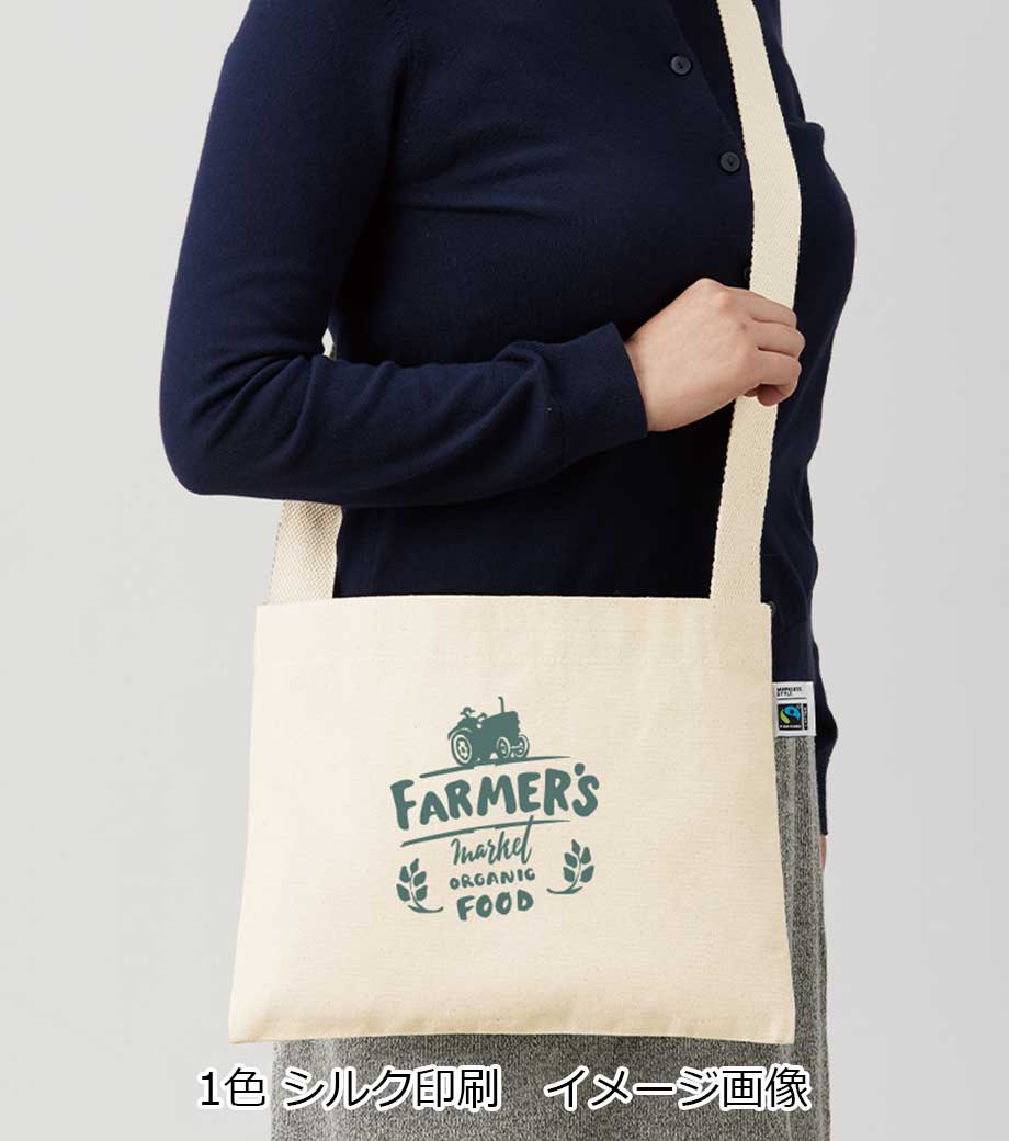 フェアトレードコットンキャンバスサコッシュは、国際フェアトレード基準に認証されたコットンを使用したマチなしのサコッシュ。約10オンス相当の丈夫なキャンバス生地で、縫製もしっかりしています。両手が空くので、イベント参加時のサブバッグやちょっとしたお出かけ用のバッグになります。ホックボタン付きで荷物が飛び出すのを防いでくれるのもポイント。