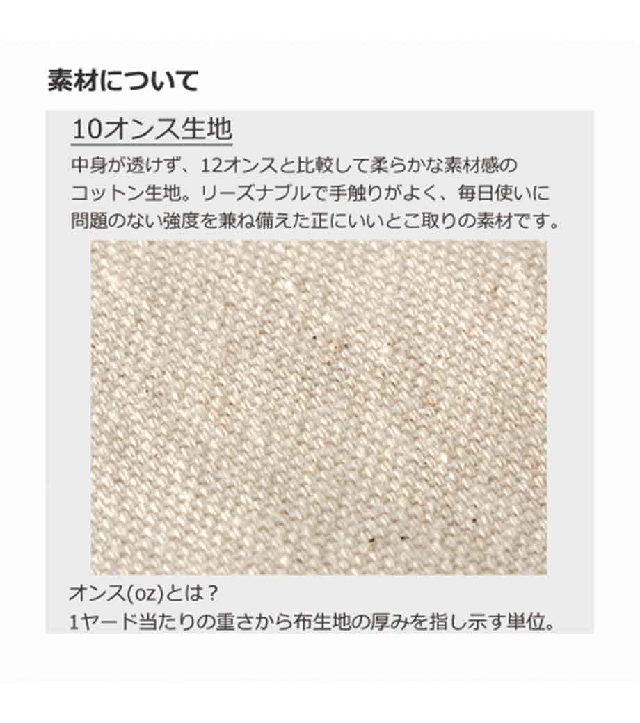 生地は丈夫で厚みのある12オンス生地を採用しています。しっかり収納できるマチ付きで、2Lペットボトルが縦に丁度入る大きさ。普段使いにピッタリなカジュアルなデザインは、世代を問わずお使いいただけます。