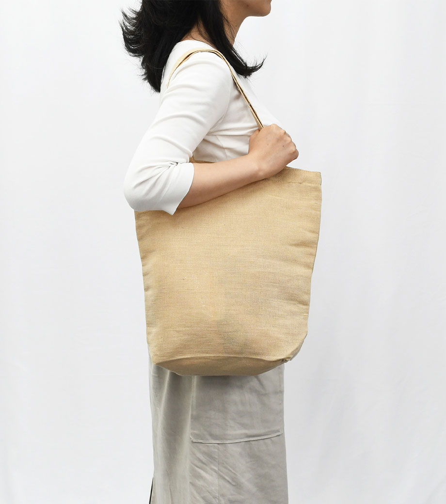 ジュート&コットンA4トートは、ジュートとコットンのミックス素材でできたマチなしフラットトートです。ジュート100%のものよりも柔らか。丈夫で、ジュート特有のザラつく質感をほどよく感じるバッグです。