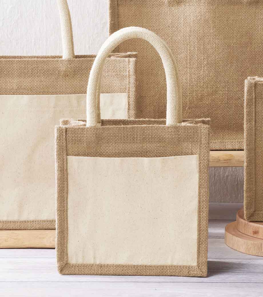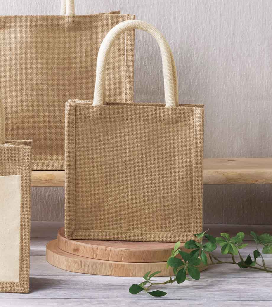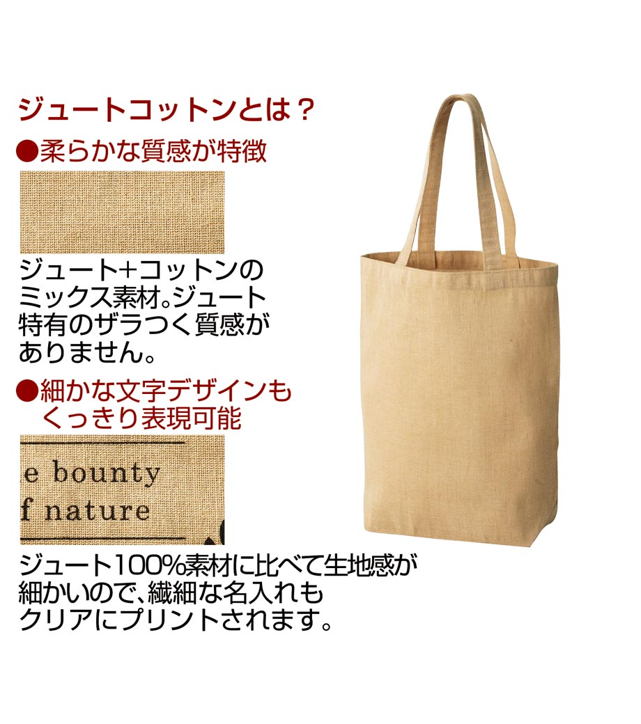 ジュートは、麻の一種の天然素材。通気性に優れ、伸びにくく、熱にも強い丈夫な繊維です。特別な記念日の限定ノベルティなど、オリジナルの名入れで個性的なバッグを作りませんか。