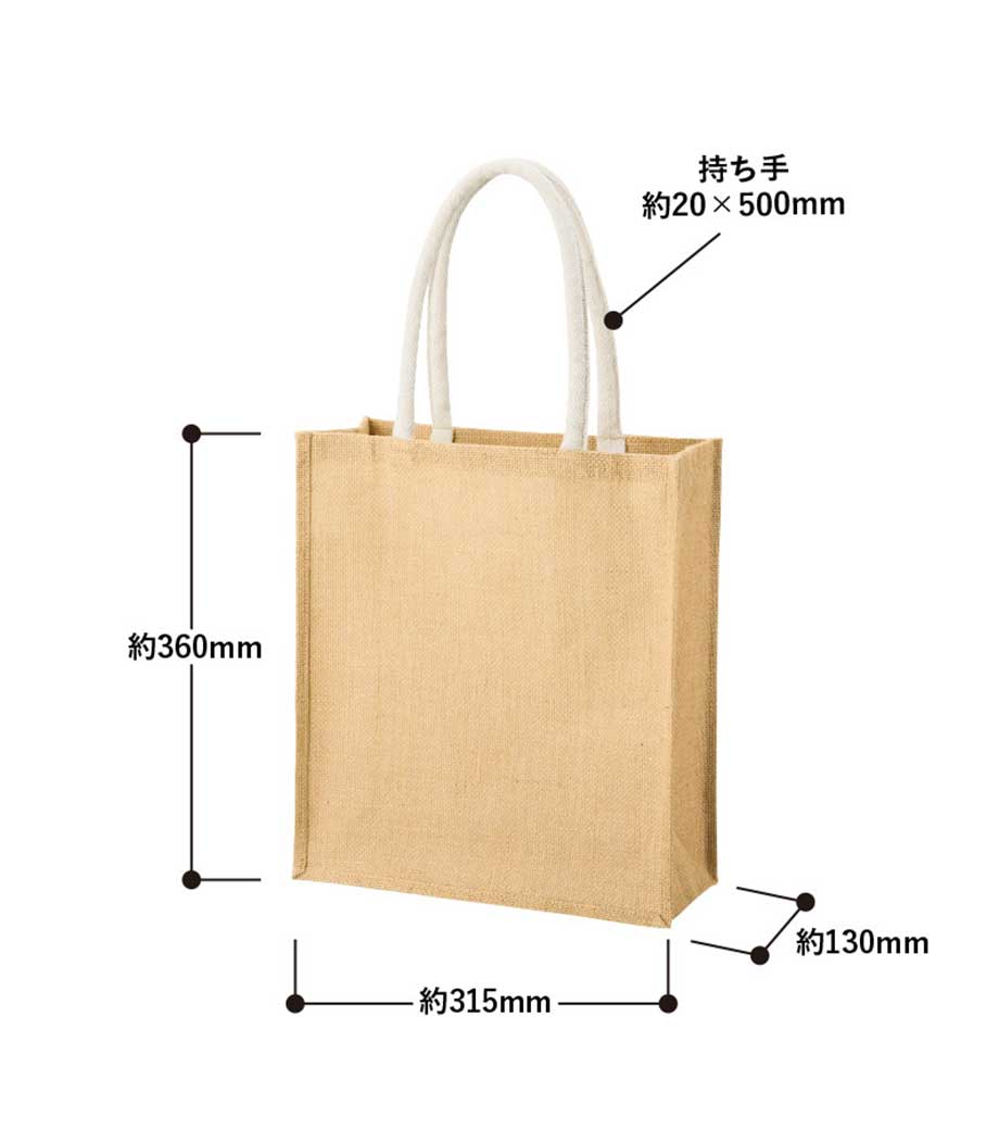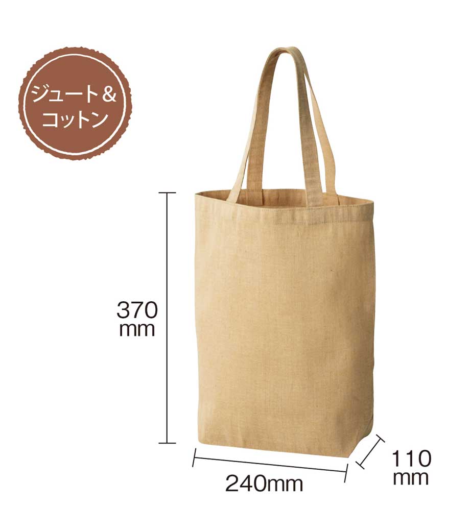 大人気のジュートシリーズに、A4サイズ対応のトートバッグが登場!500mlペットボトルもすっきり収納できる使い勝手の良い大きさ。肩掛けできるハンドルで、お出かけやエコバッグにぴったり。結婚式の引き出物入れとしても定番のシリーズです。