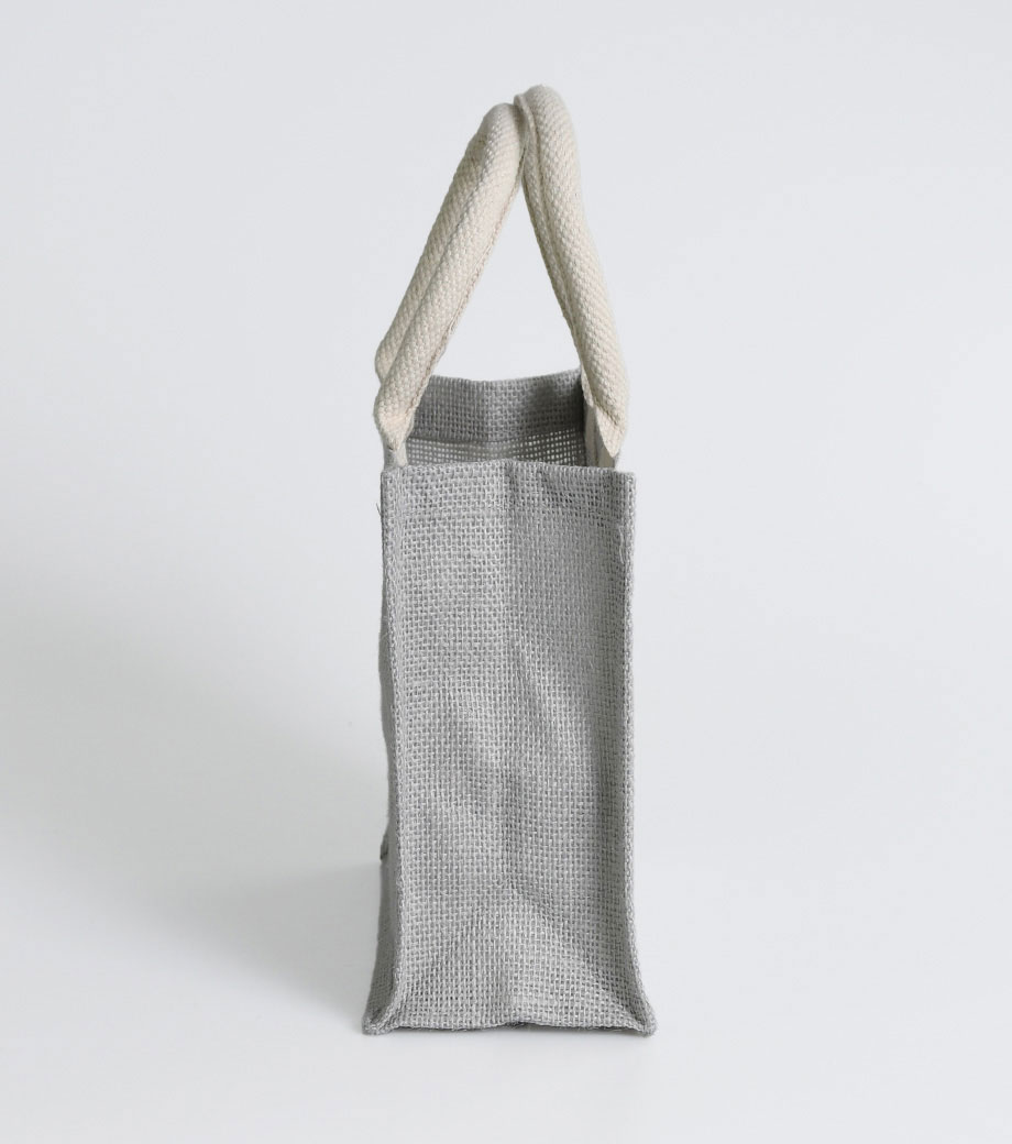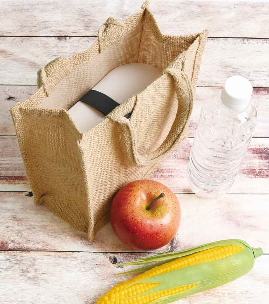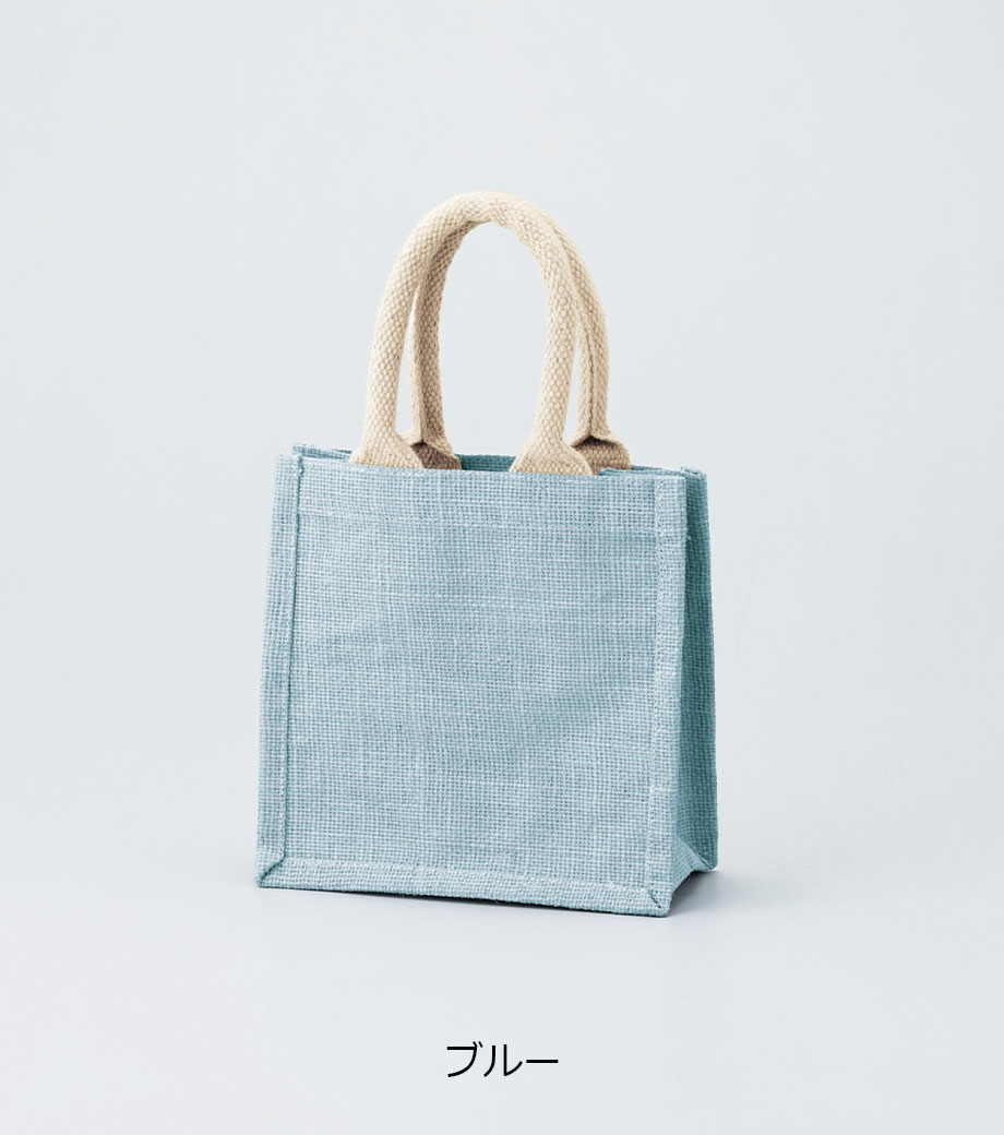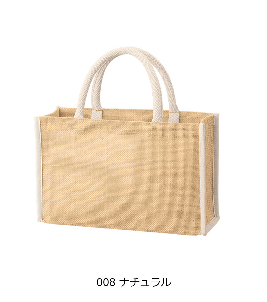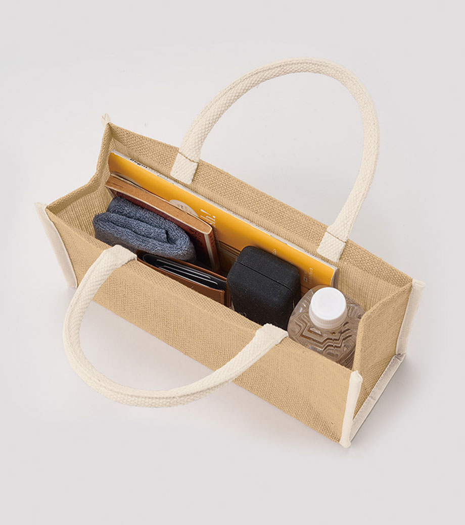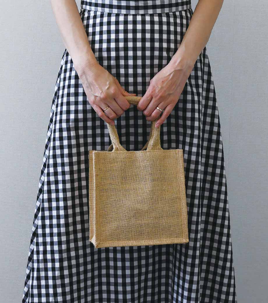 スクエア型で自立するシンプルなデザインのジュートバッグ。ざっくりとした天然素材ジュートは耐久性の高さも魅力のひとつです。クッション性のある持ち手と、しっかりとした縫製で重たい物を入れても安心。文庫本がすっぽりと入るサイズ感です。ちょっとしたお買い物やランチタイム用のミニバッグに。小物やお菓子を入れてギフトバッグにも最適です。