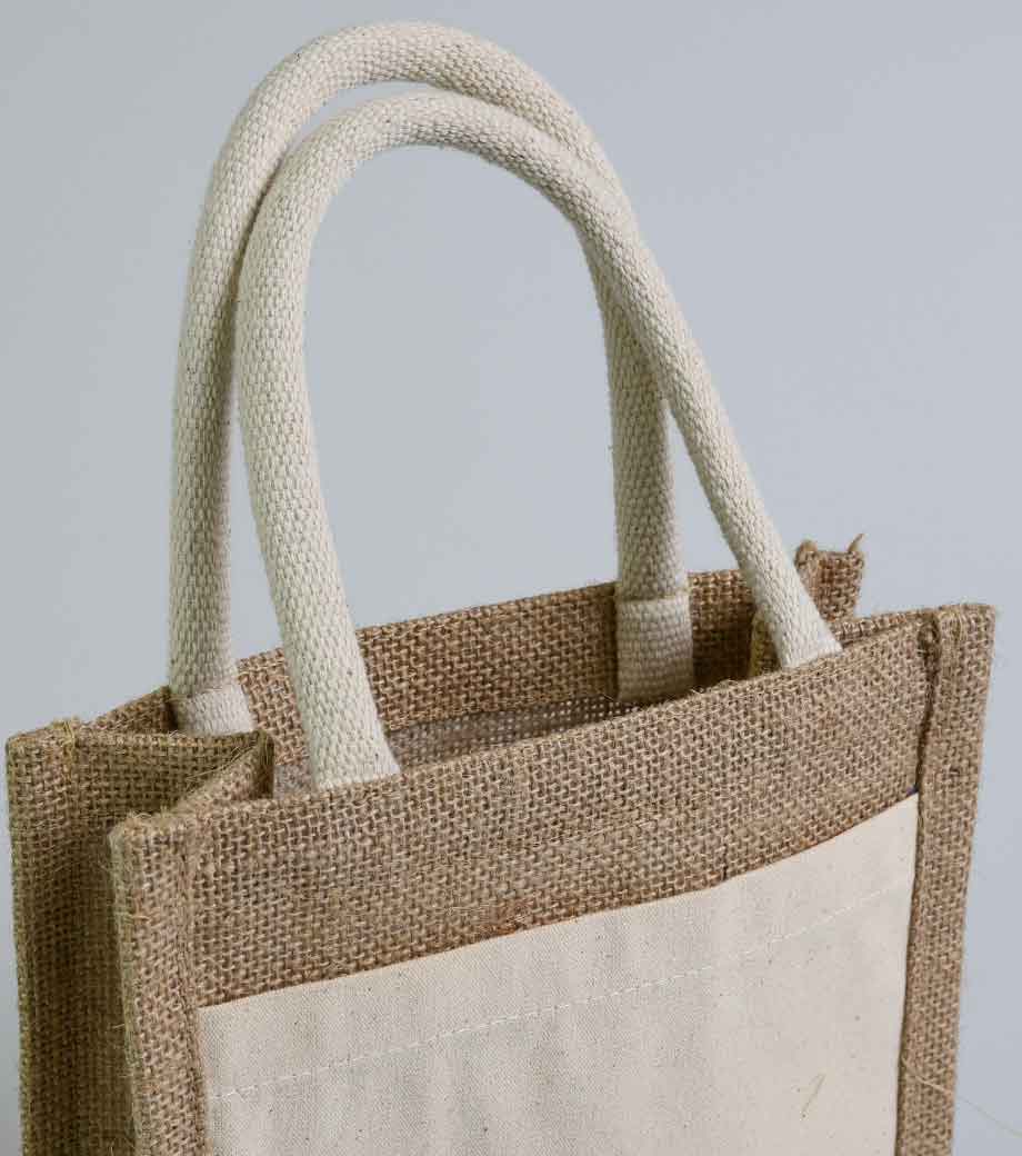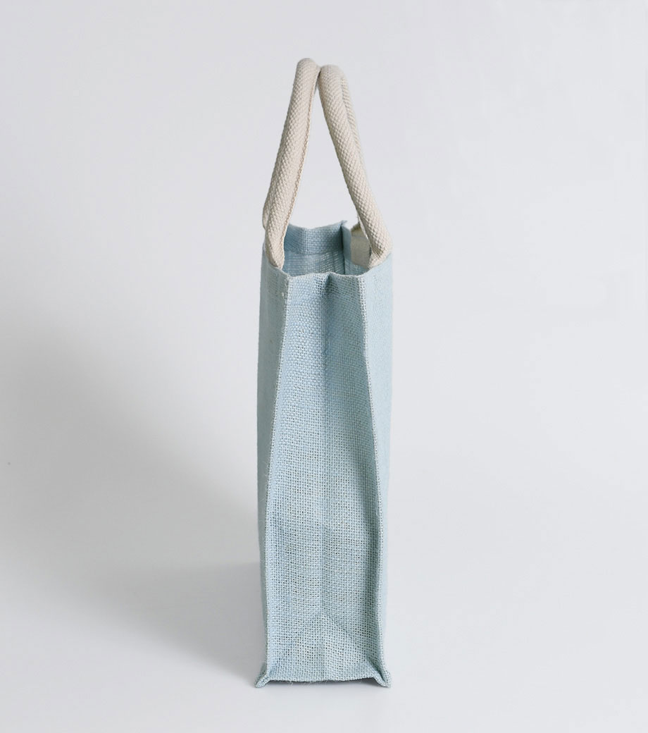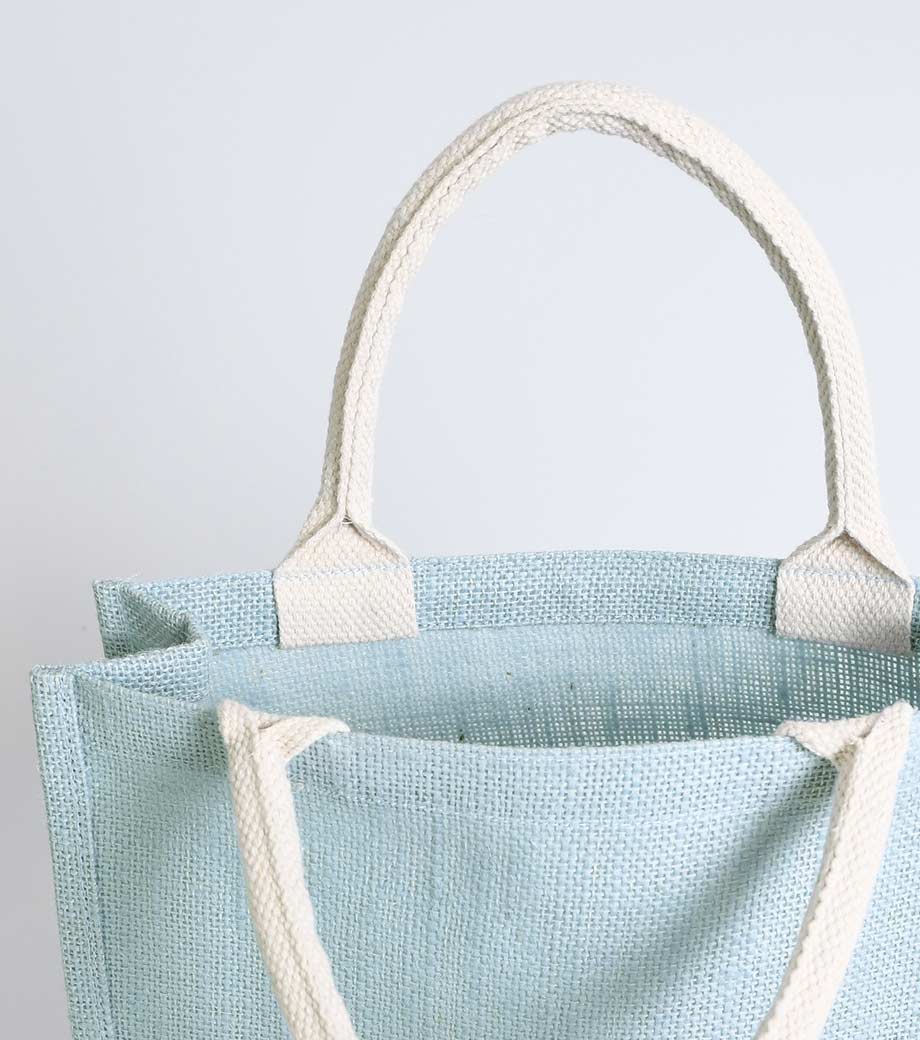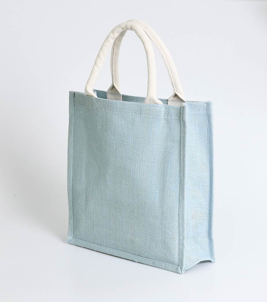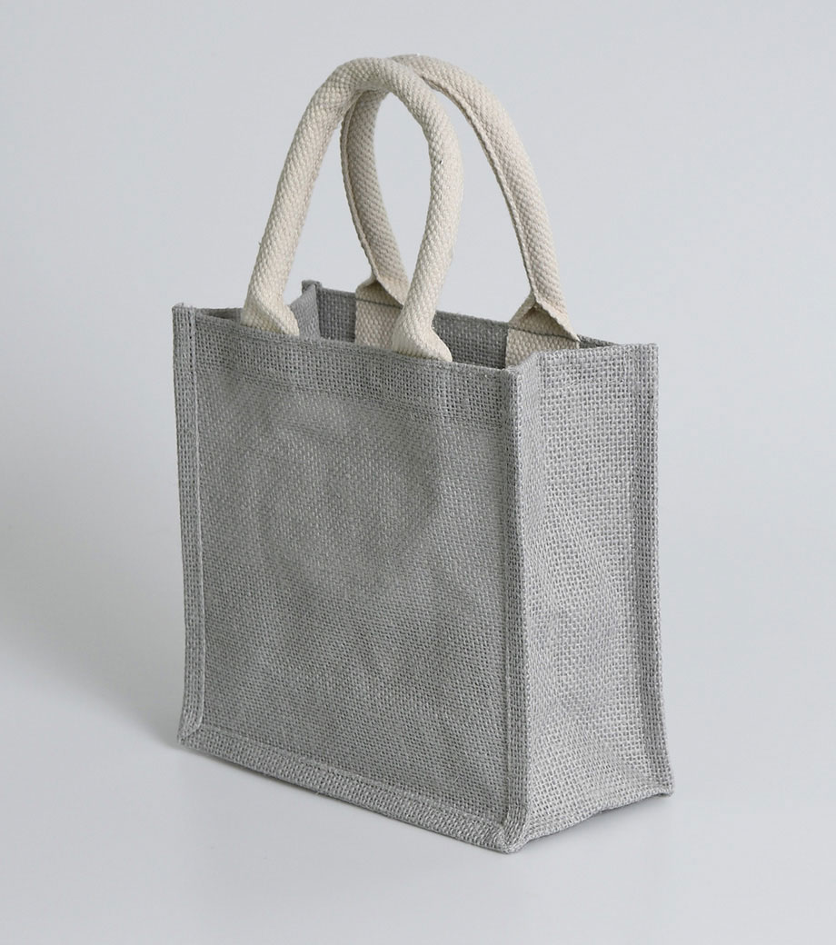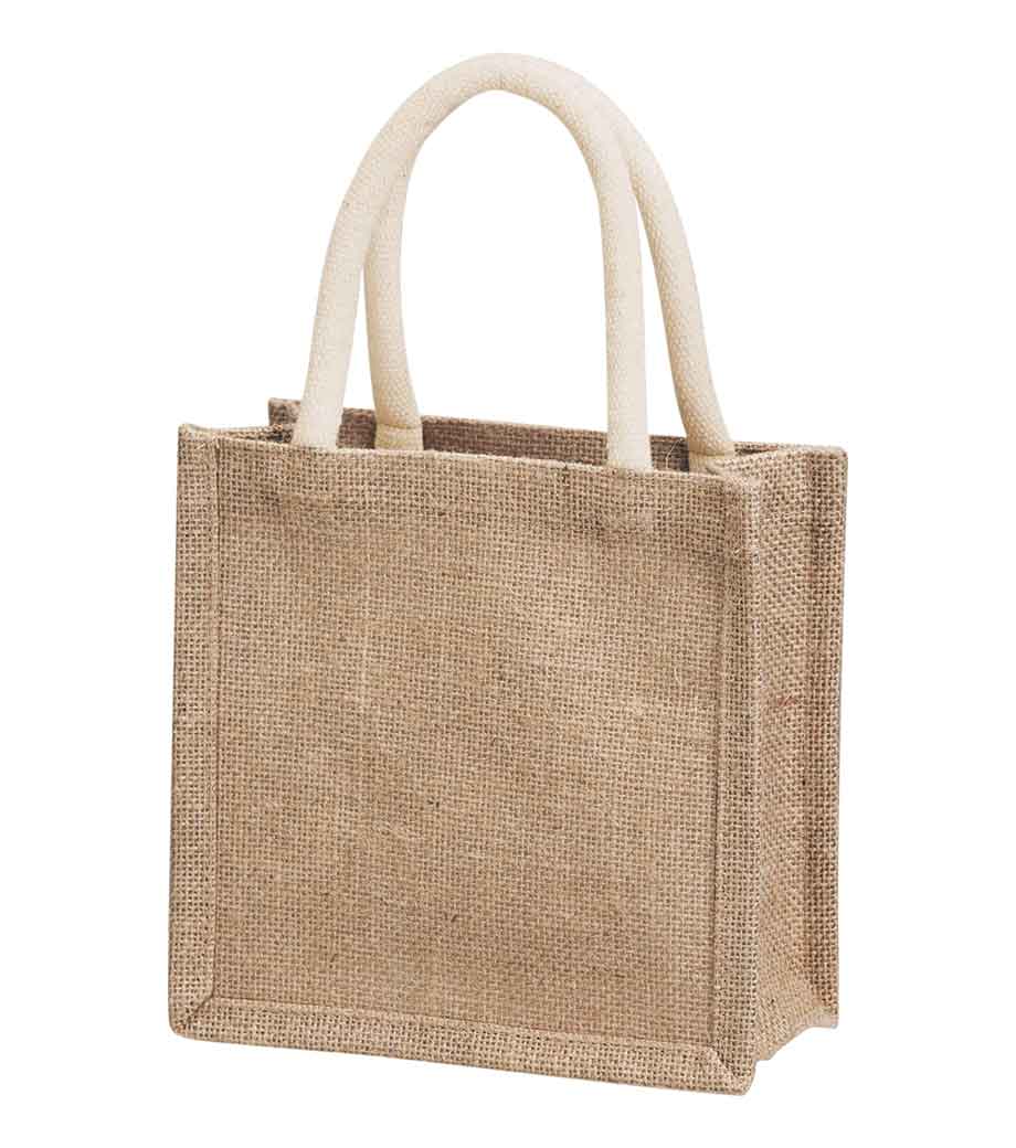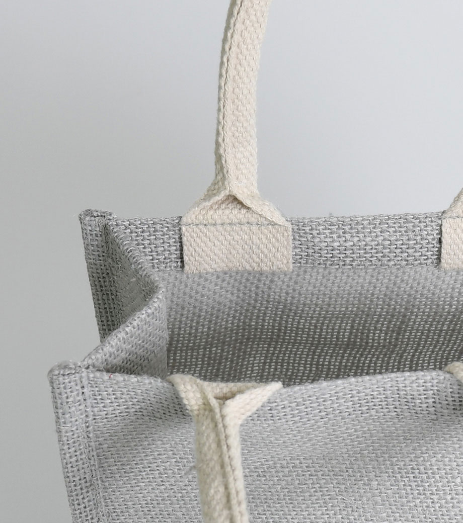 スクエア型で自立するシンプルなデザインのジュートバッグ。ざっくりとした天然素材ジュートは耐久性の高さも魅力のひとつです。クッション性のある持ち手と、しっかりとした縫製で重たい物を入れても安心。文庫本がすっぽりと入るサイズ感です。ちょっとしたお買い物やランチタイム用のミニバッグに。小物やお菓子を入れてギフトバッグにも最適です。