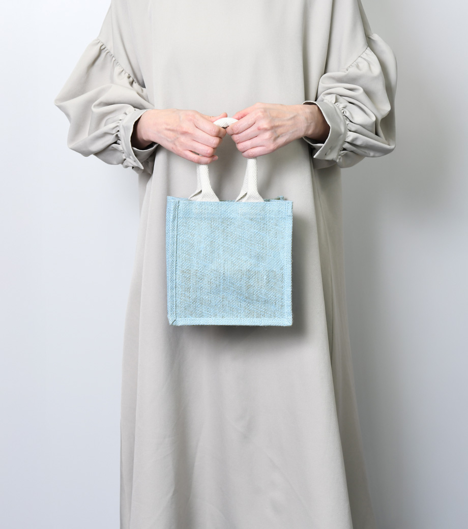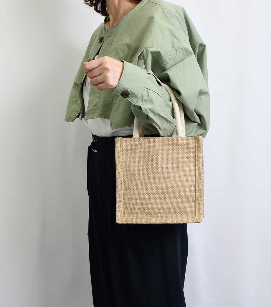 ジュートスクエアトート(S)は、ジュートのナチュラルな風合いが楽しめる流行のトートバッグ。ちょっとしたお出かけや、ランチバッグにぴったりなサイズです。