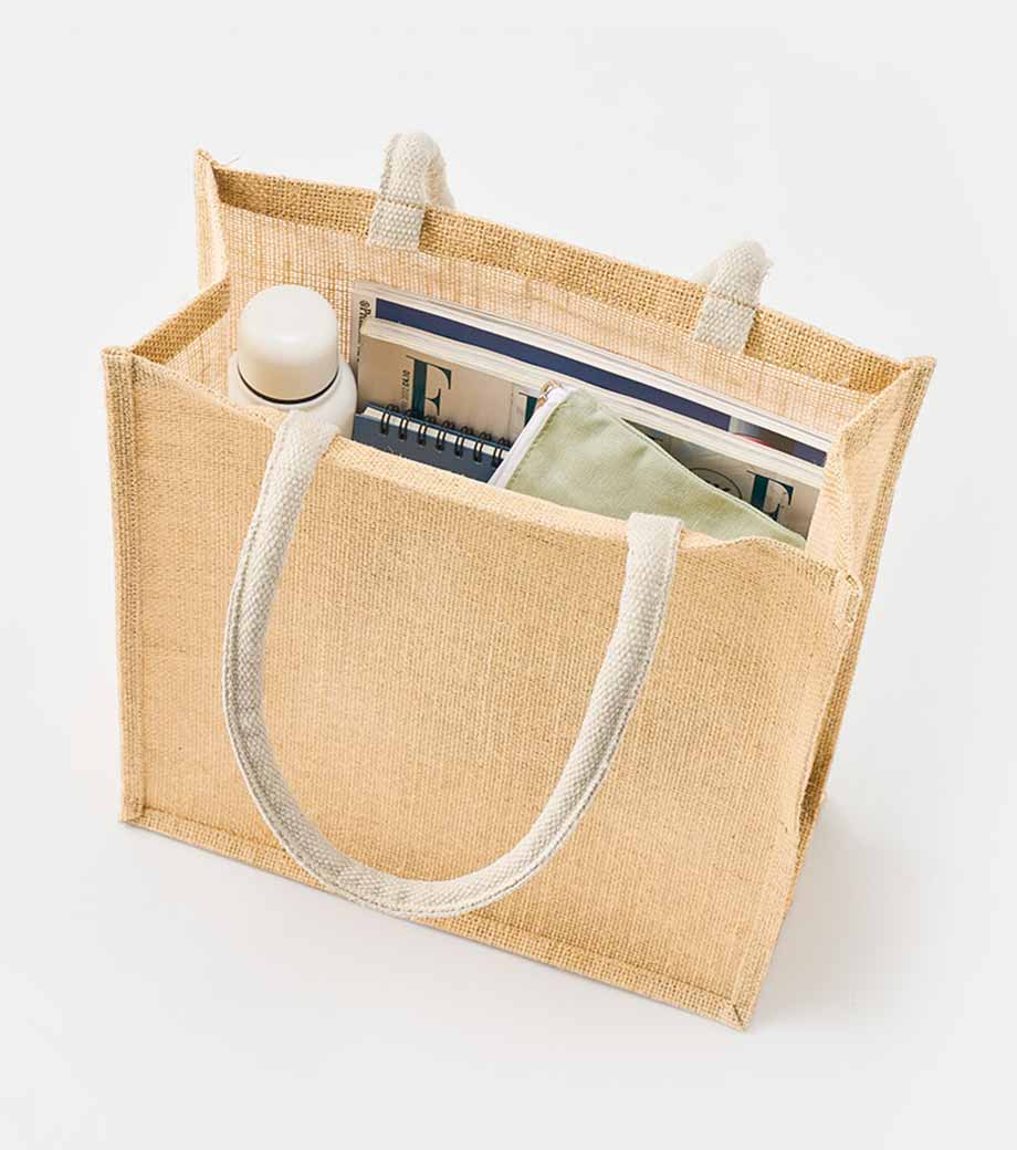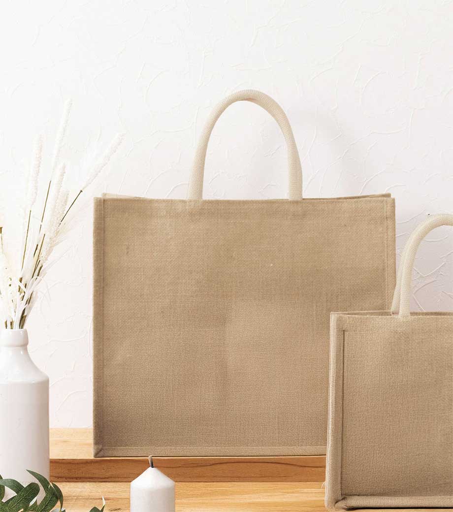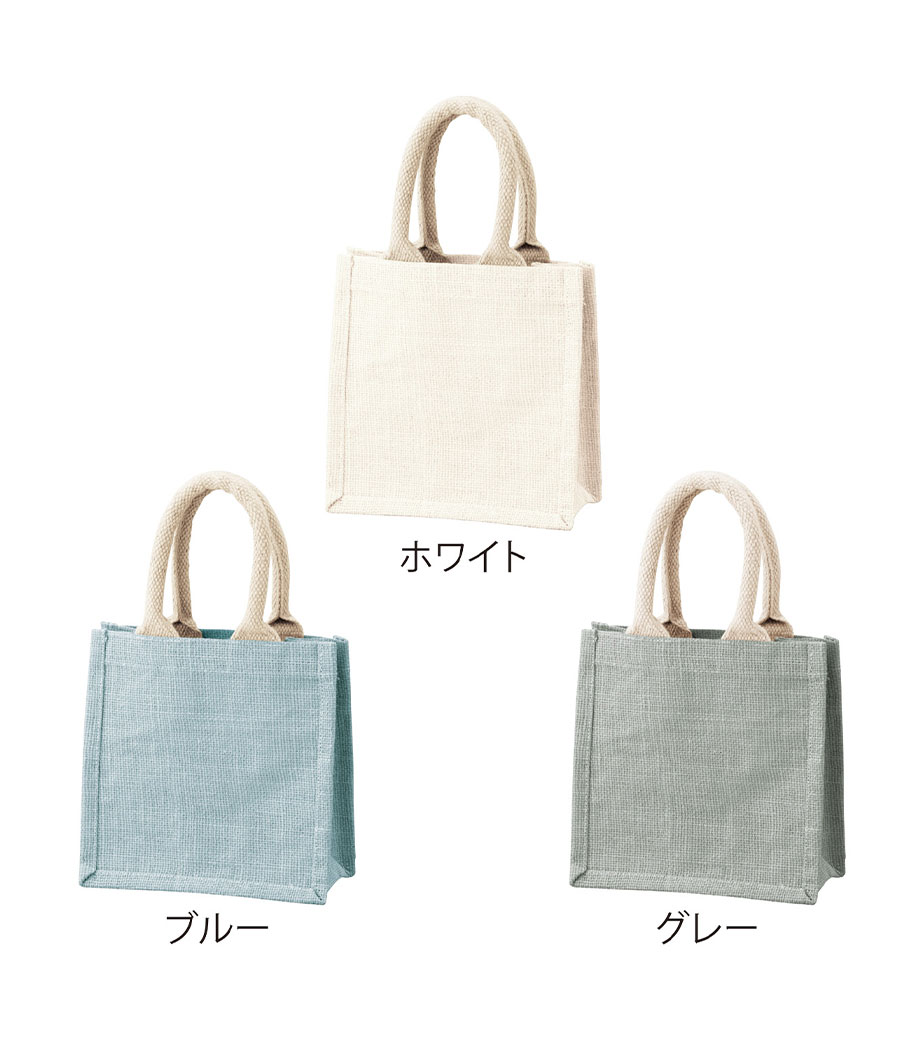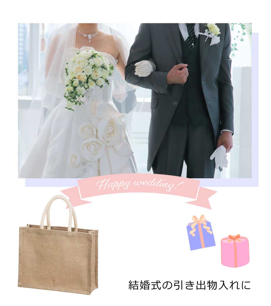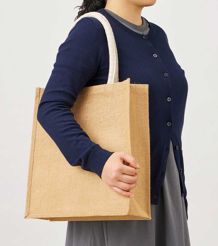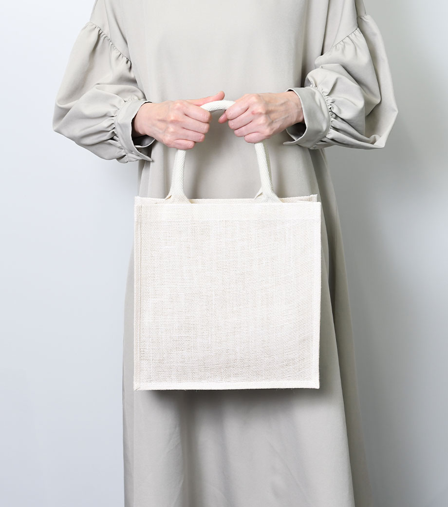 ジュートバッグは、ナチュラルな風合いが楽しめるトートバッグ。四角い底マチで箱もそのまま入るので、贈り物や引き出物などのお渡し用に人気です。ざくっとした素朴な素材感は、カジュアルでおしゃれ。普段使いのバッグとしても持ち歩けます。