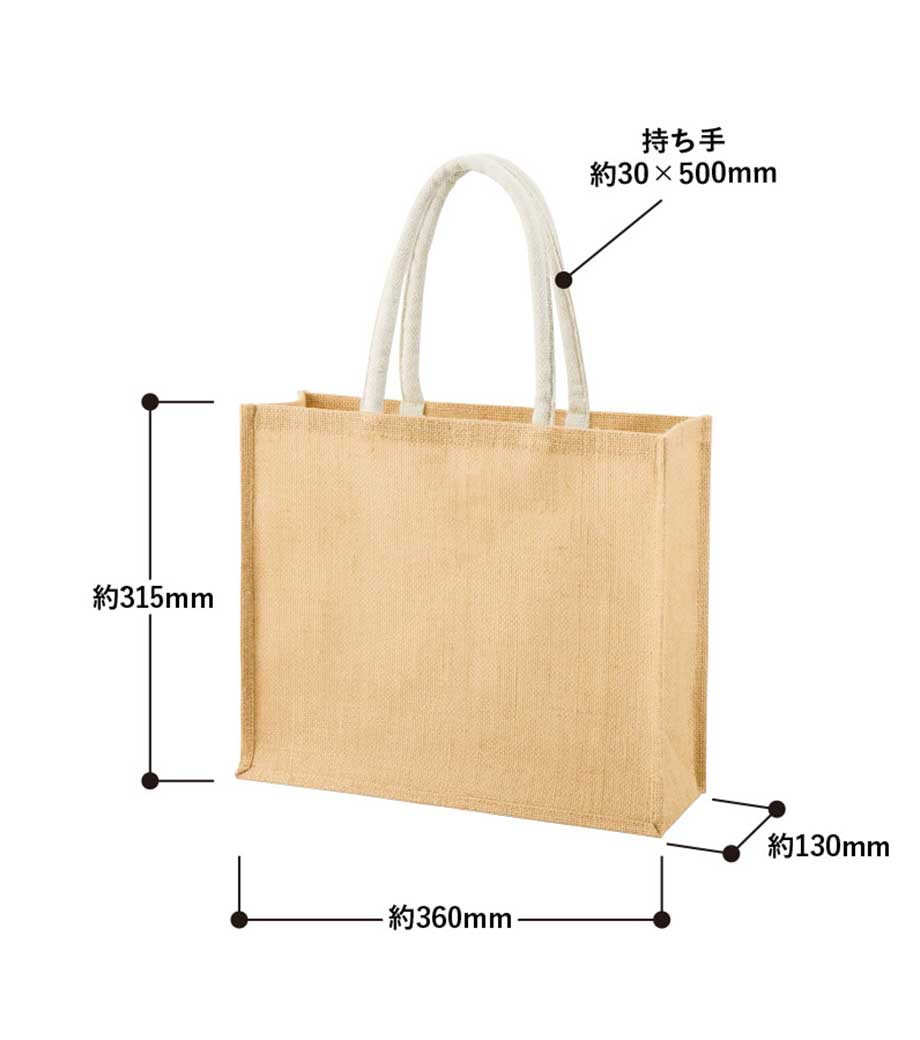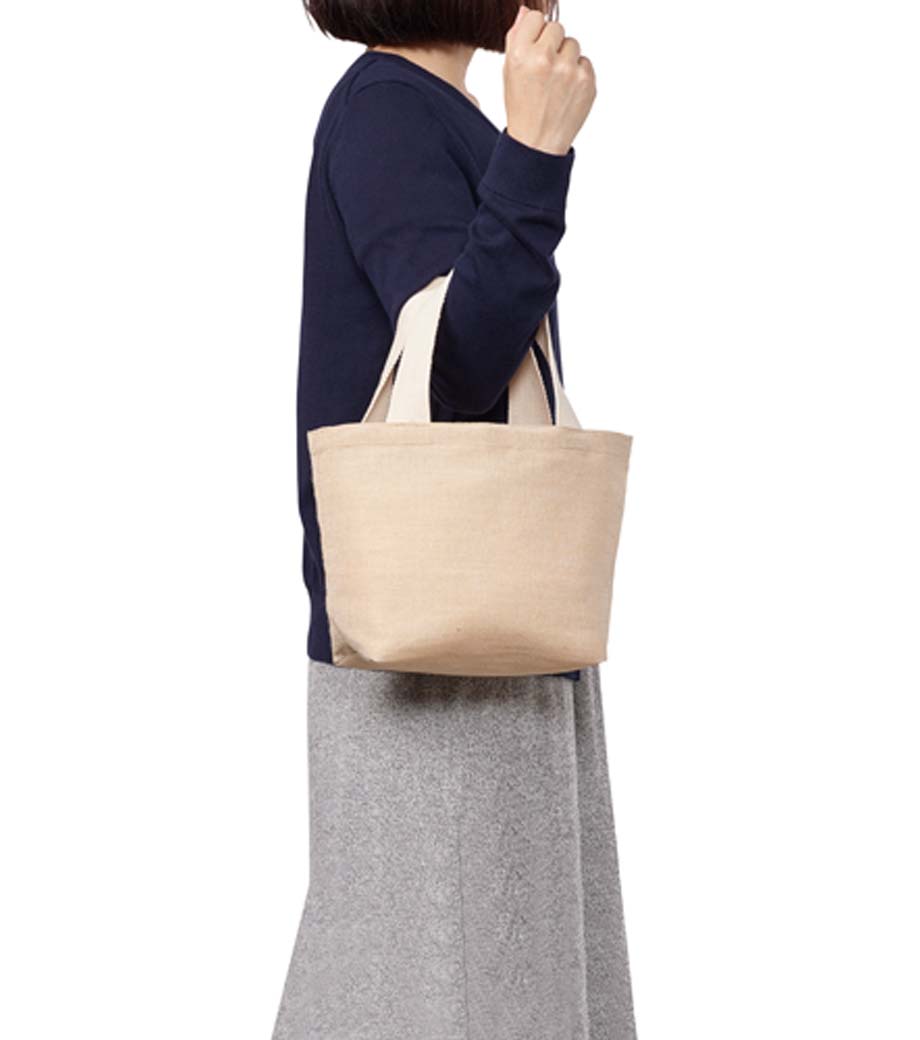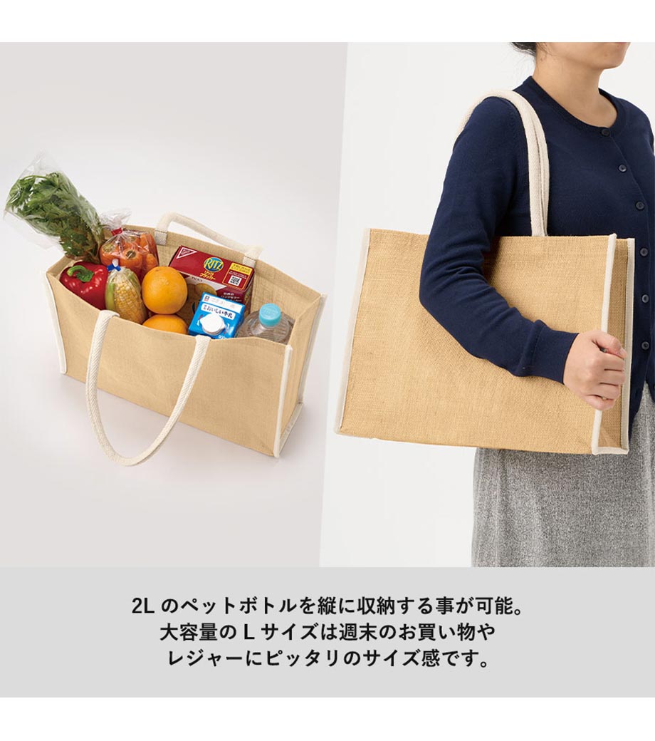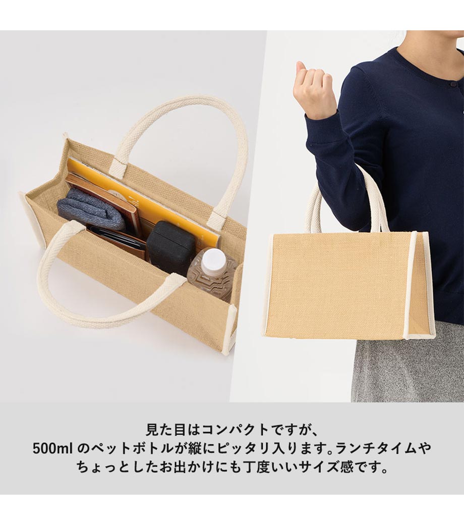 A4サイズが横向きでキレイに収まる大きさのジュートトートバッグ。500mlのペットボトルもすっきり収まるサイズ感で、お出かけだけでなく買い出しにも活躍します。肩掛けできる持ち手で、重い荷物の時も安心。