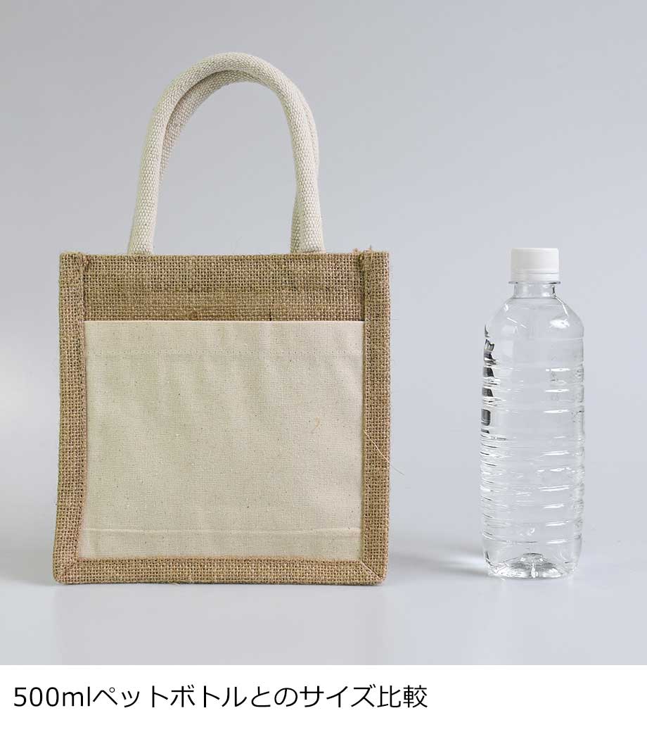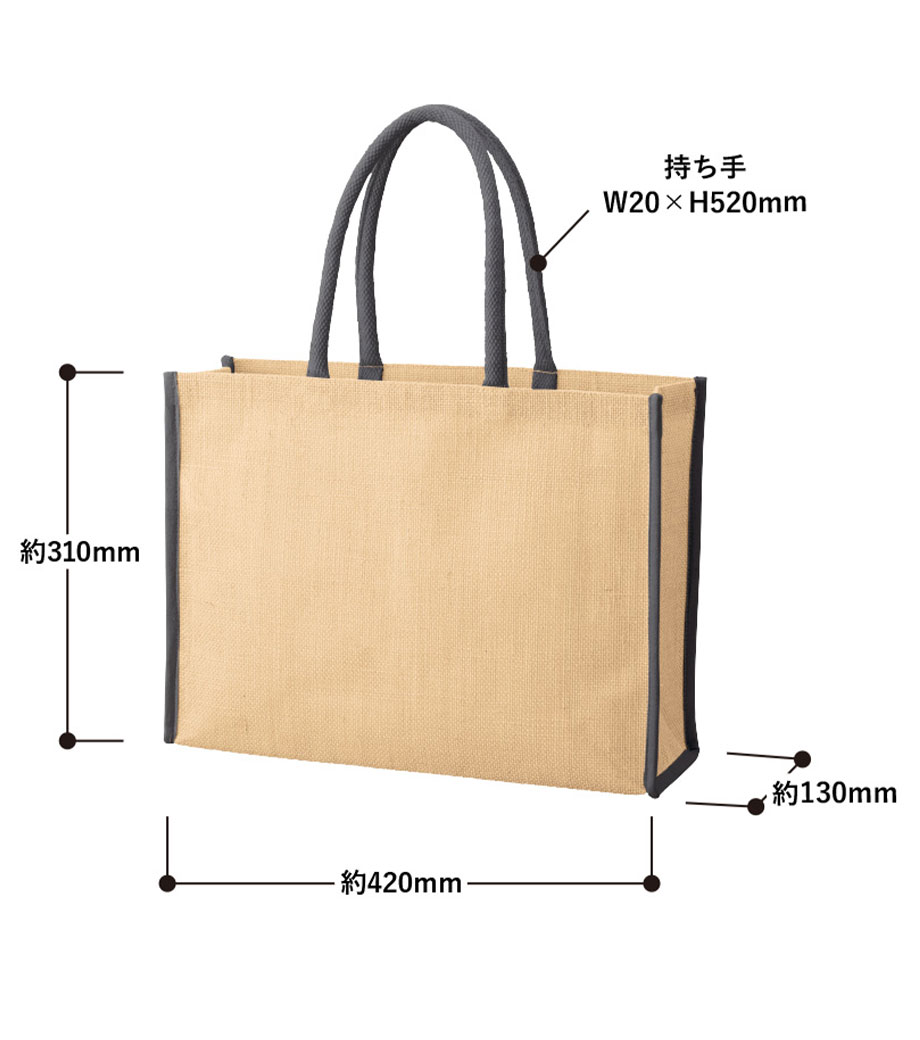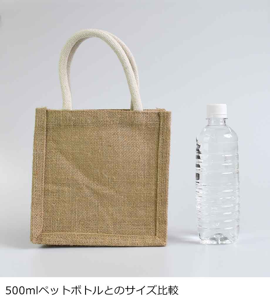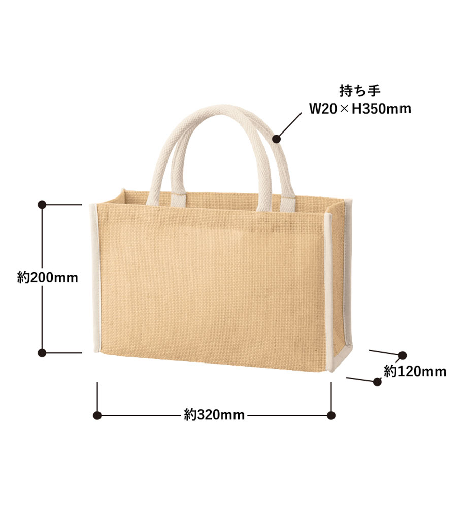 A4サイズが横向きでキレイに収まる大きさのジュートトートバッグ。500mlのペットボトルもすっきり収まるサイズ感で、お出かけだけでなく買い出しにも活躍します。肩掛けできる持ち手で、重い荷物の時も安心。