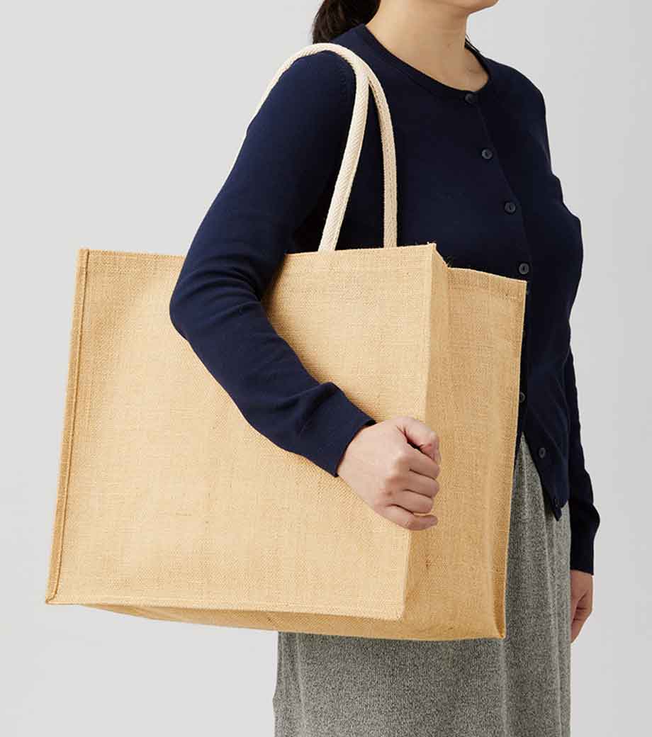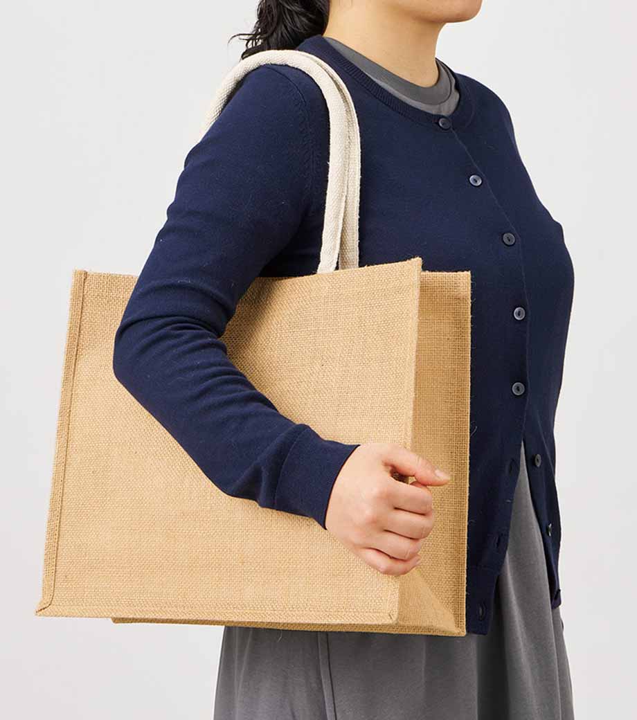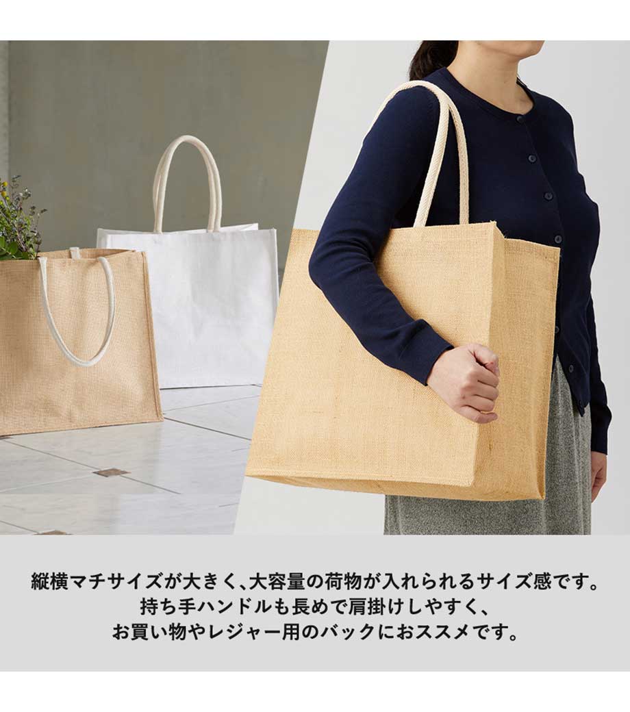 ジュート&コットンビッグトート(マチ付)は、ジュートとコットンのミックス素材でできたトートバッグです。ジュート100%のものよりも柔らか。丈夫な素材でジュート特有のザラつく質感がありません。コットントートとは違うバッグを考えている方にオススメです。約110mmの大きめマチと、肩掛けもできる長めの持ち手で、荷物の多い日のサブバッグにも助かります。