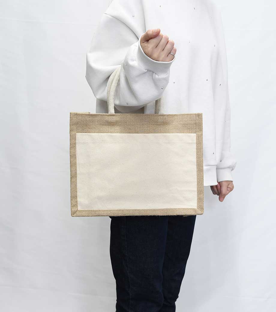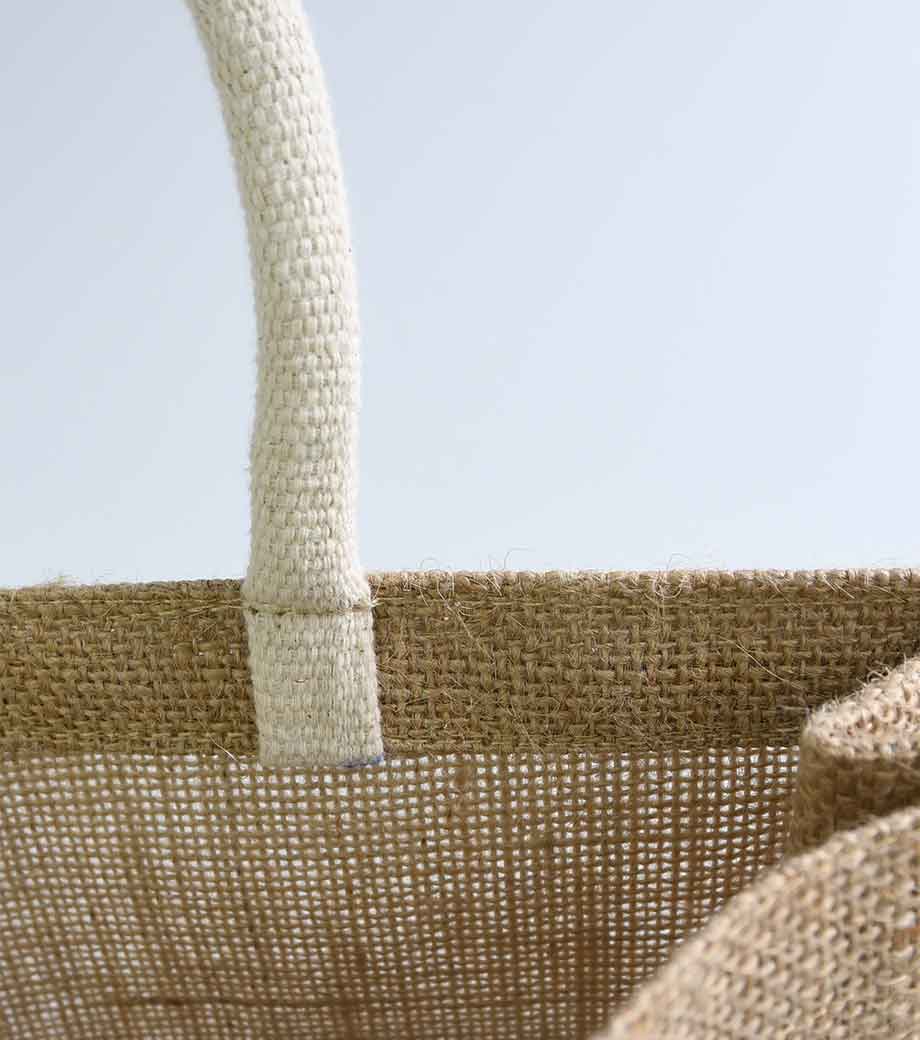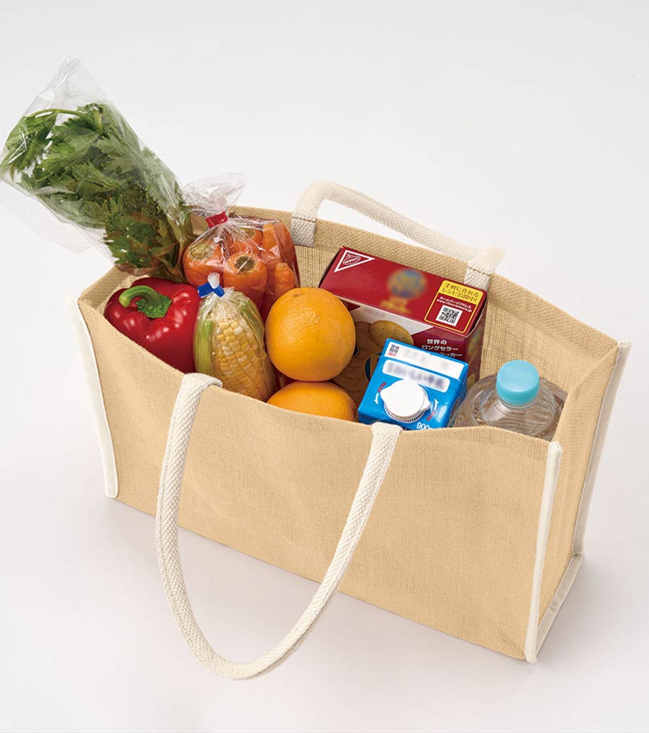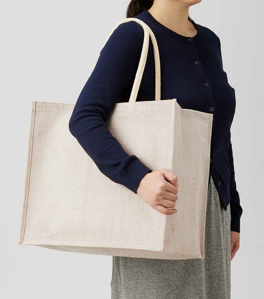 ジュート&コットンビッグトート(マチ付)は、ジュートとコットンのミックス素材でできたトートバッグです。ジュート100%のものよりも柔らか。丈夫な素材でジュート特有のザラつく質感がありません。コットントートとは違うバッグを考えている方にオススメです。約110mmの大きめマチと、肩掛けもできる長めの持ち手で、荷物の多い日のサブバッグにも助かります。