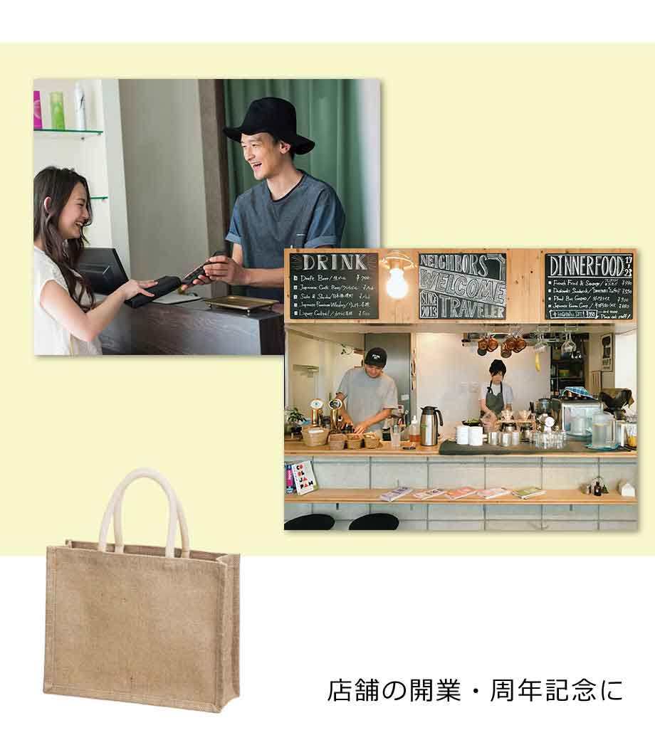 アパレルショップの周年記念や購入特典、食料品店の販促品など、幅広いシーンで人気のジュートバッグ。1色名入れ印刷で、天然素材の風合いを活かしたオリジナル感あふれるノベルティを作成してみませんか?