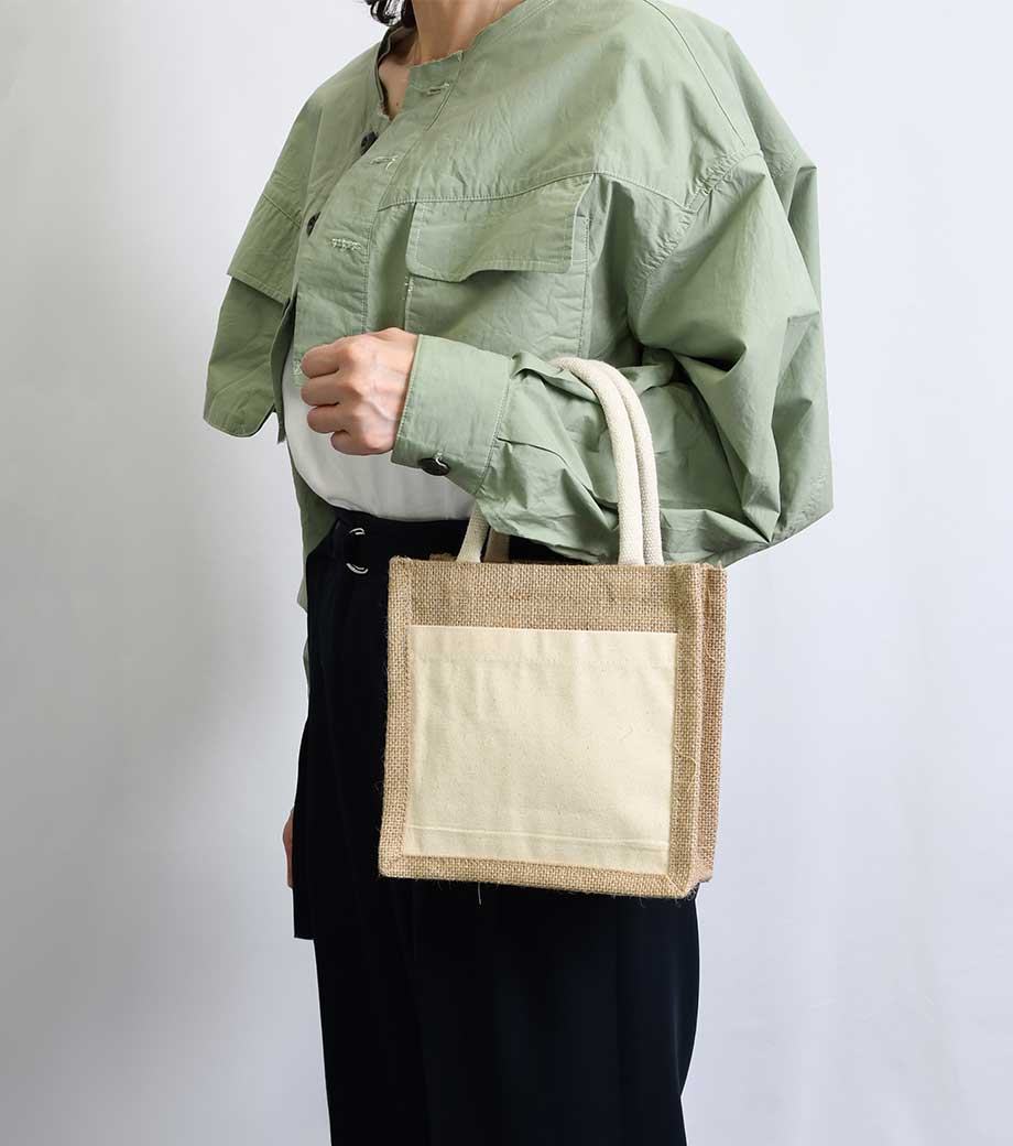 ジュート&キャンバスコンビトート(S)は天然の異素材を組み合わせたミニバッグ。キャンバスは10オンスでしっかりした生地感です。麻の一種で天然素材のジュートはざっくりとした素材感でお洒落!裏はコーティング加工しており、ほつれも防ぎ水濡れも安心です。