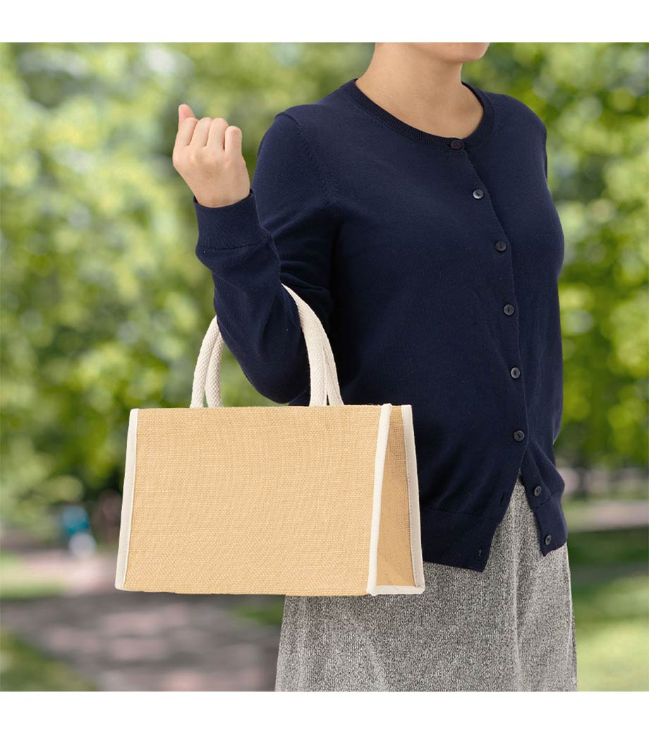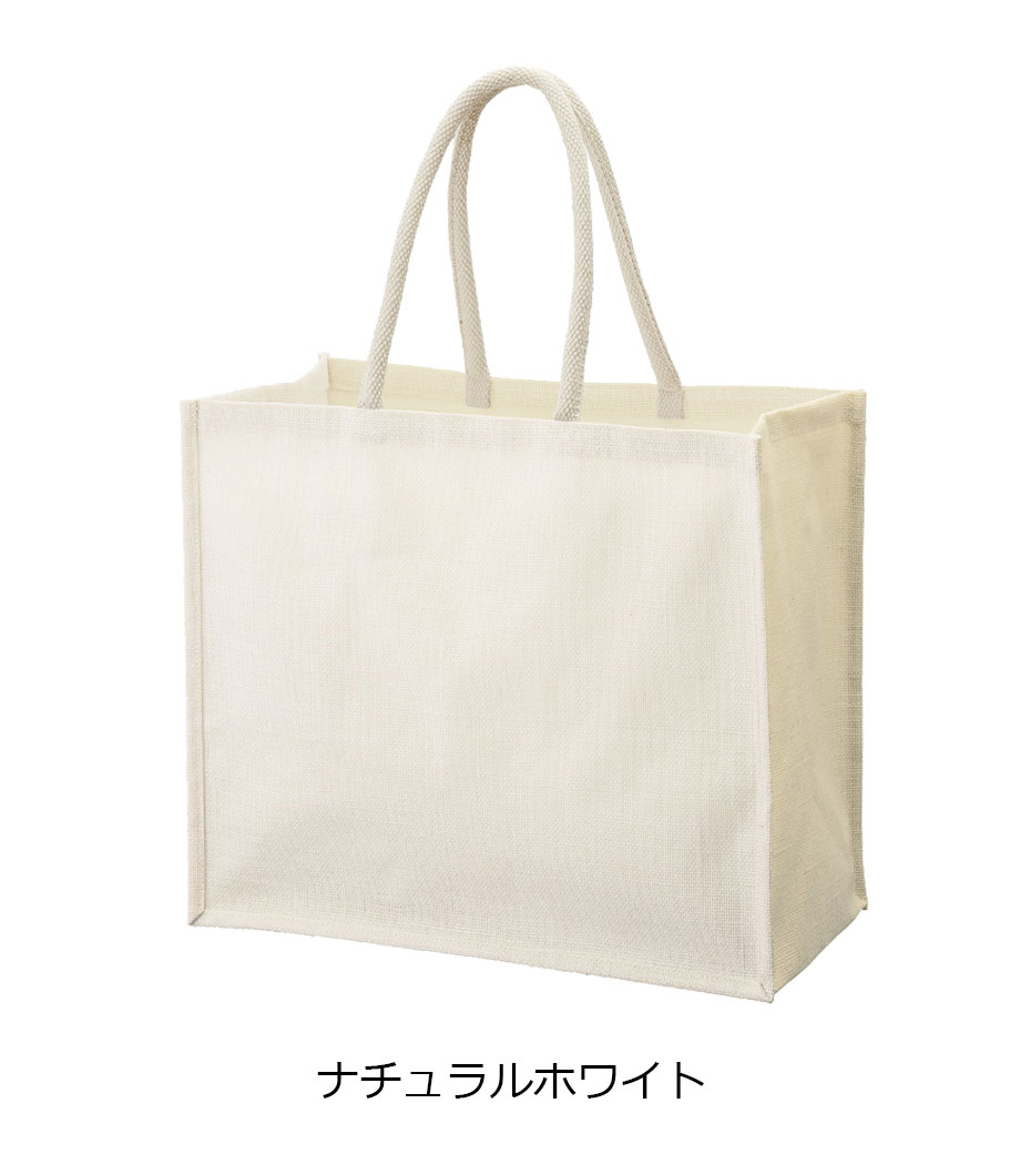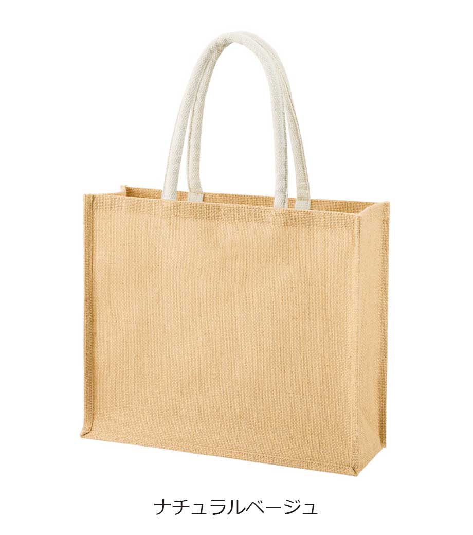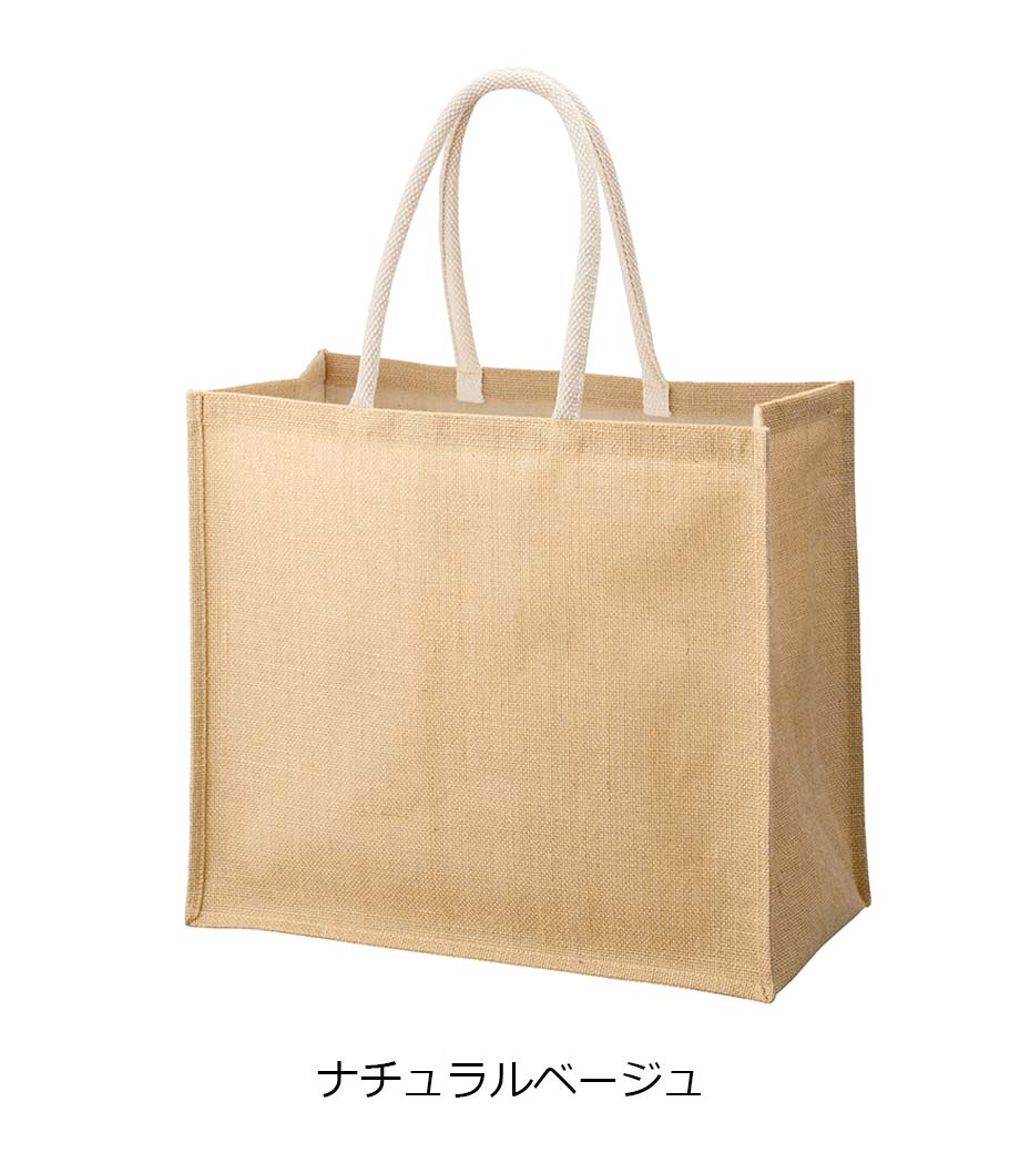 ジュートラージバッグは、ナチュラルな風合いが楽しめるトートバッグです。肩掛けできる四角い底マチ。箱もそのまま入るので、記念品などの贈り物や引き出物のお渡し用に。ざくっとした素朴な素材感がおしゃれな、普段使いもできるカジュアルバッグです。