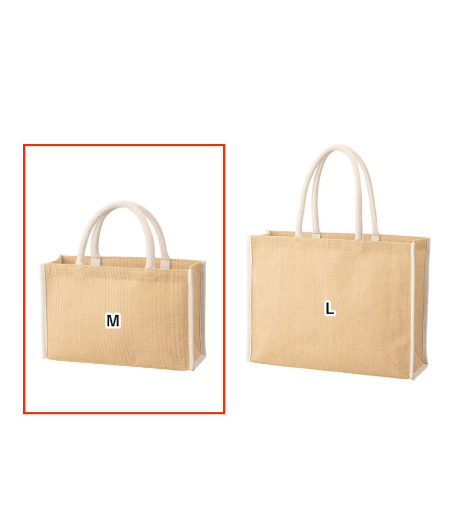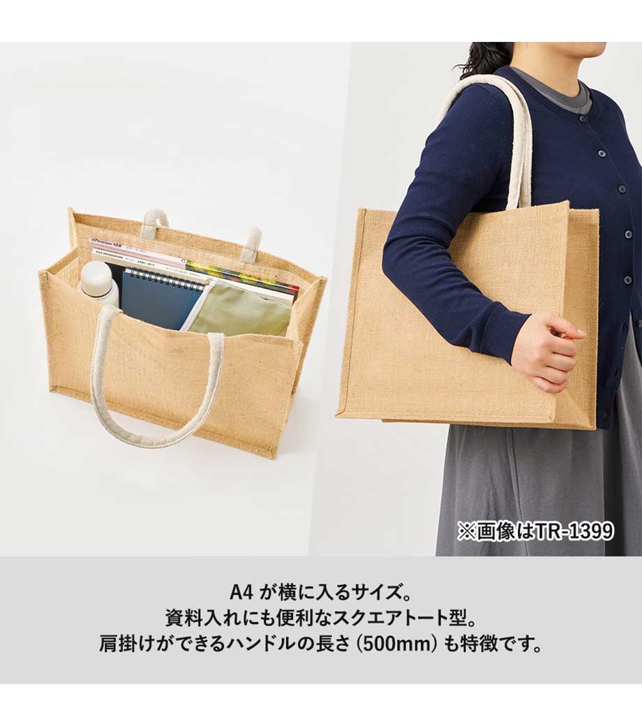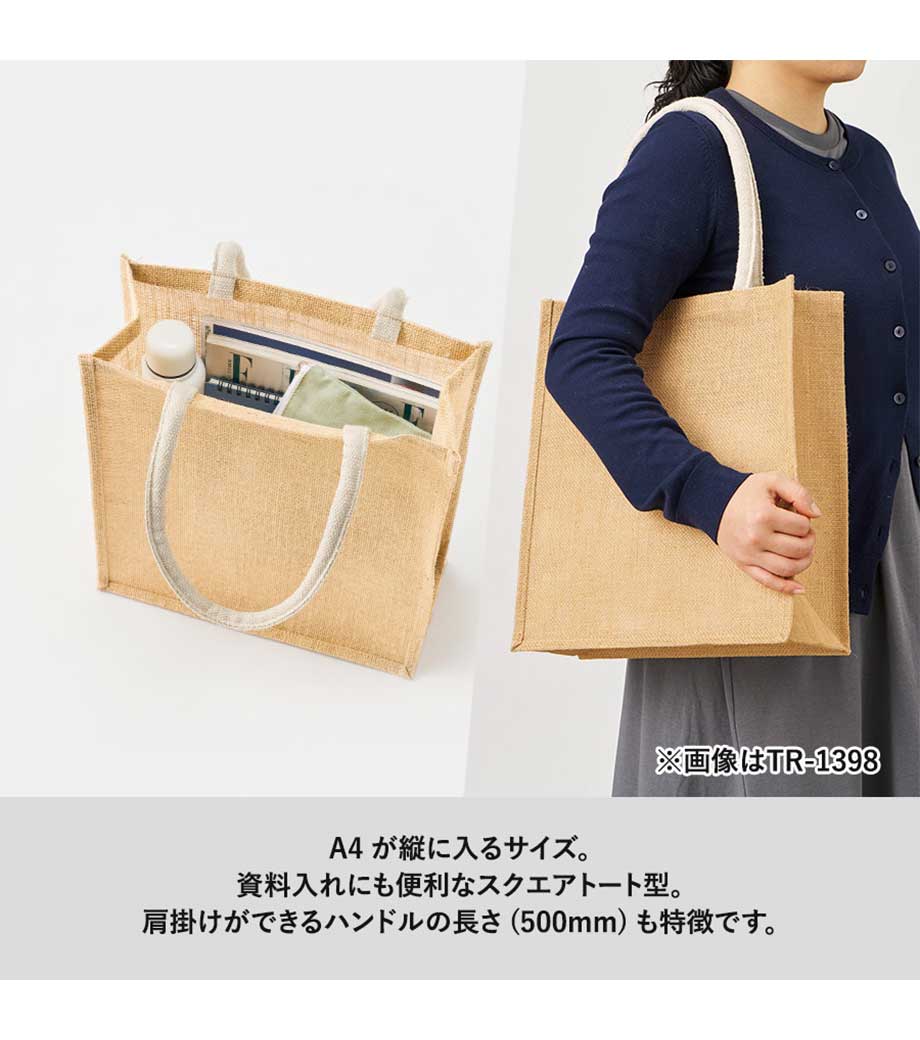 ジュートスクエアトート(M)は、ジュートのナチュラルな風合いが楽しめる流行のトートバッグ。サブバッグとしても使い勝手の良い、A4サイズが入る大きさです。