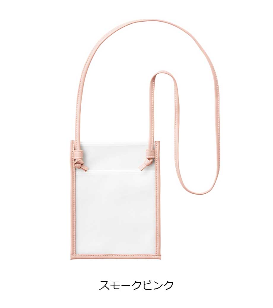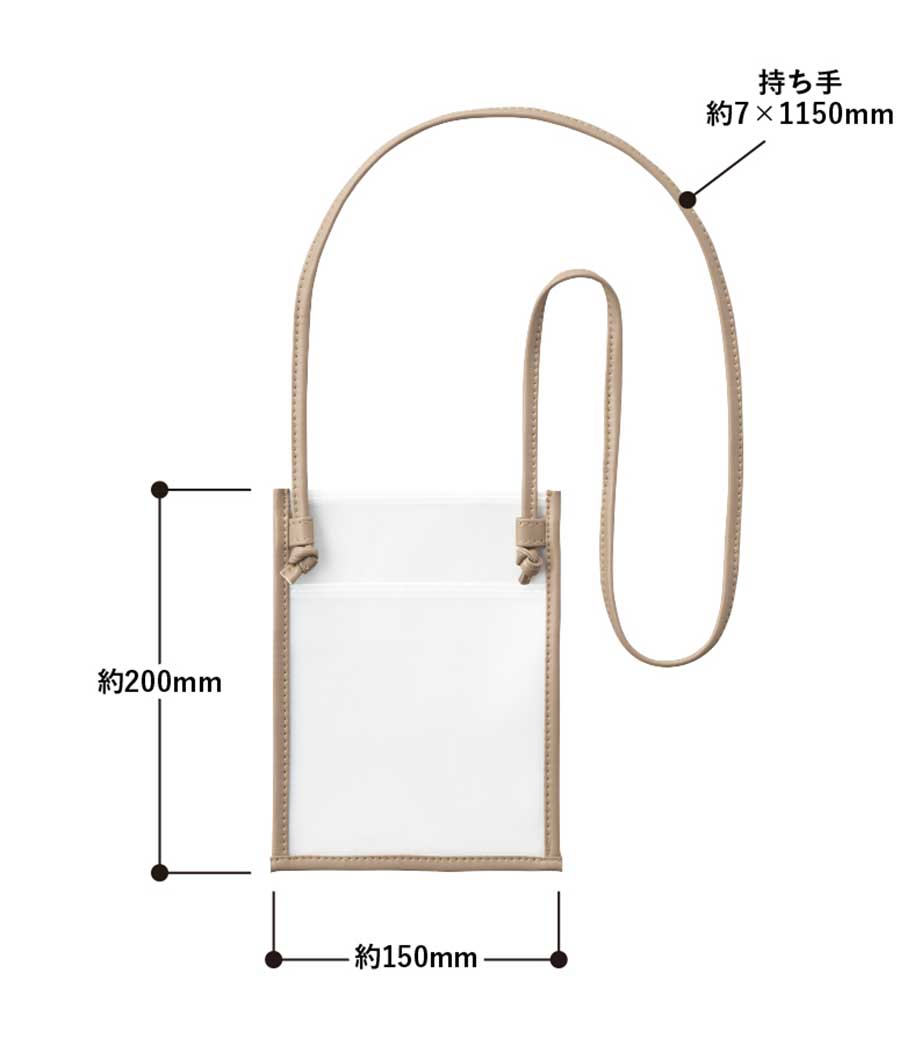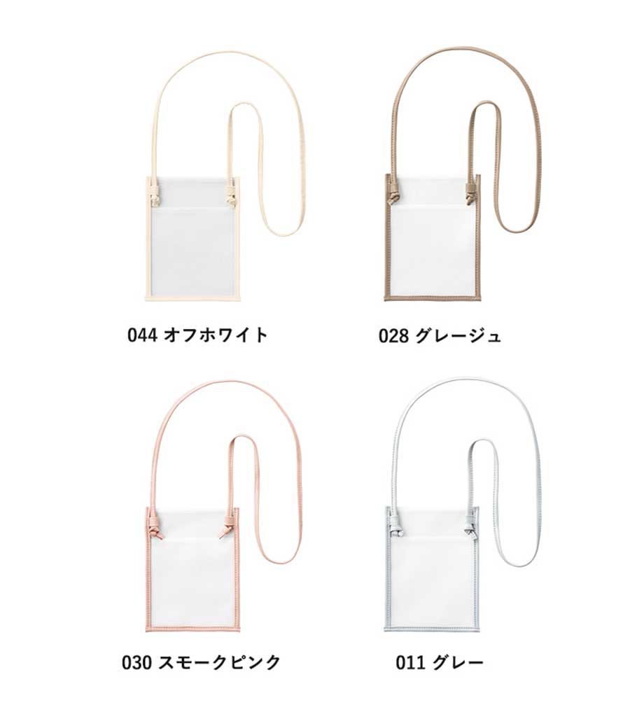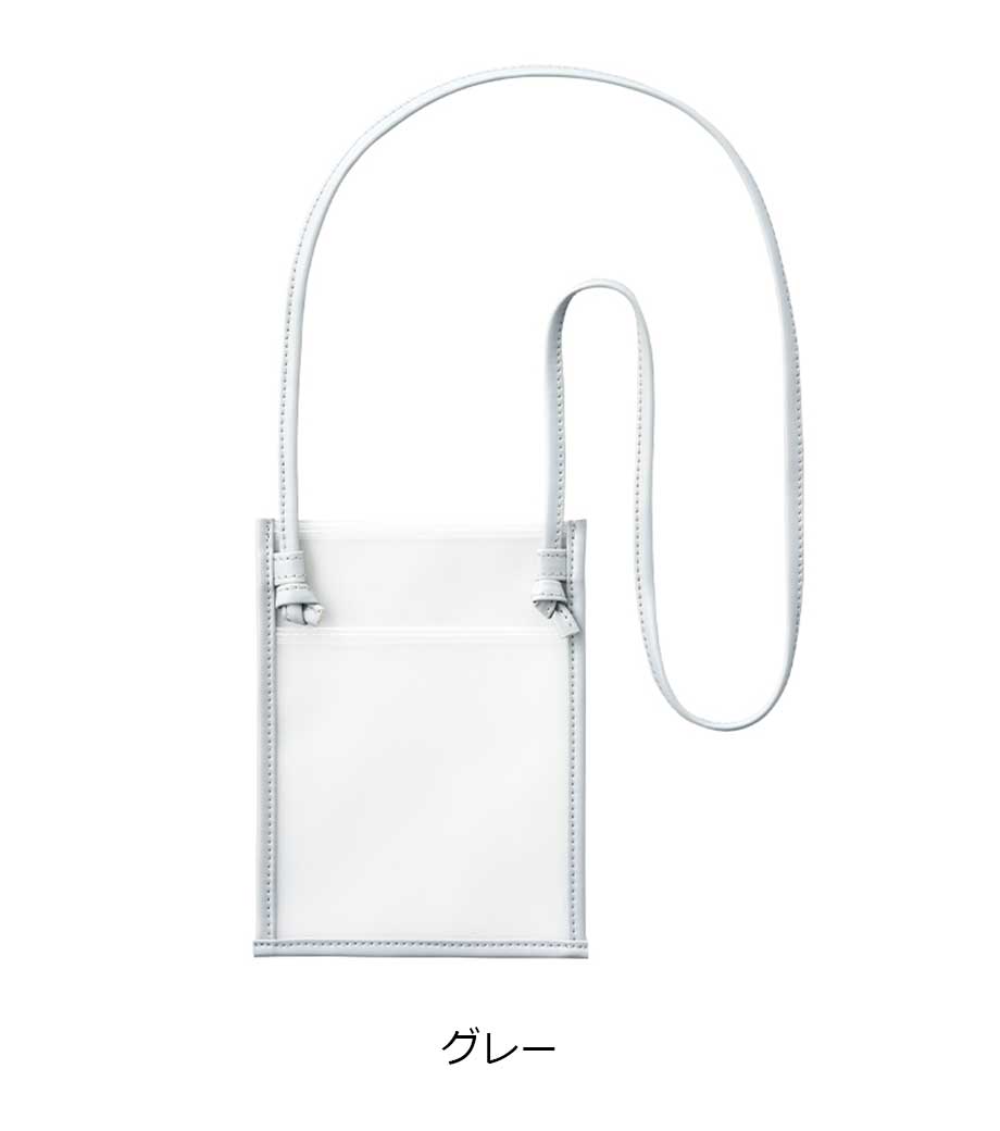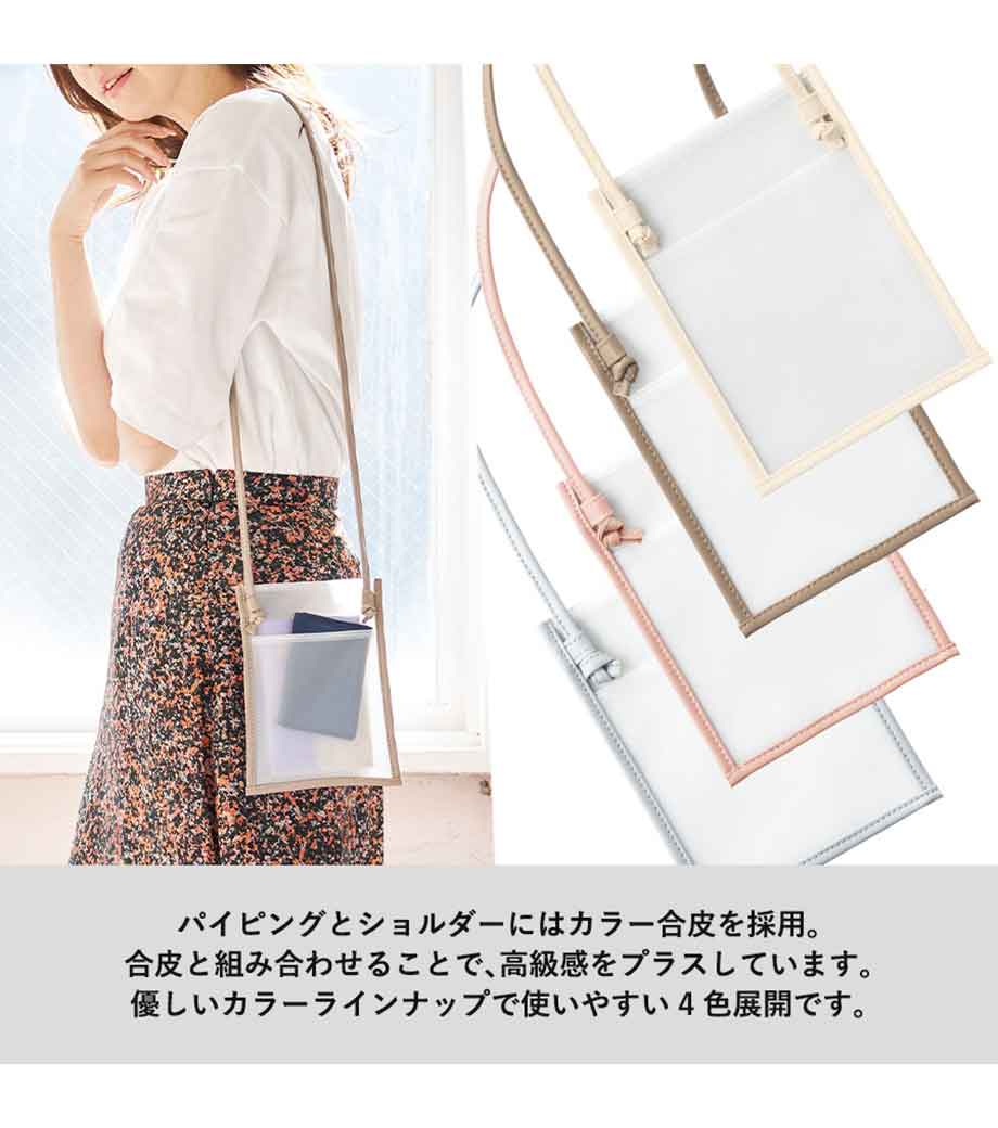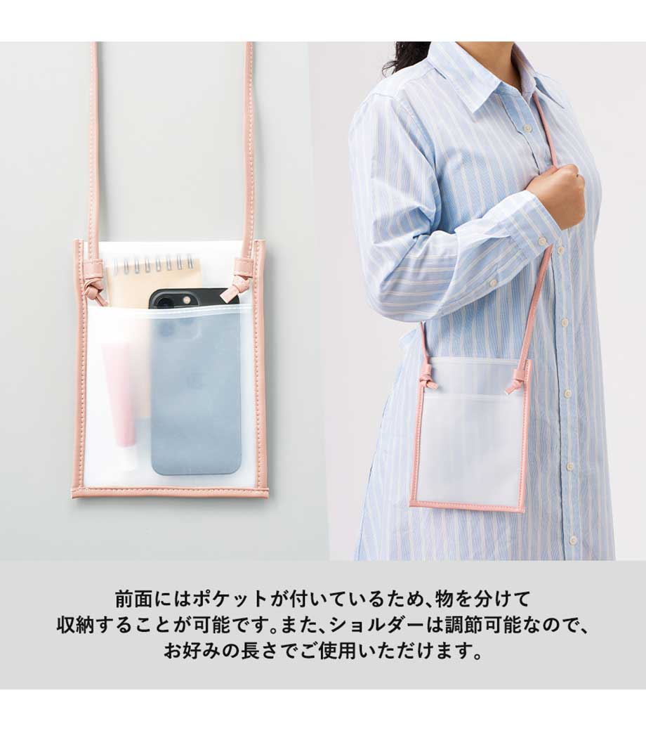 透け感のあるEVA素材にフェイクレザーを組み合わせた、高級感のあるデザインが人気のサコッシュ。水や紫外線に強いEVA素材。塩素を含んでいないため焼却してもダイオキシンが発生しない環境に優しい素材です。前面にポケットが付いており、スマホやハンカチなど小物を分けて収納することが可能。紐の長さは結び目の位置で調整できます。