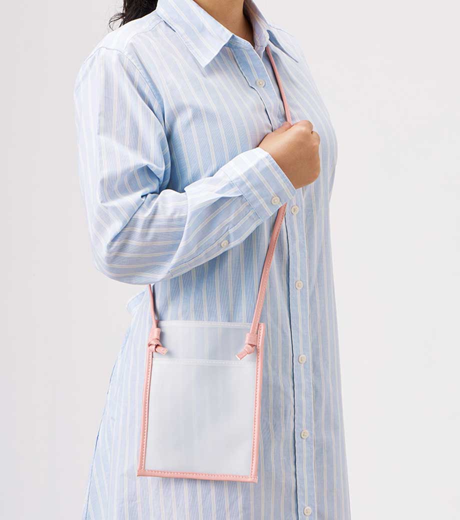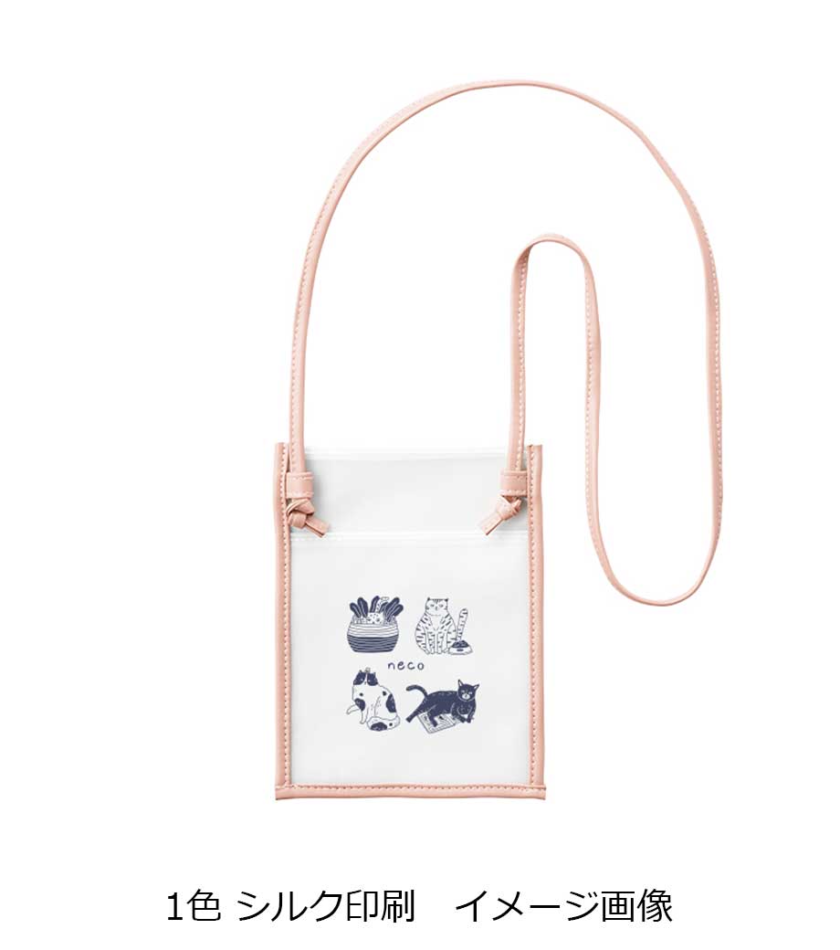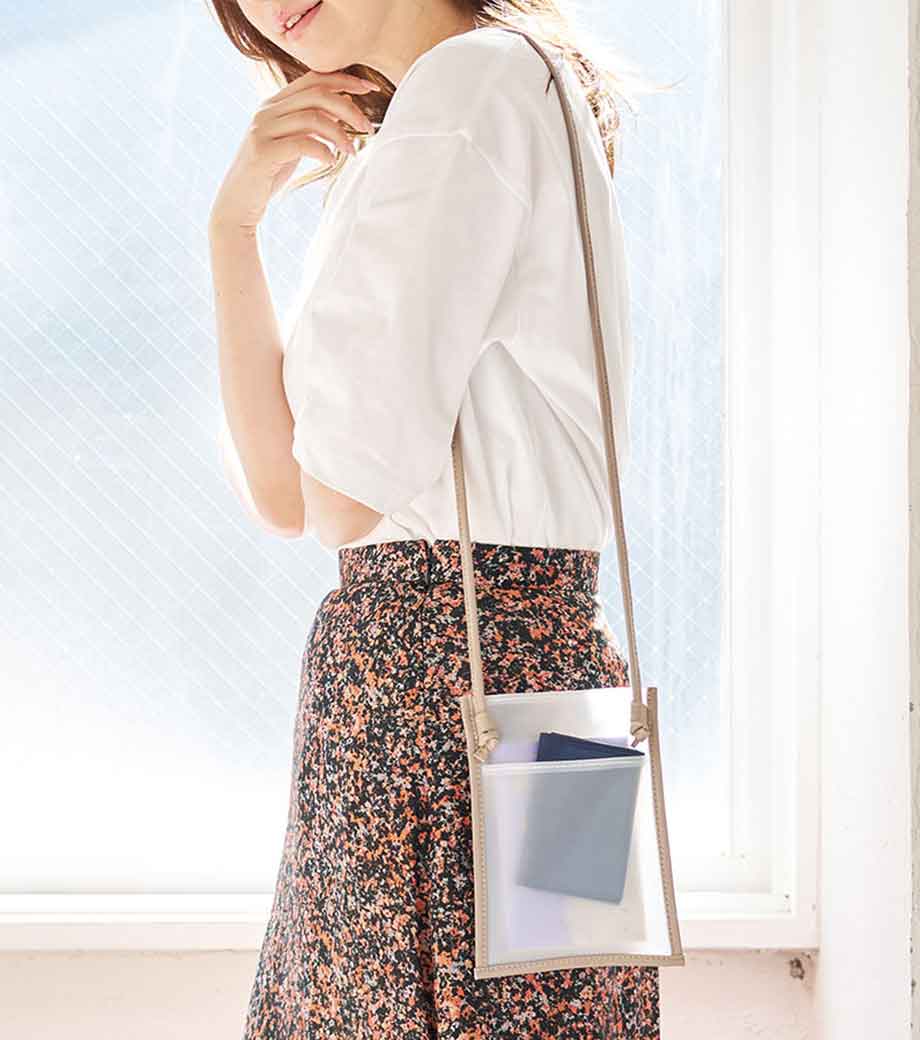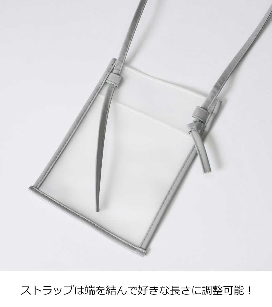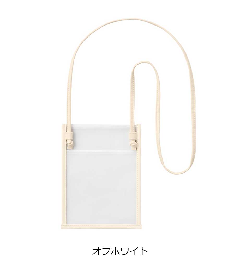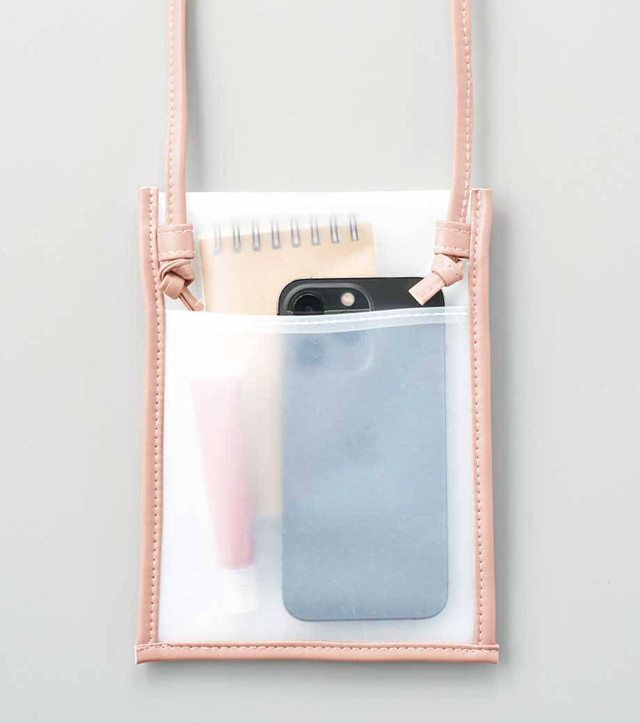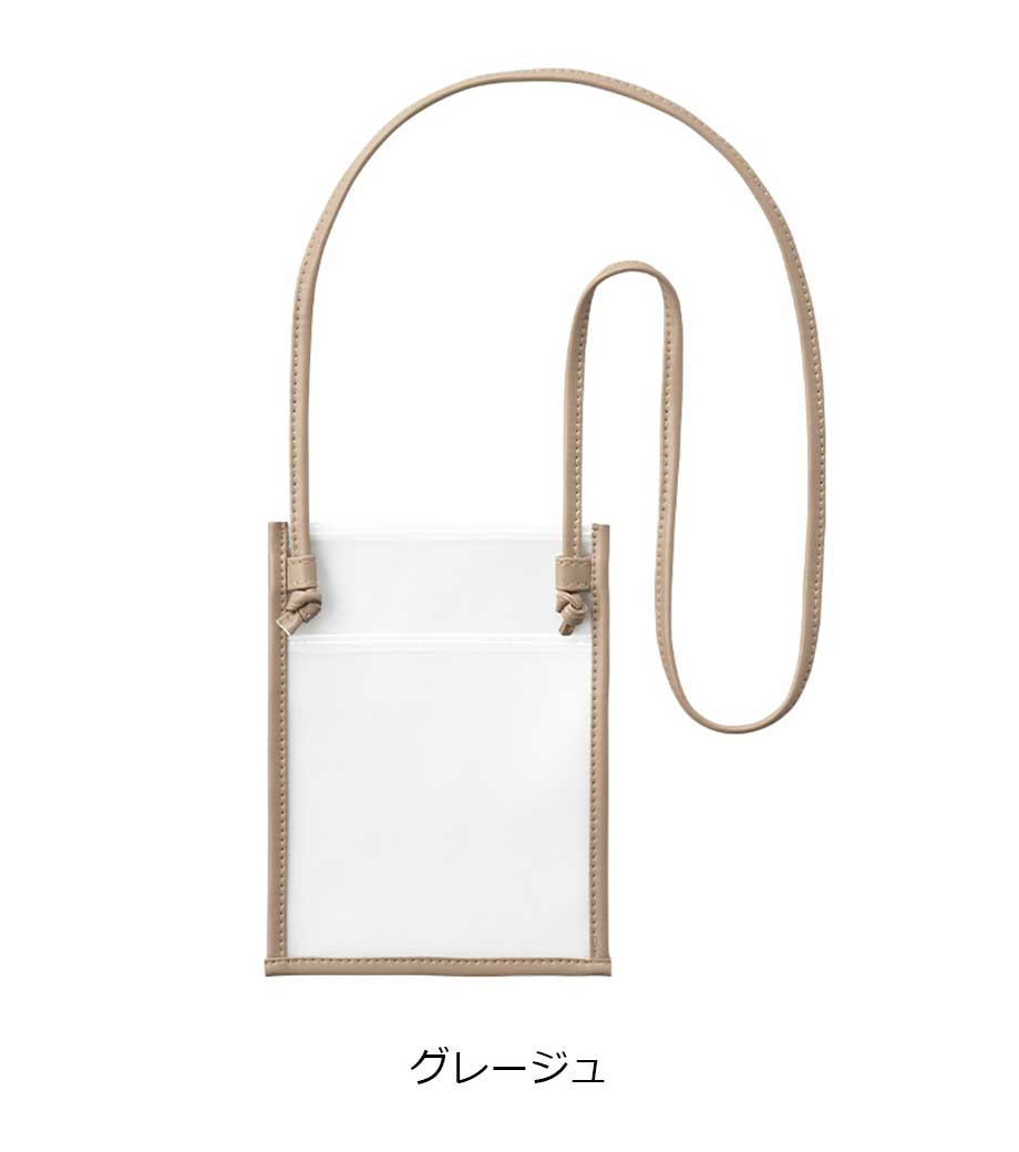 透け感のあるEVA素材にフェイクレザーを組み合わせた、高級感のあるデザインが人気のサコッシュ。水や紫外線に強いEVA素材。塩素を含んでいないため焼却してもダイオキシンが発生しない環境に優しい素材です。前面にポケットが付いており、スマホやハンカチなど小物を分けて収納することが可能。紐の長さは結び目の位置で調整できます。
