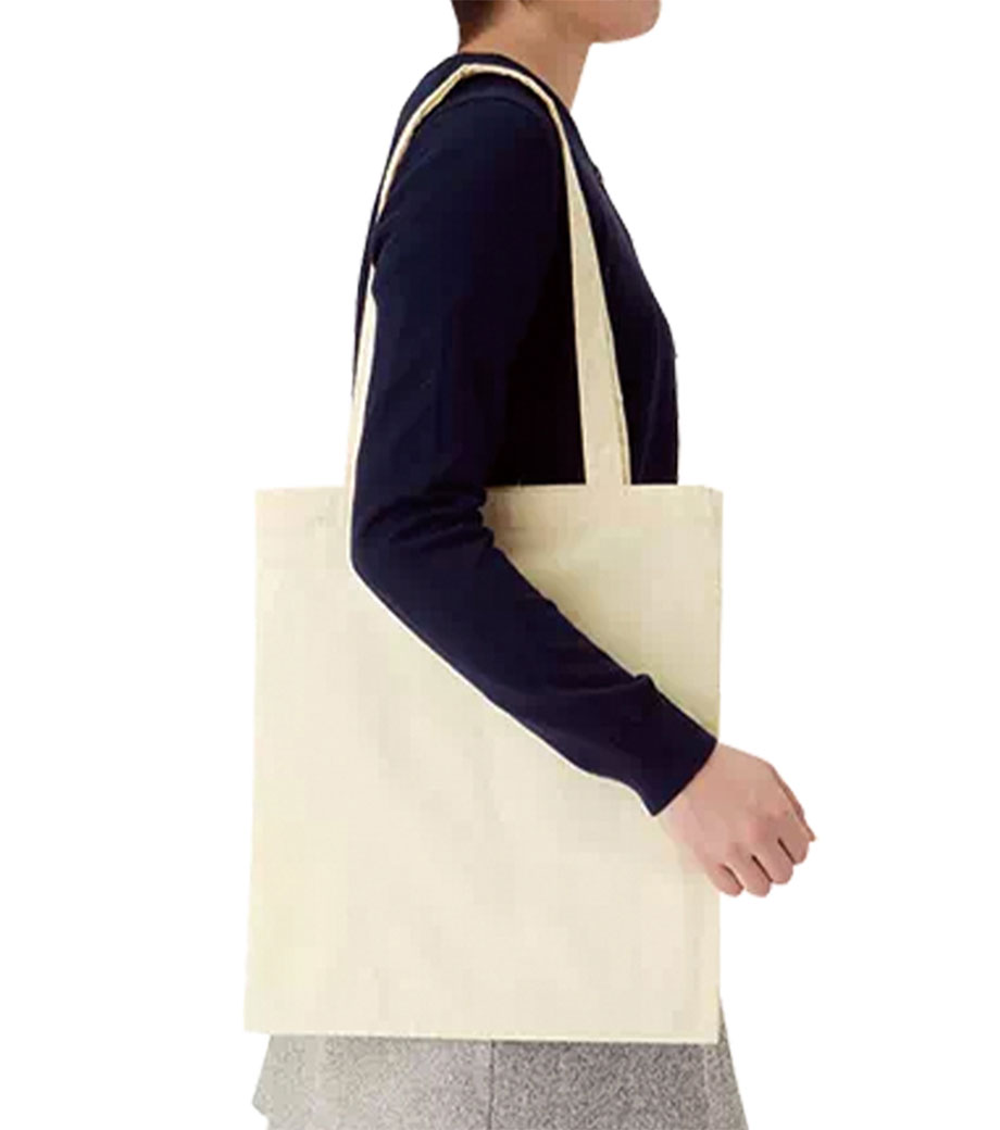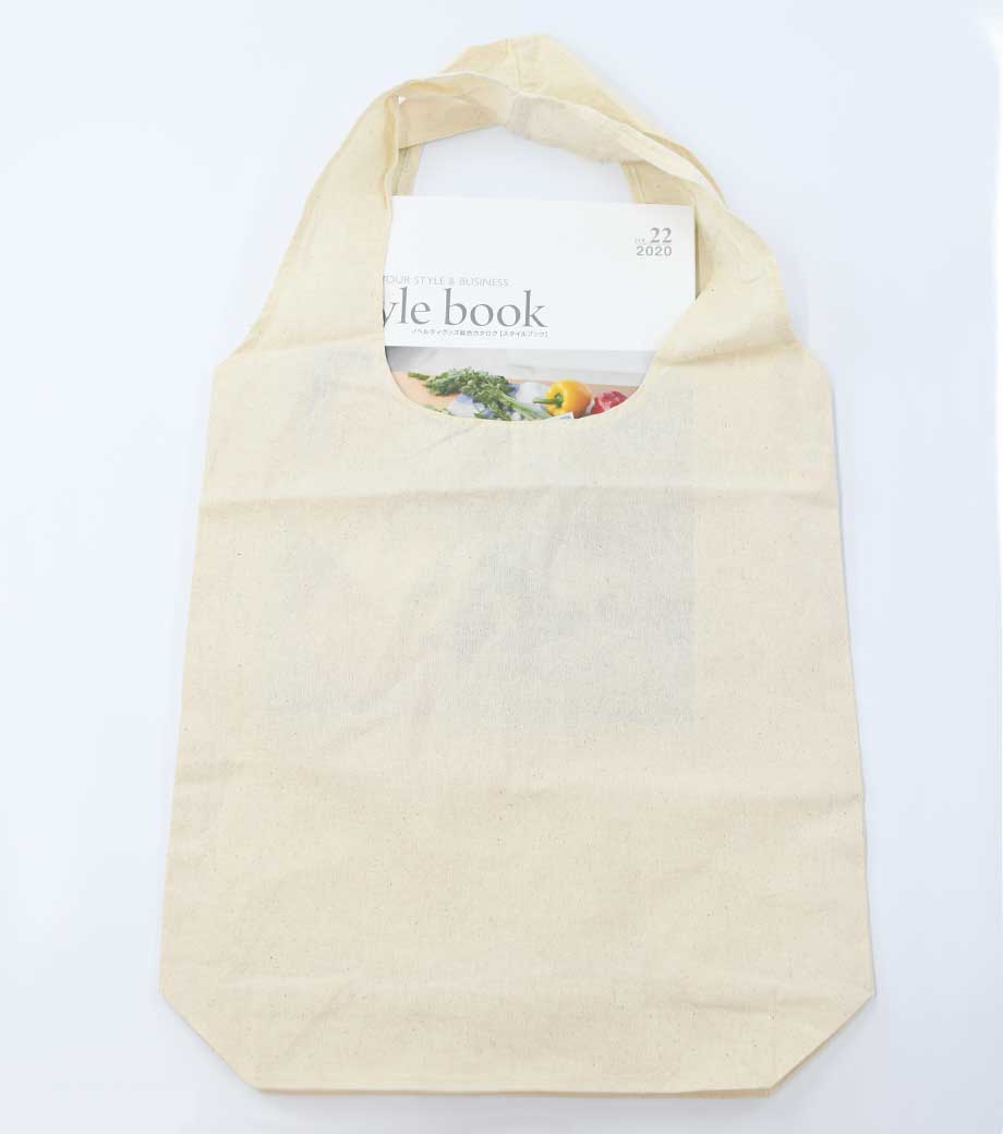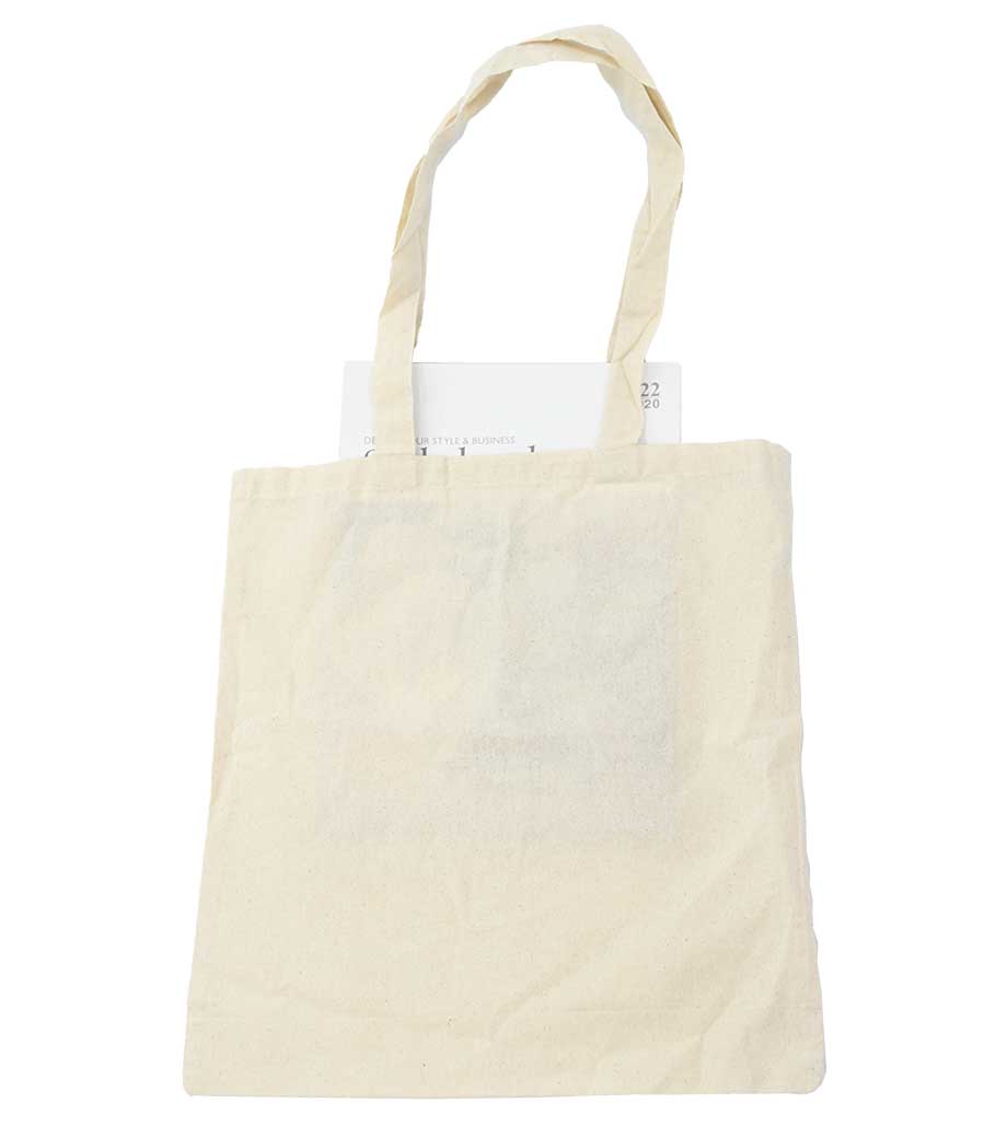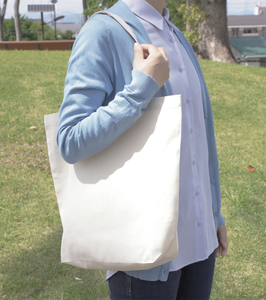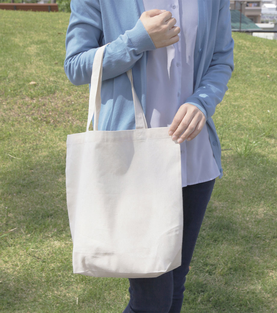 「ライトキャンバスバッグ」は、しっかりしたキャンバス生地の底マチタイプのエコバッグ。持ち手が長めなので、肩から掛けることもできます。本体色は、ナチュラルな風合いの生成り色です。