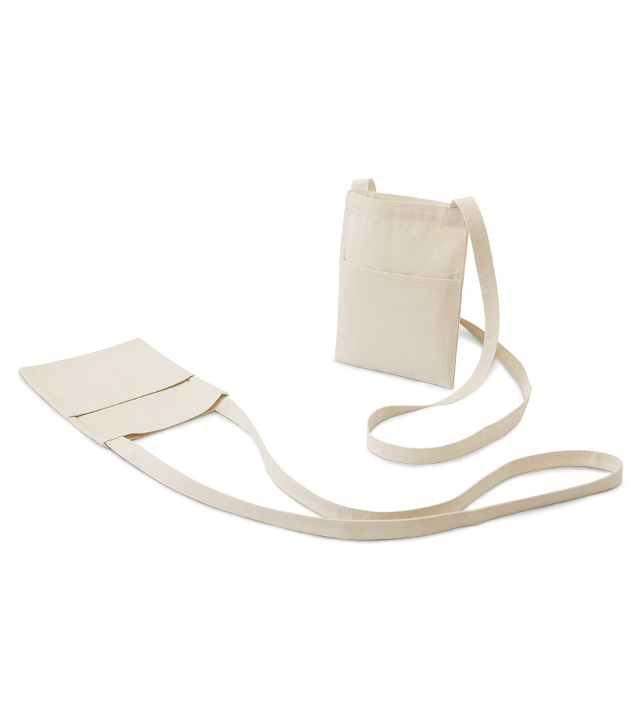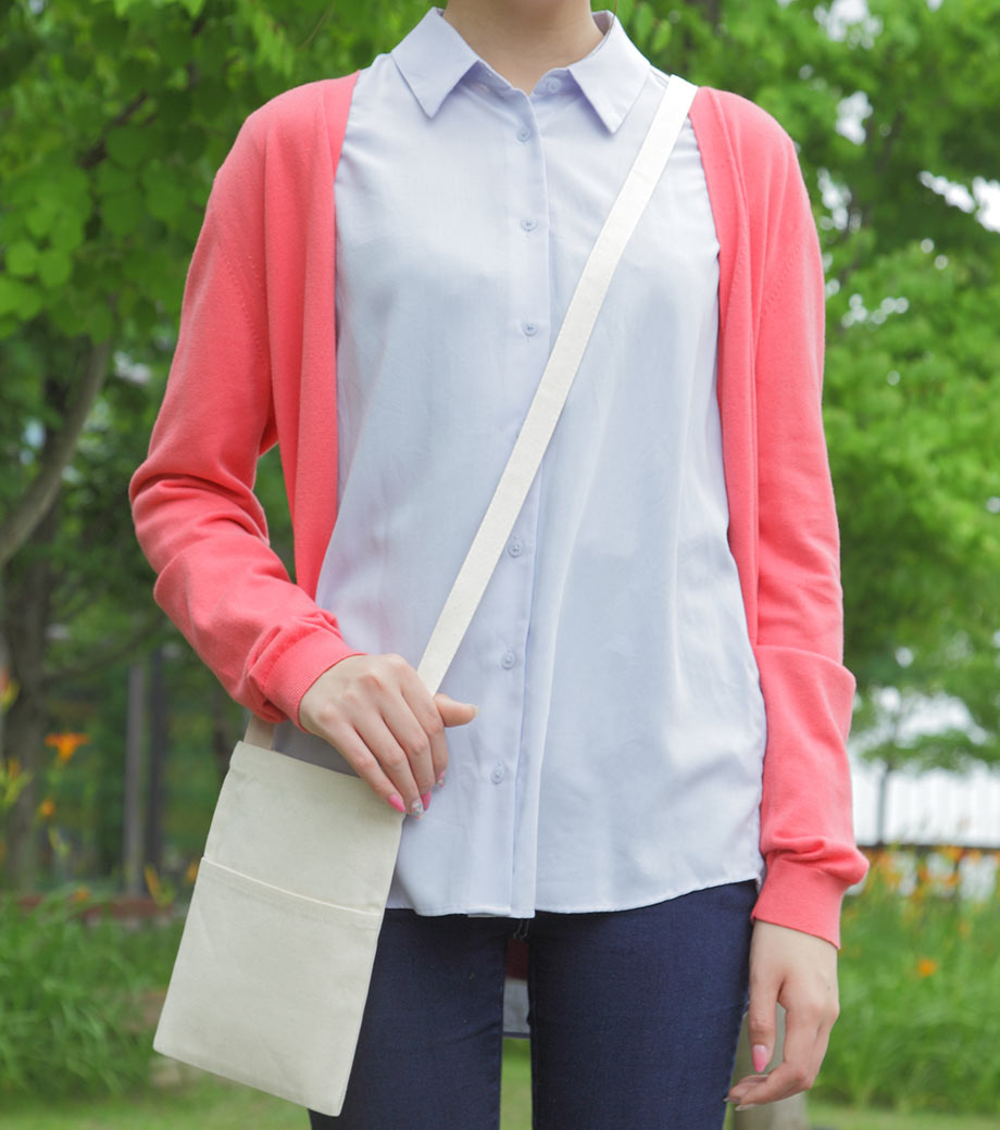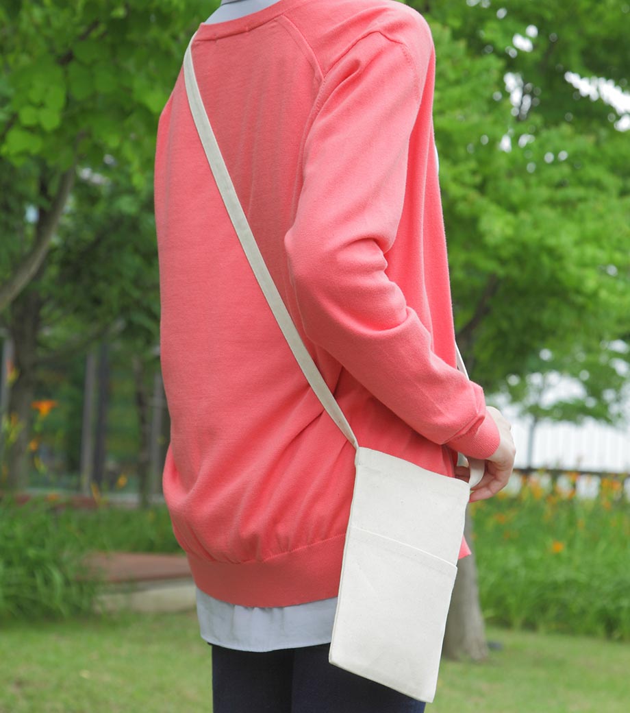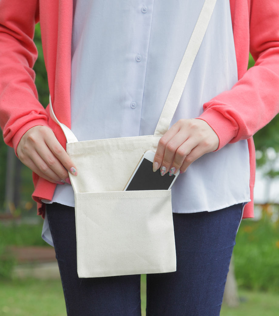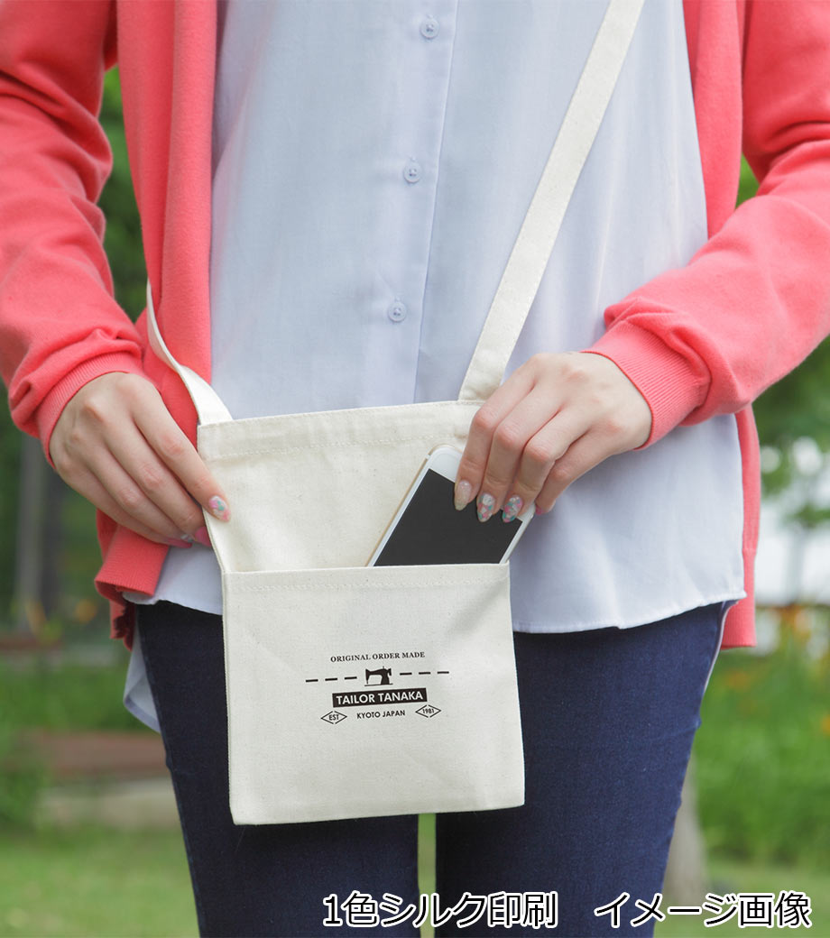 厚手コットンミニサコッシュは、やや小さめながら2ポケット付き。収納力と使い勝手の良さが魅力です。表面のオープンポケットと裏面のかぶせポケットがあるので、用途によって使い分けできます。フェスやお祭りなどのイベントの携帯に最適。