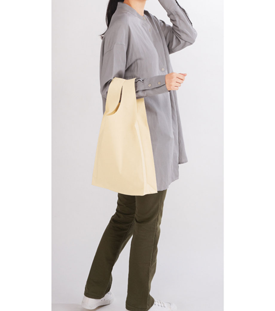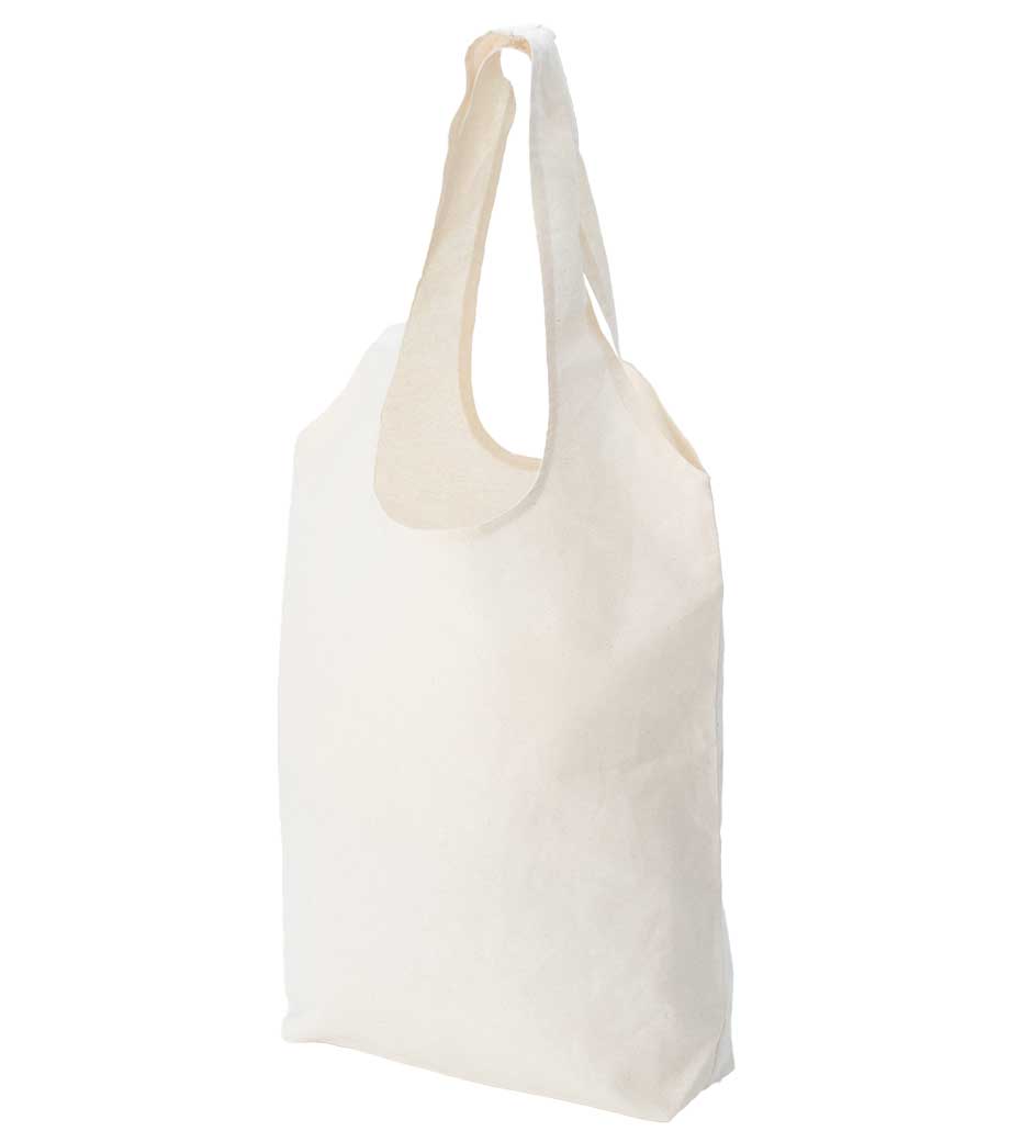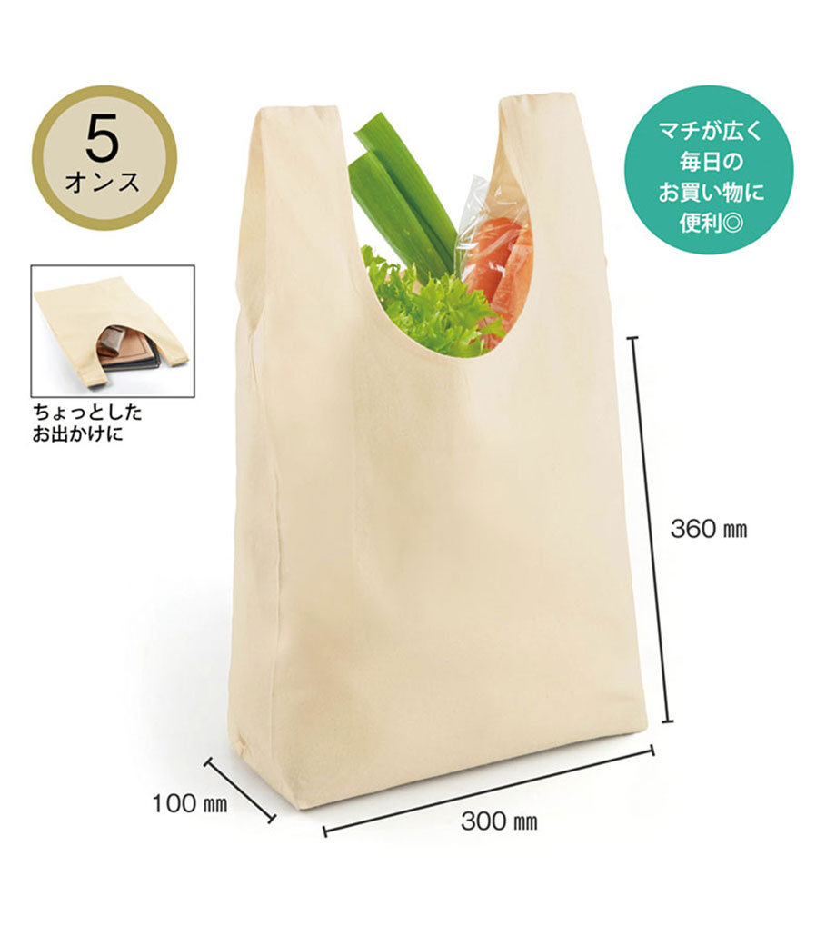 オーガニックコットン(マルシェタイプ)は薄手の5オンスなのでコンパクトに折りたたみ収納できます。レジ袋有料化で必需品となったエコバッグとしても使えます。