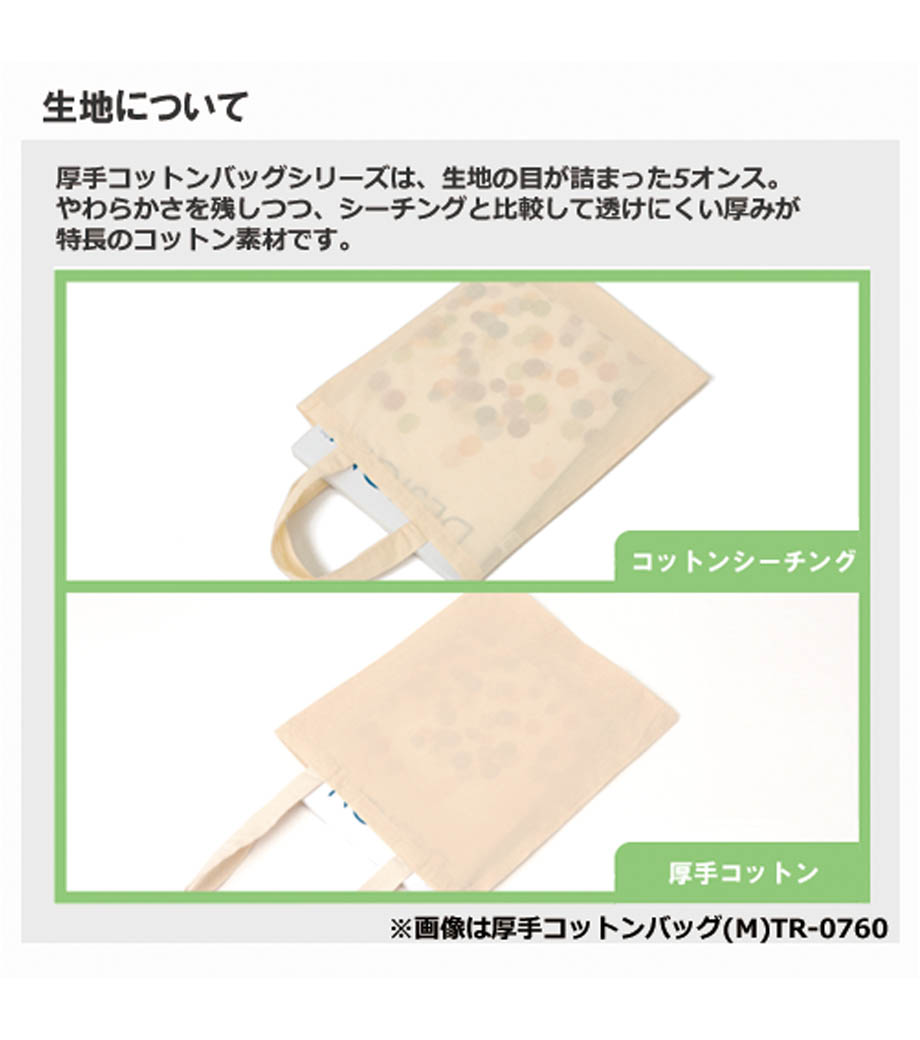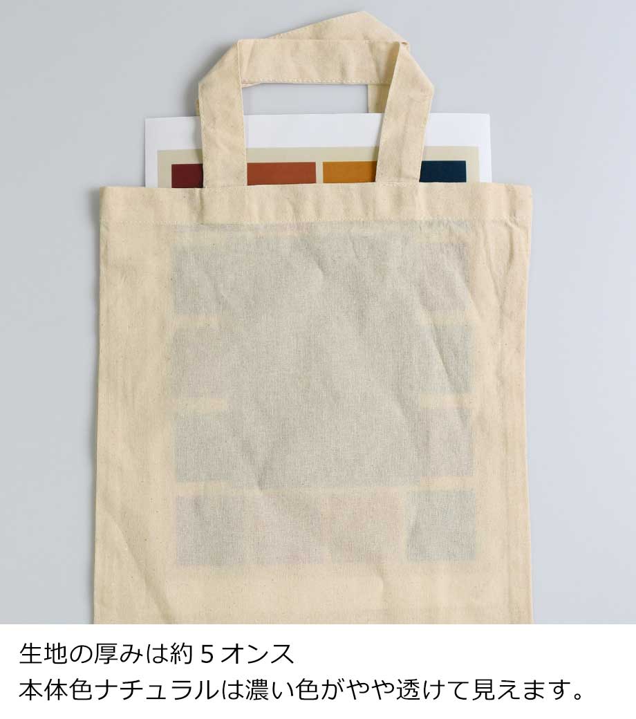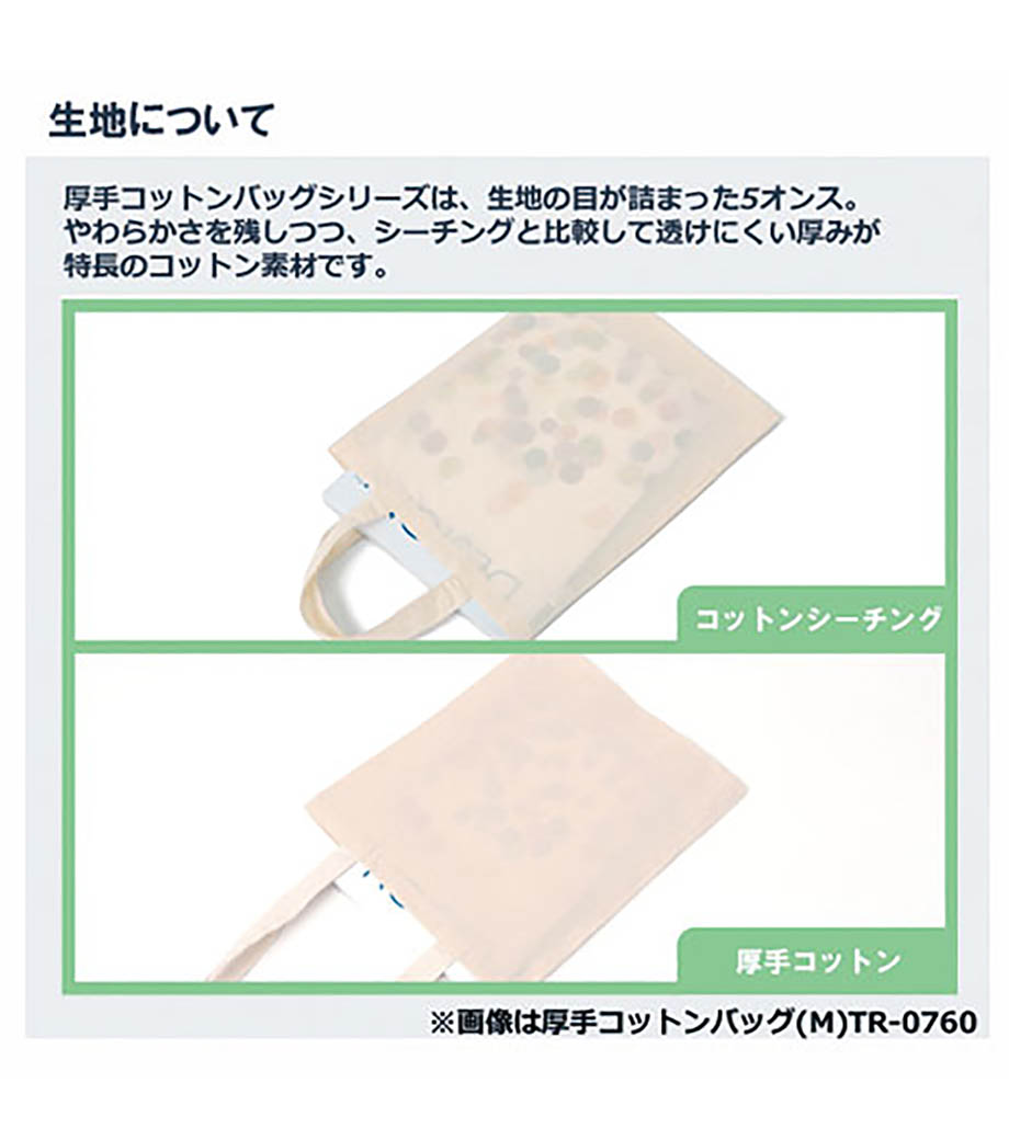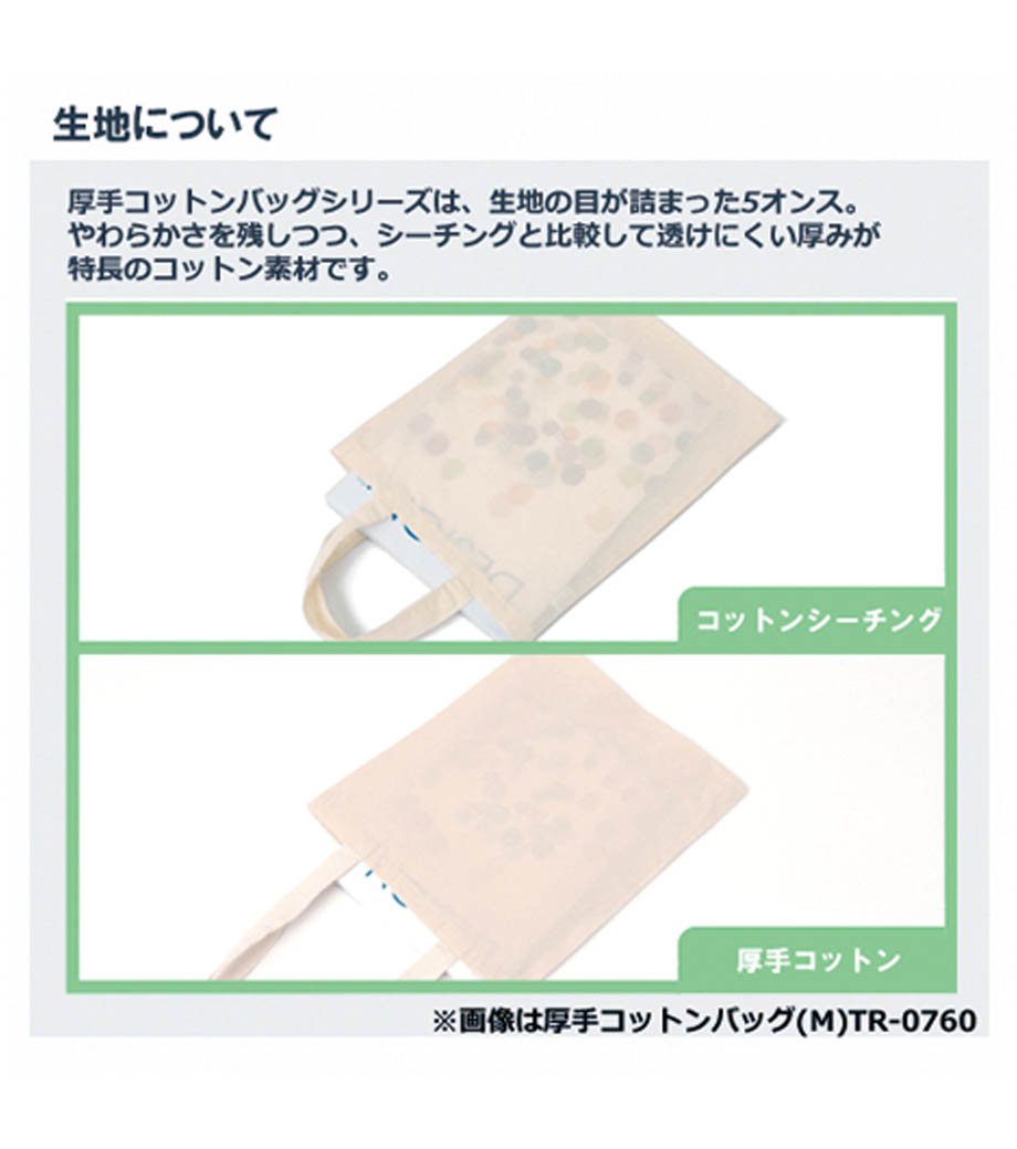 適度な厚みの5オンス以上のコットンバッグ。薄すぎず丈夫で透けにくいのが特徴的。イベント・同人グッズなどにおすすめです。