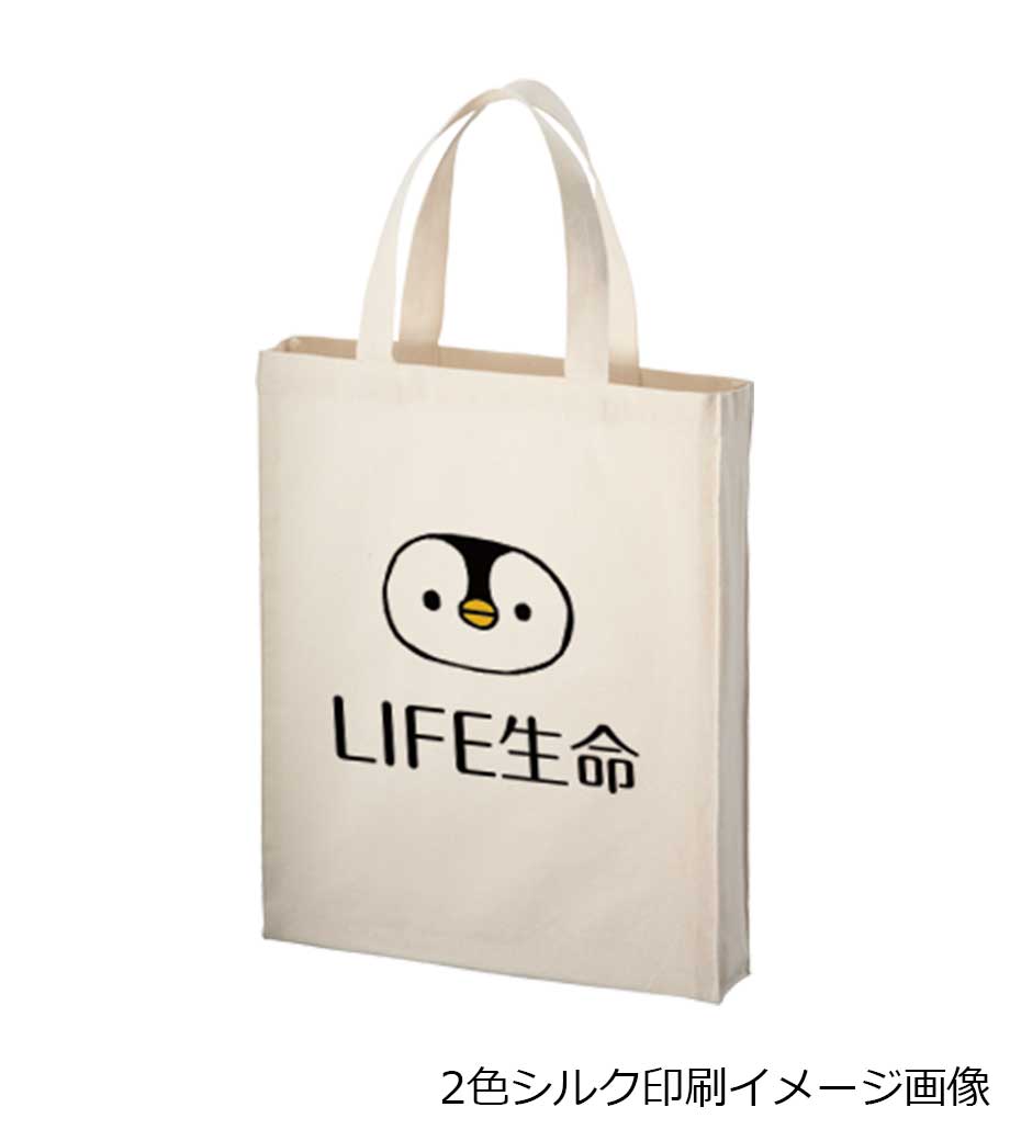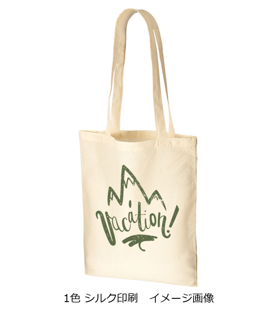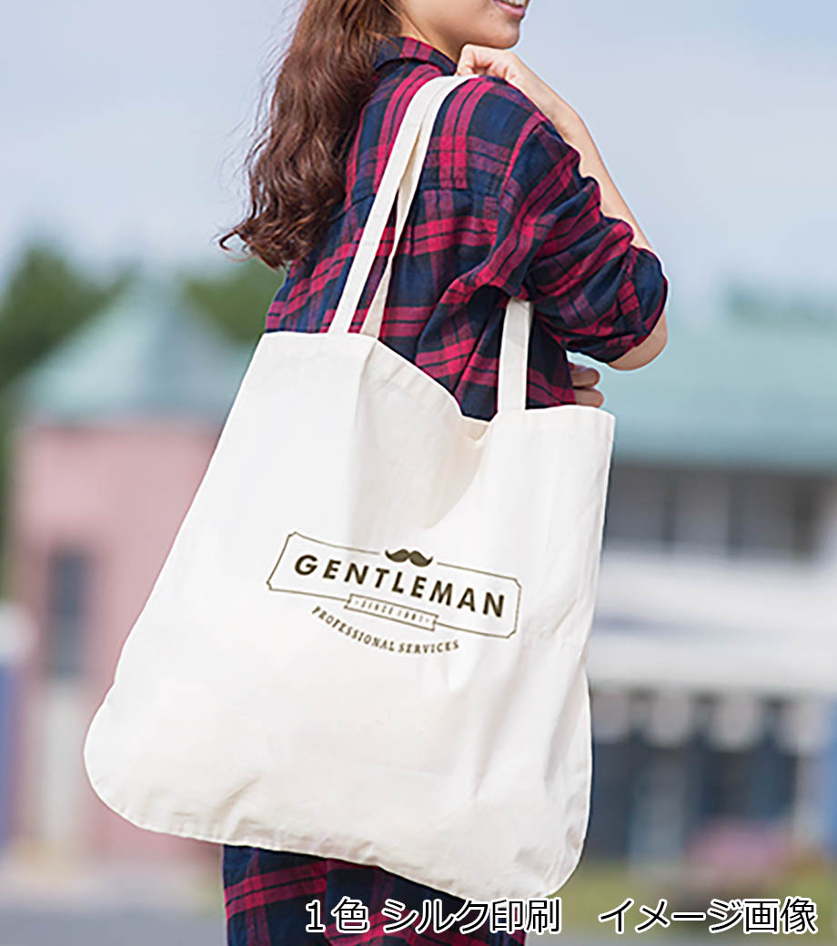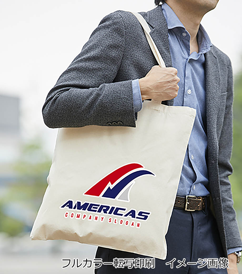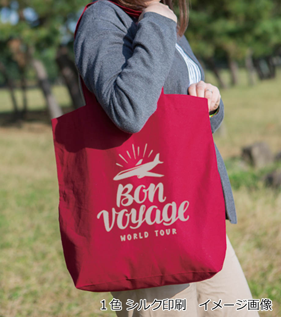 バッグ本体の生地は7オンス相当の厚みがあり丈夫。お買い物用としてもメインバッグとしても持ち運べる使い勝手のよさが魅力です。1色、2色、フルカラーで名入れ可能。ロゴやキャラクターを入れたオリジナルバッグが制作できます。購入特典などのキャンペーン販促品やグッズ制作に人気のノベルティです。