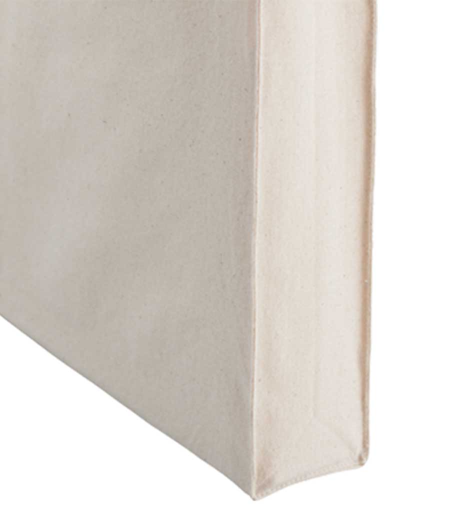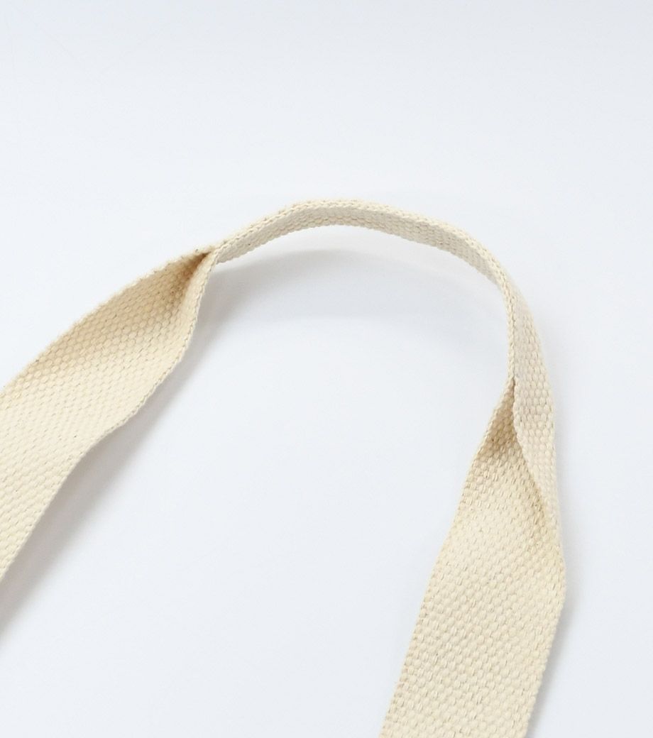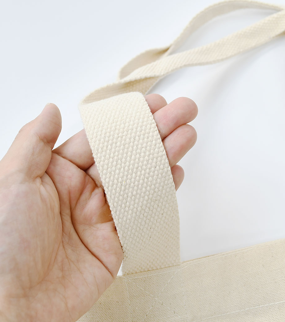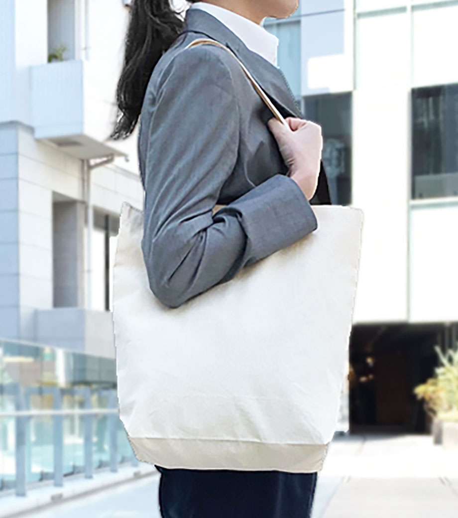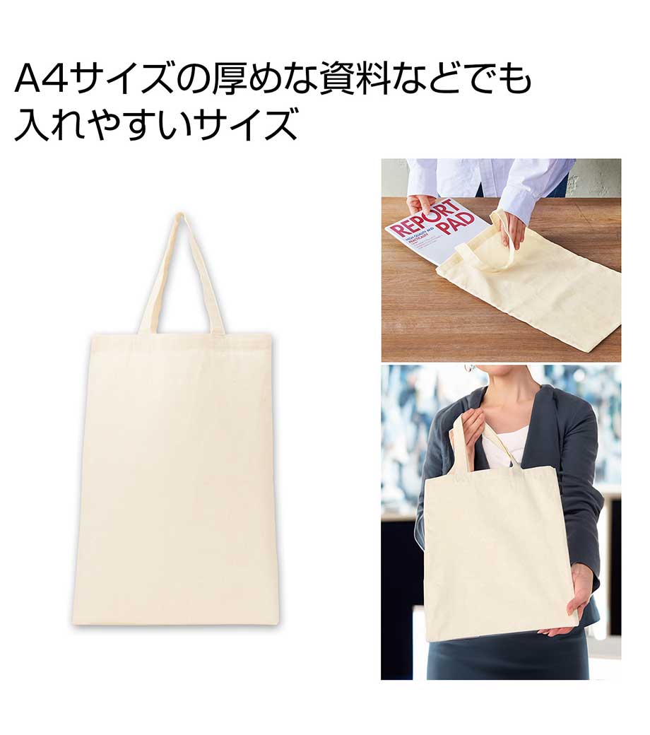 縦横比がほぼ同じで、トレンド感あるデザインの肩掛けコットンバッグです。A4サイズ対応で底マチがあるのでコンパクトなのに収納力があります。約5オンスの生地でかさばりにくいです。資料の持ち帰りだけでなく、普段使いのサブバッグとしても重宝します。