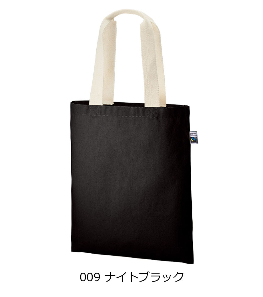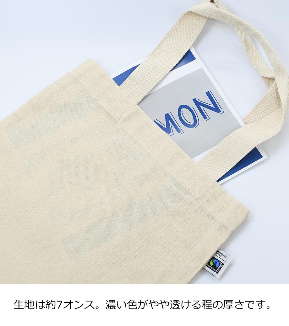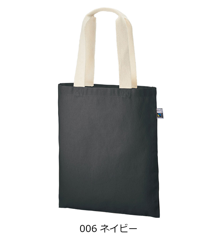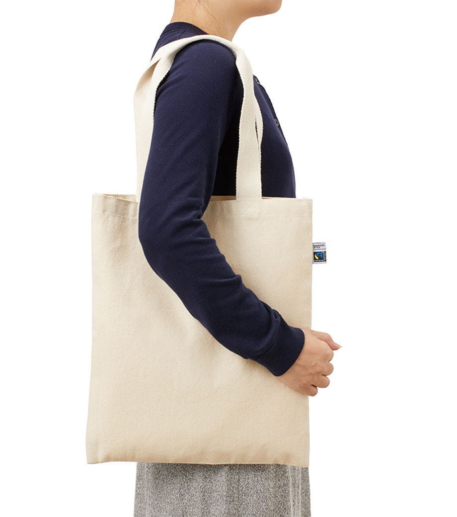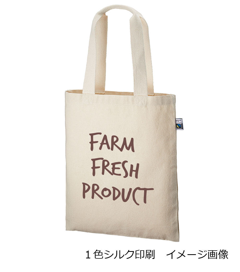 フェアトレードコットンを使用したマチ無しのスクエア型トートです。薄手で使いやすい5オンスで、肩掛けできる長めのハンドル付き。国際フェアトレード認証ラベル付き。1色のシルク印刷かフルカラー印刷が可能。