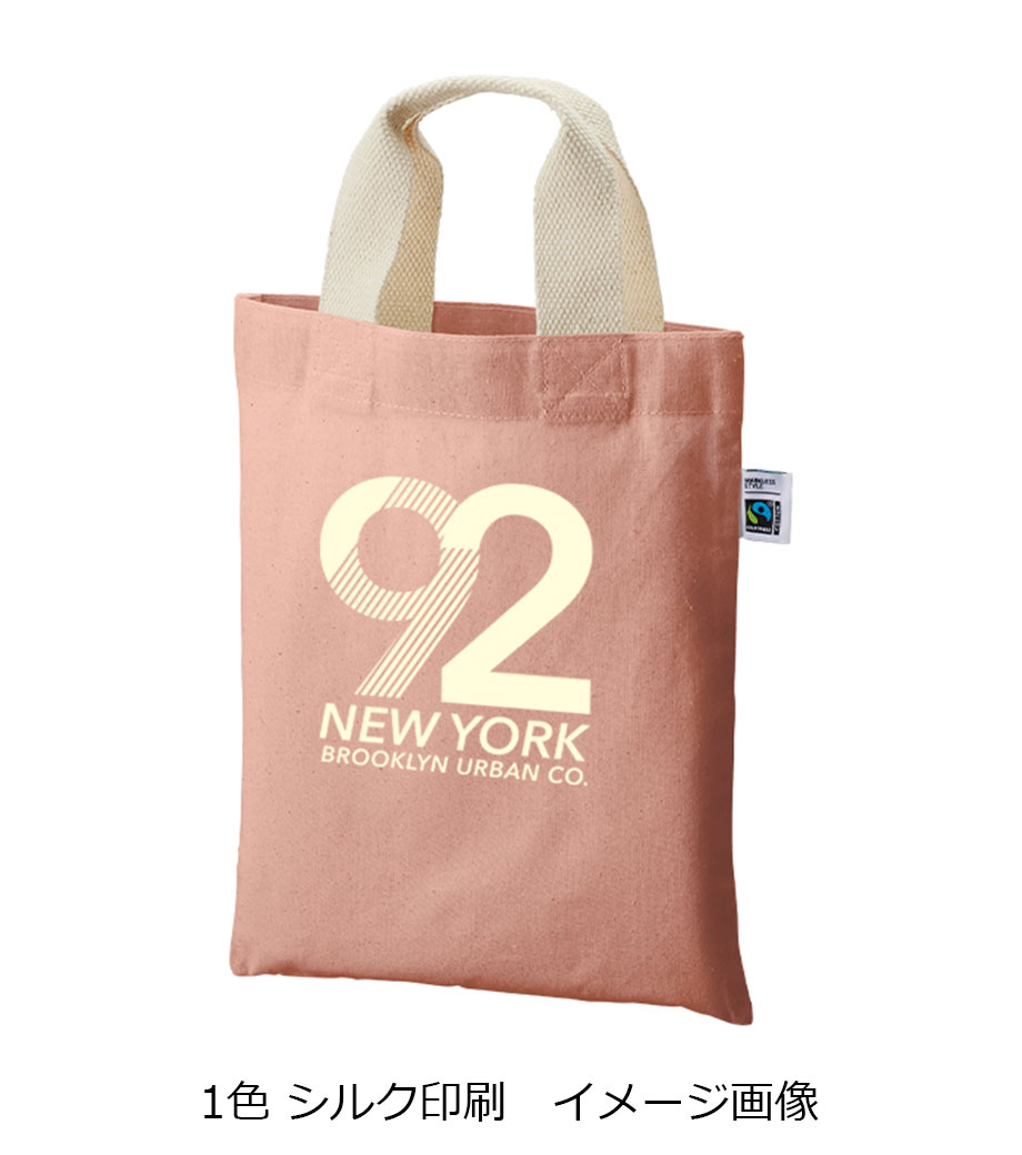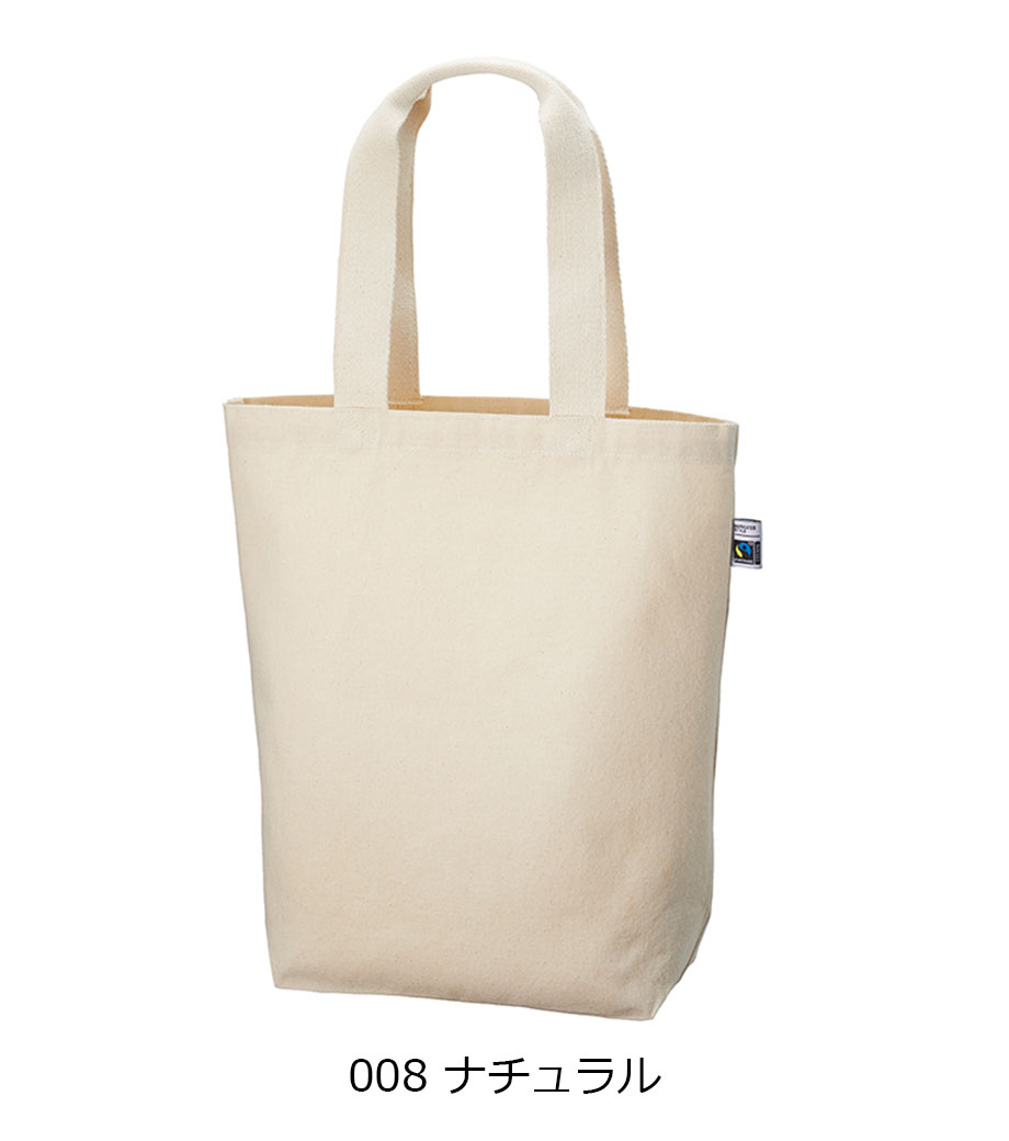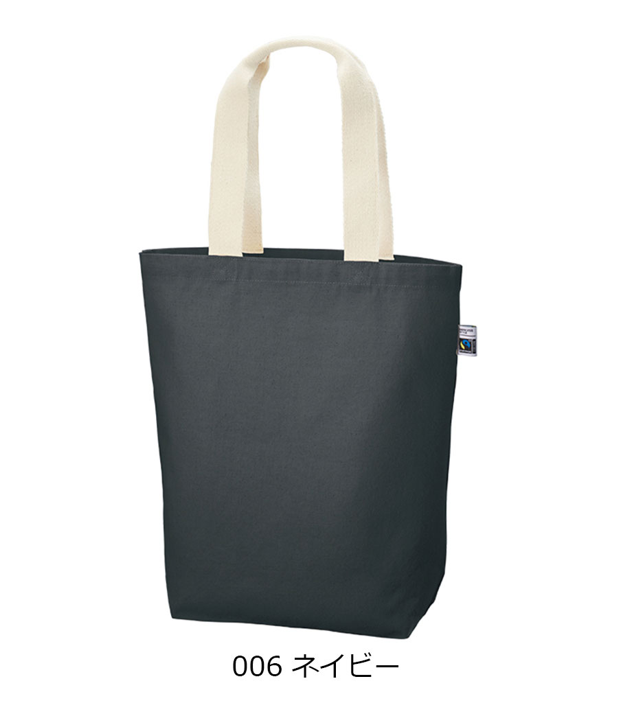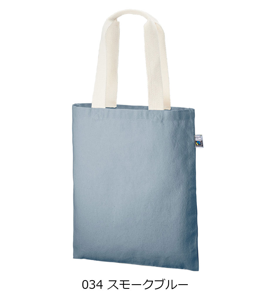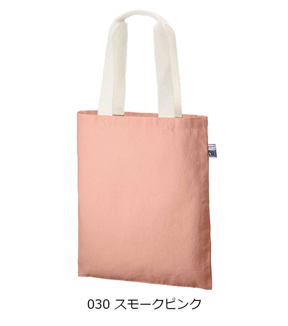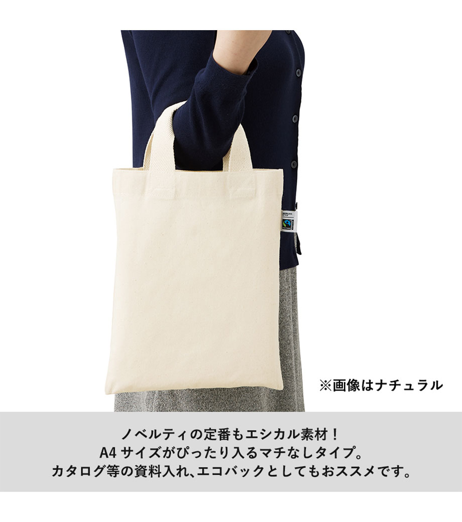 フェアトレードコットンを使用したマチ無しのスクエア型トートです。薄手で使いやすい5オンスで、肩掛けできる長めのハンドル付き。国際フェアトレード認証ラベル付き。1色のシルク印刷かフルカラー印刷が可能。