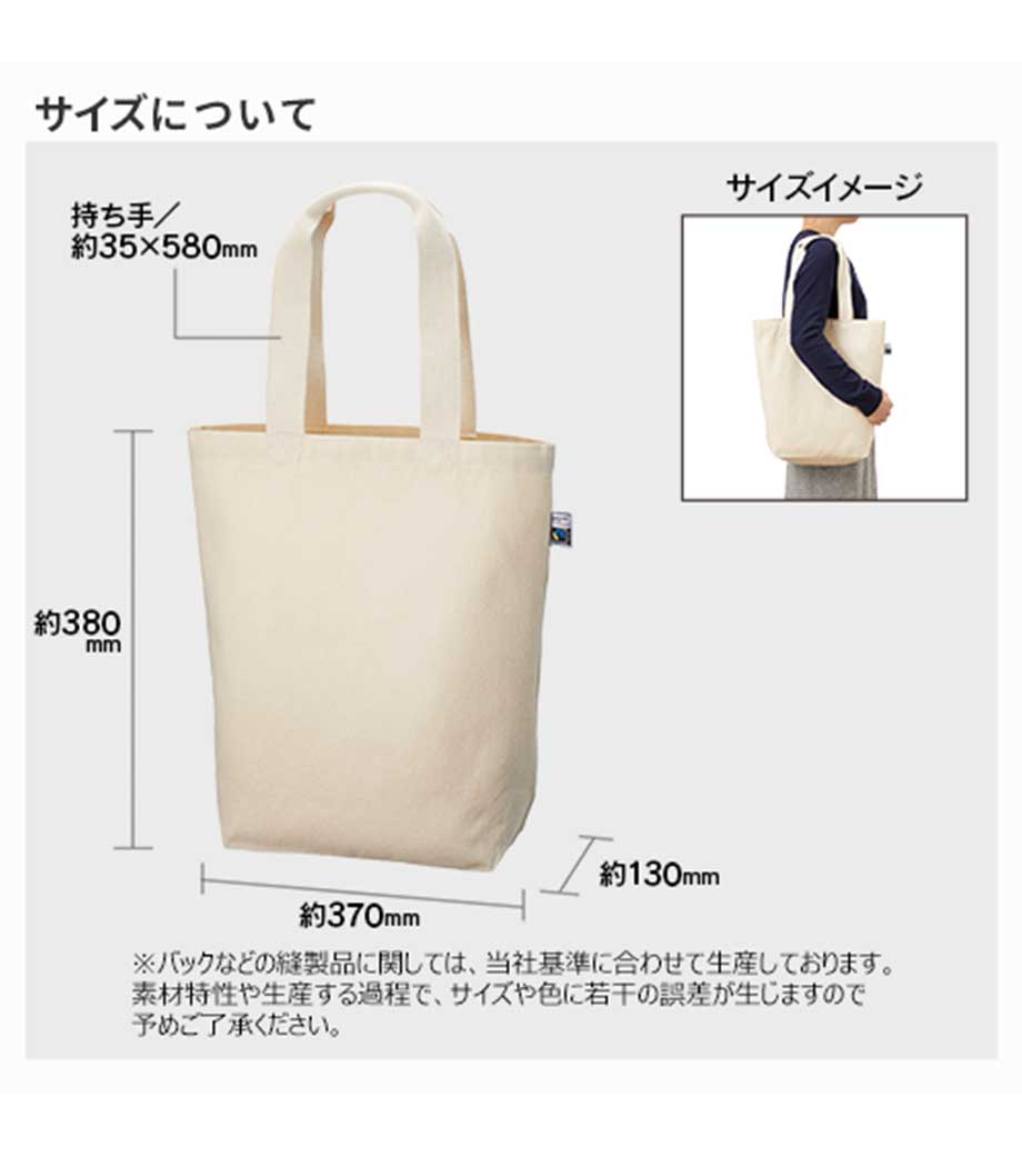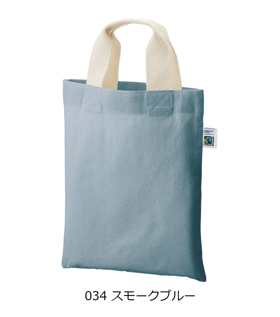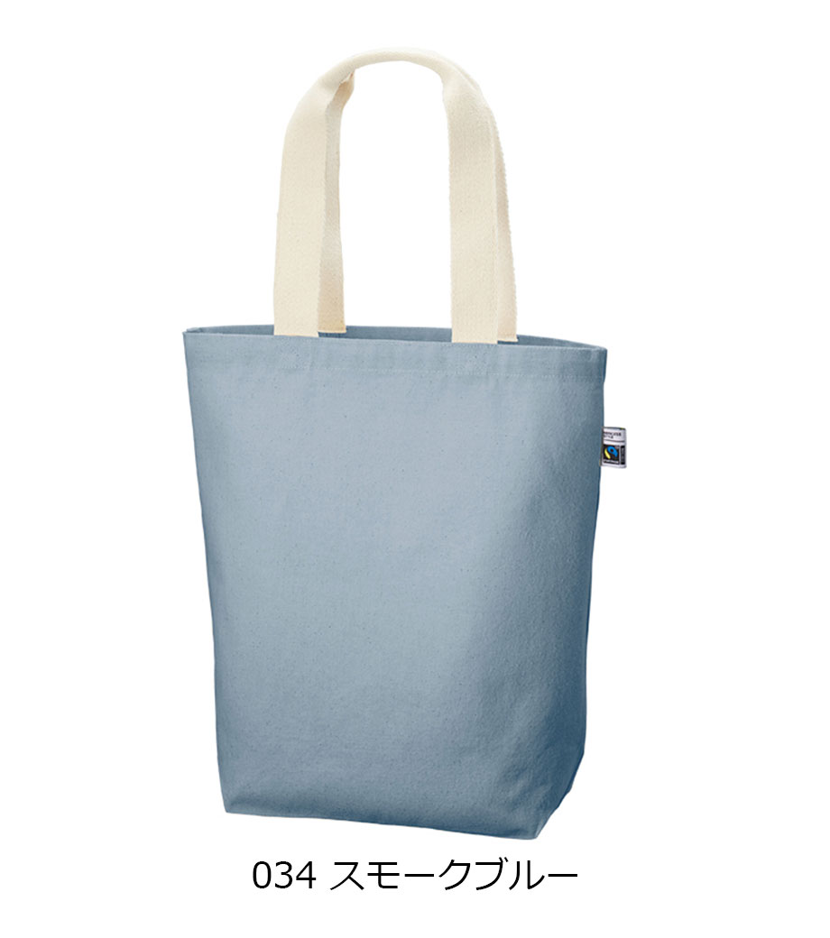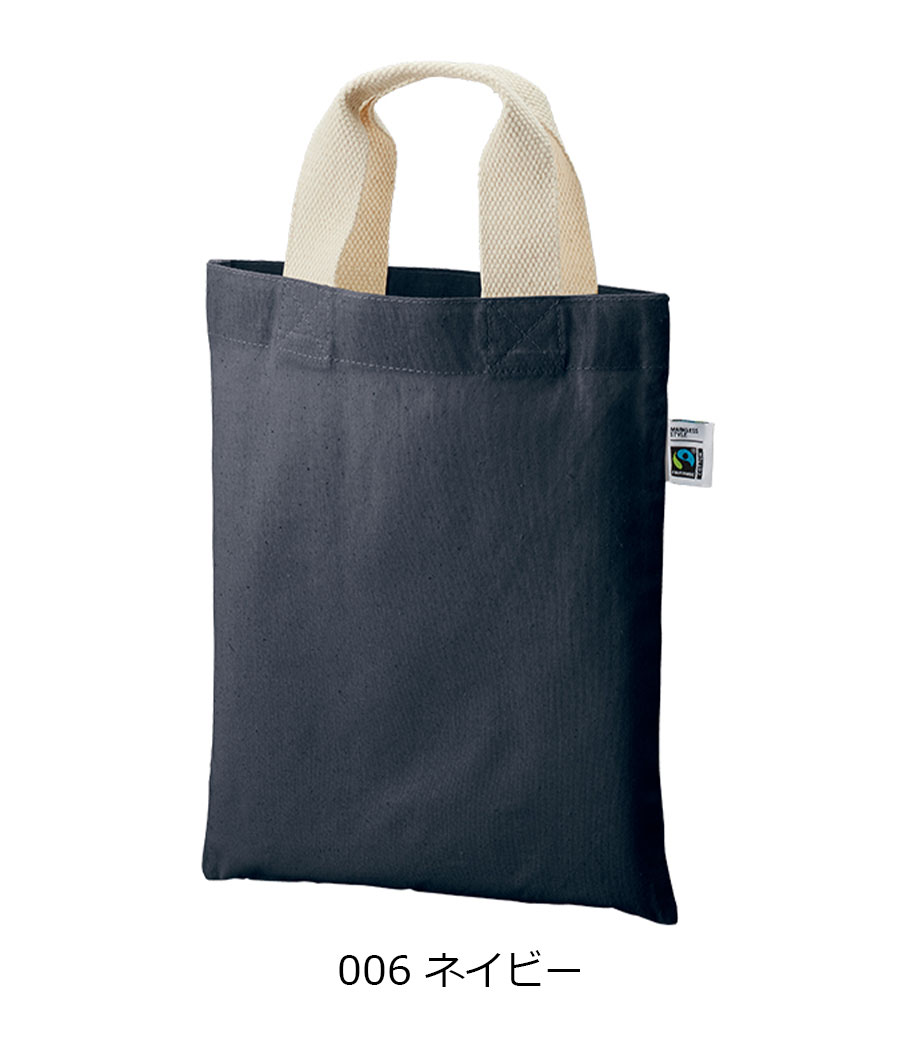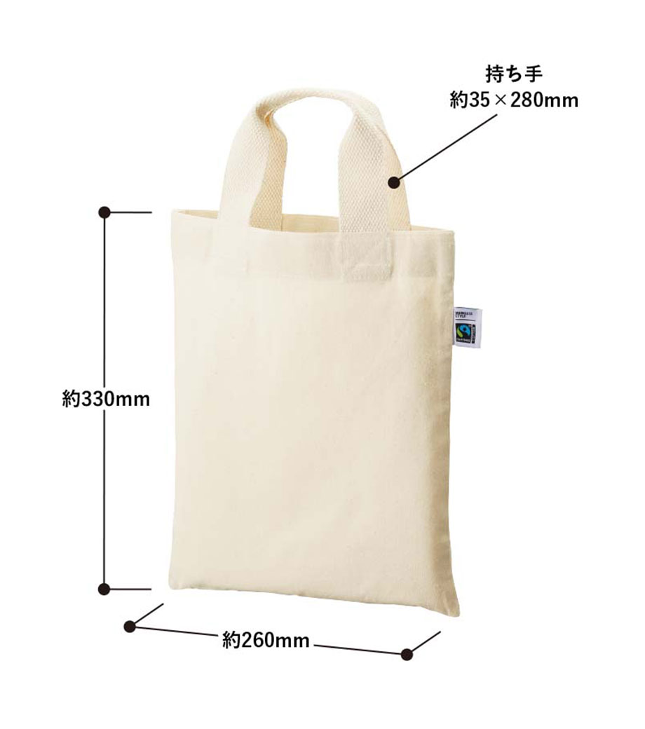 フェアトレードコットンを使用したマチ無しのスクエア型トートです。薄手で使いやすい5オンスで、肩掛けできる長めのハンドル付き。国際フェアトレード認証ラベル付き。1色のシルク印刷かフルカラー印刷が可能。