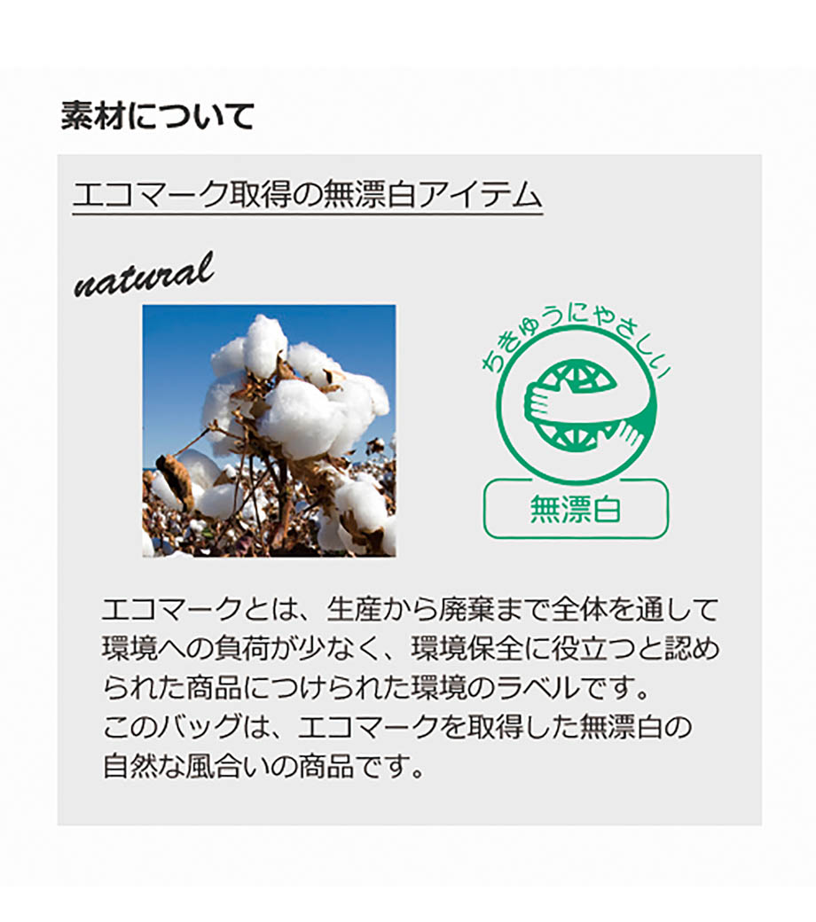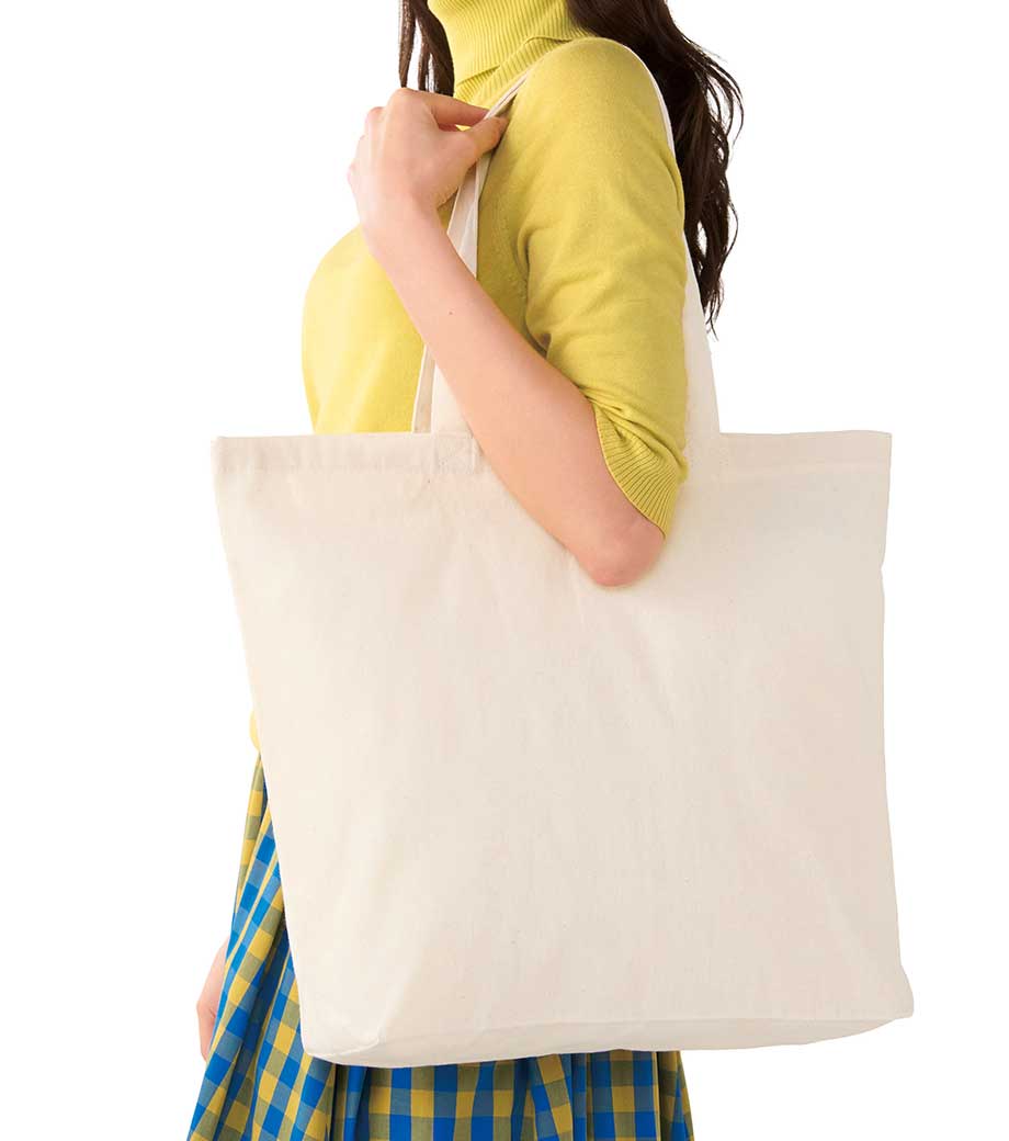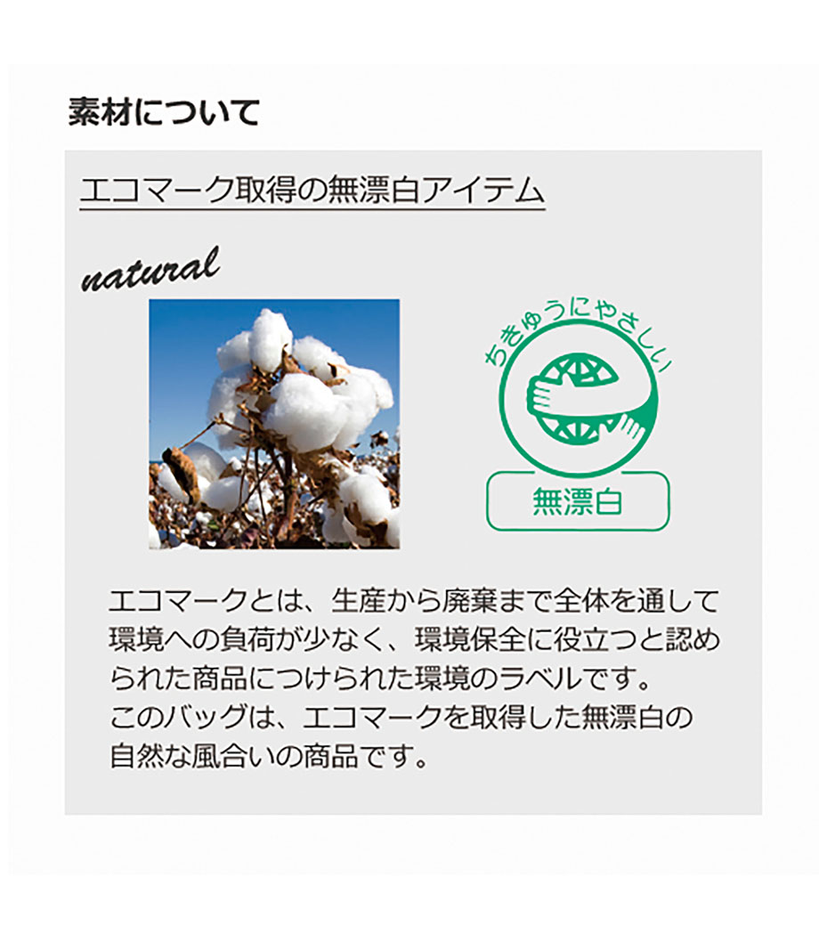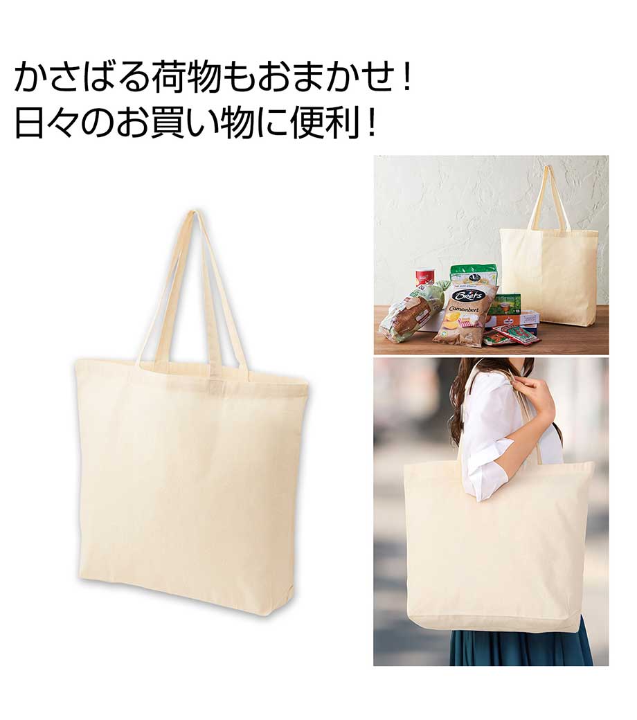 「コットンエコトートバッグ」は、定番サイズのトートをワイドに広げた大きめのバッグ。スーパーのまとめ買いや、かさばる資料の持ち運びなどに重宝します。地球環境にやさしい無漂白コットンを使い、ナチュラルな風合いに仕上げました。