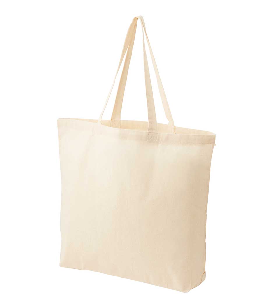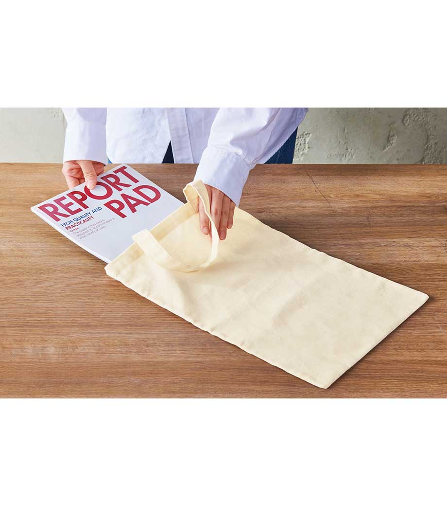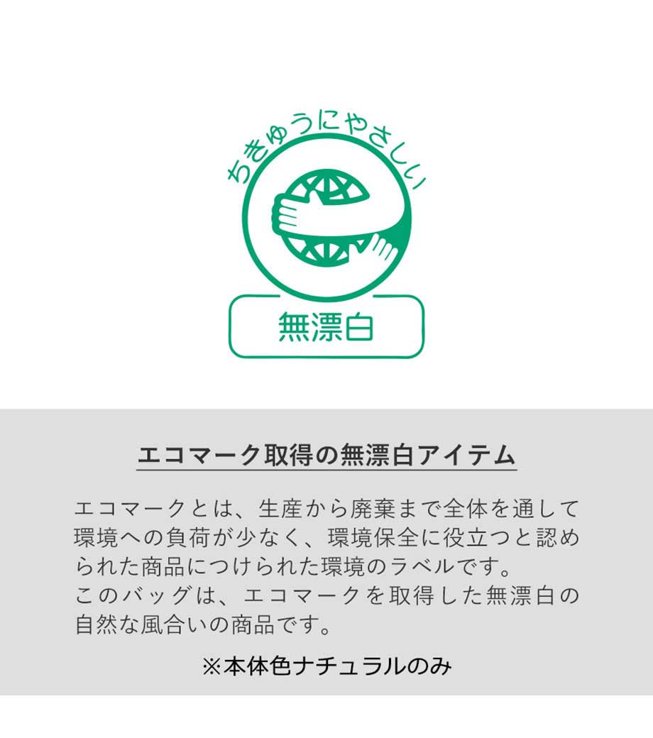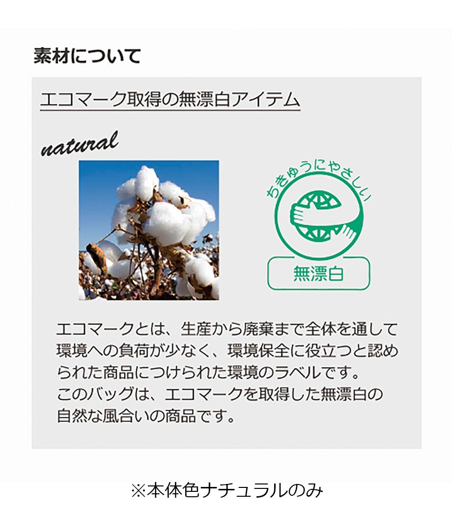 「コットンエコトートバッグ」は、定番サイズのトートをワイドに広げた大きめのバッグ。スーパーのまとめ買いや、かさばる資料の持ち運びなどに重宝します。地球環境にやさしい無漂白コットンを使い、ナチュラルな風合いに仕上げました。