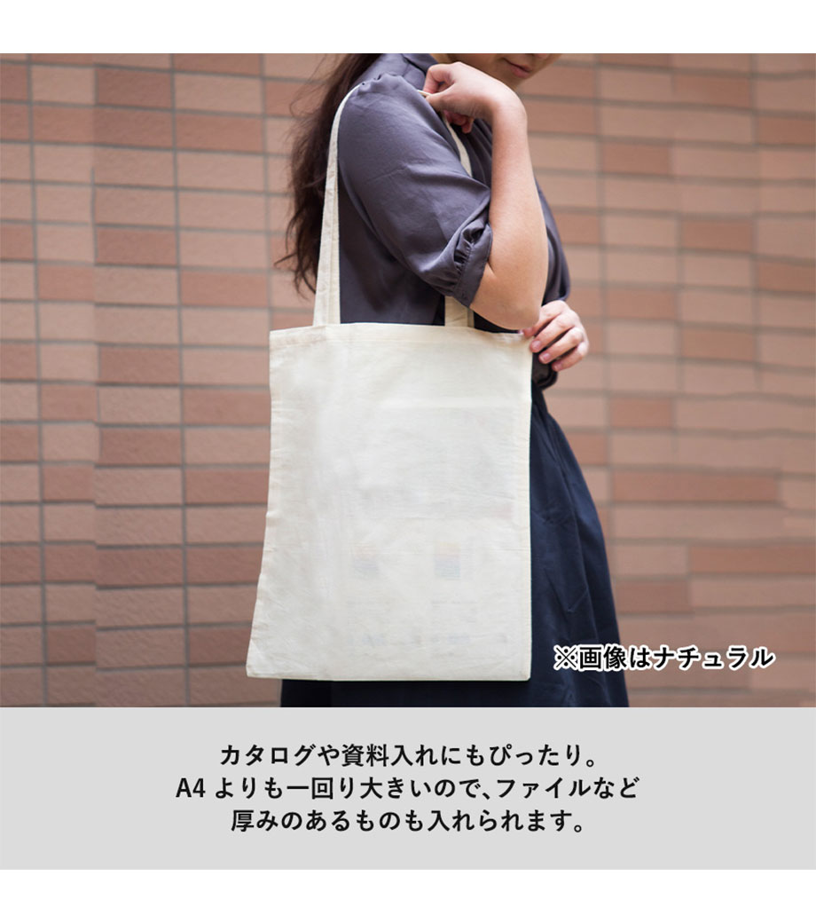 バッグはB4資料を入れるのにピッタリなフラット型。A4資料であれば余裕をもって入れることができます。生地は約7オンスと濃い色がやや透ける程度の厚みです。説明会や展示会での配布用にすればSDGsへの取り組みをお客様に知ってもらうきっかけになりますよ。