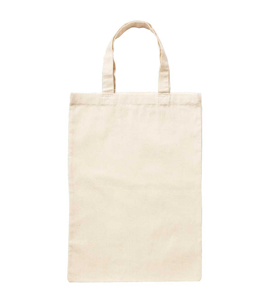 小ぶりなマルシェバッグ。A5ノートが入るサイズ感でちょっとしたお出かけにおすすめ。片側のハンドルをもう一方に通すと、たちまち人気のワンハンドルバッグ風に。生地の厚みは5オンス。マチなしのフラットタイプで適度に薄く、軽い使用感です。