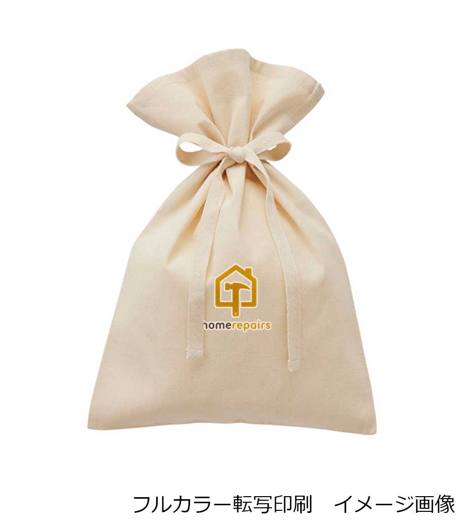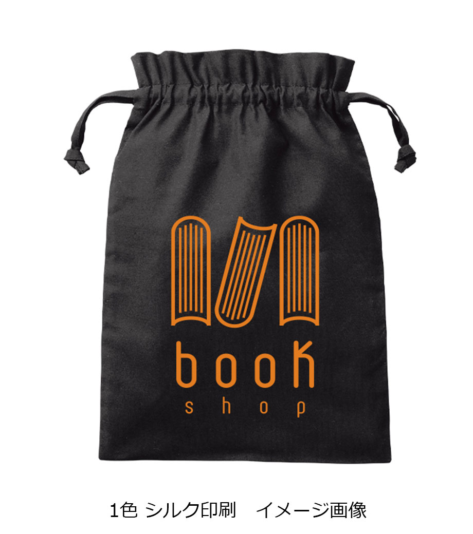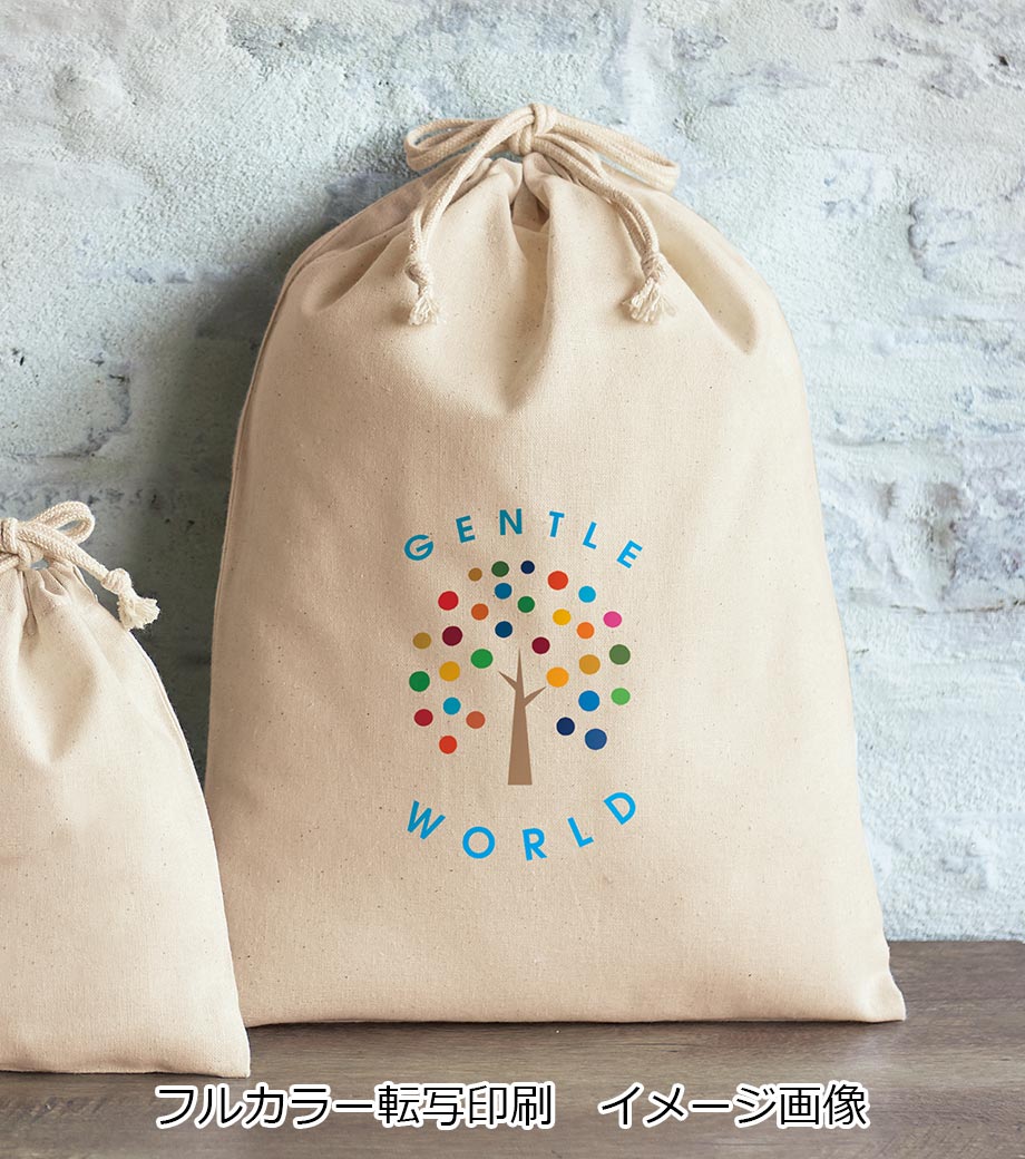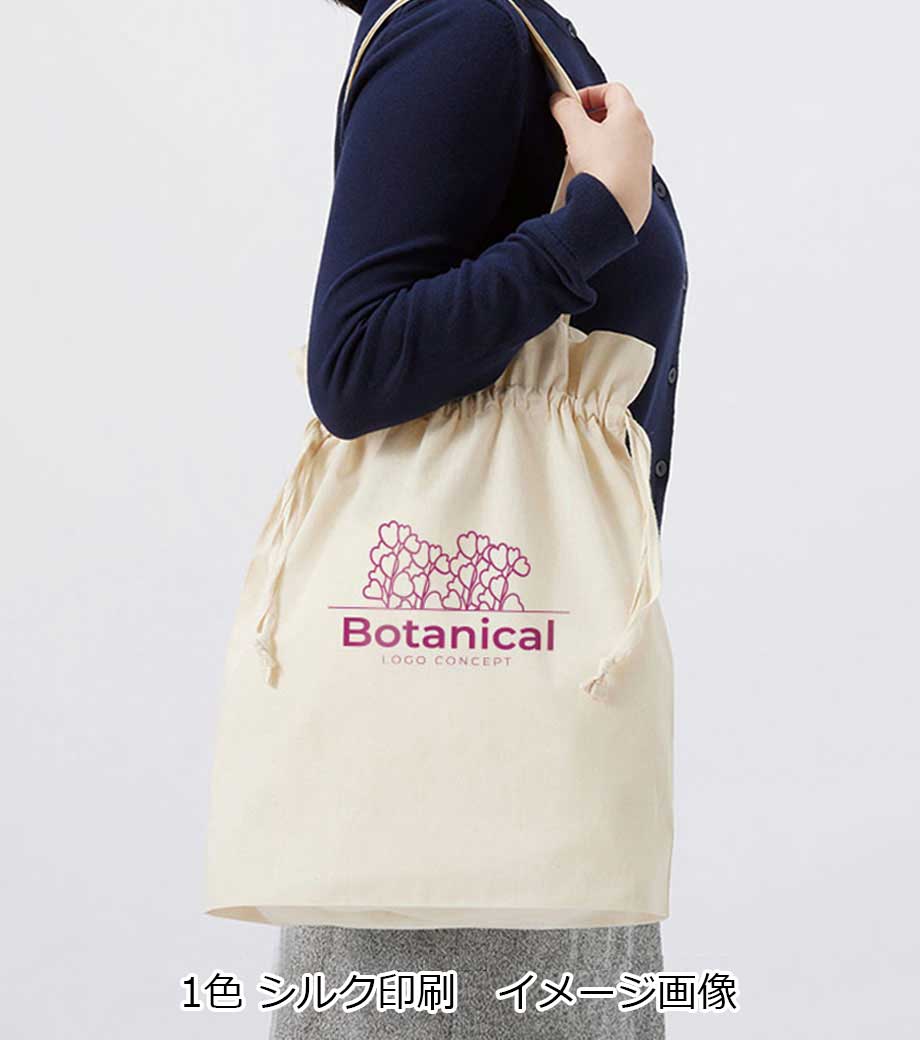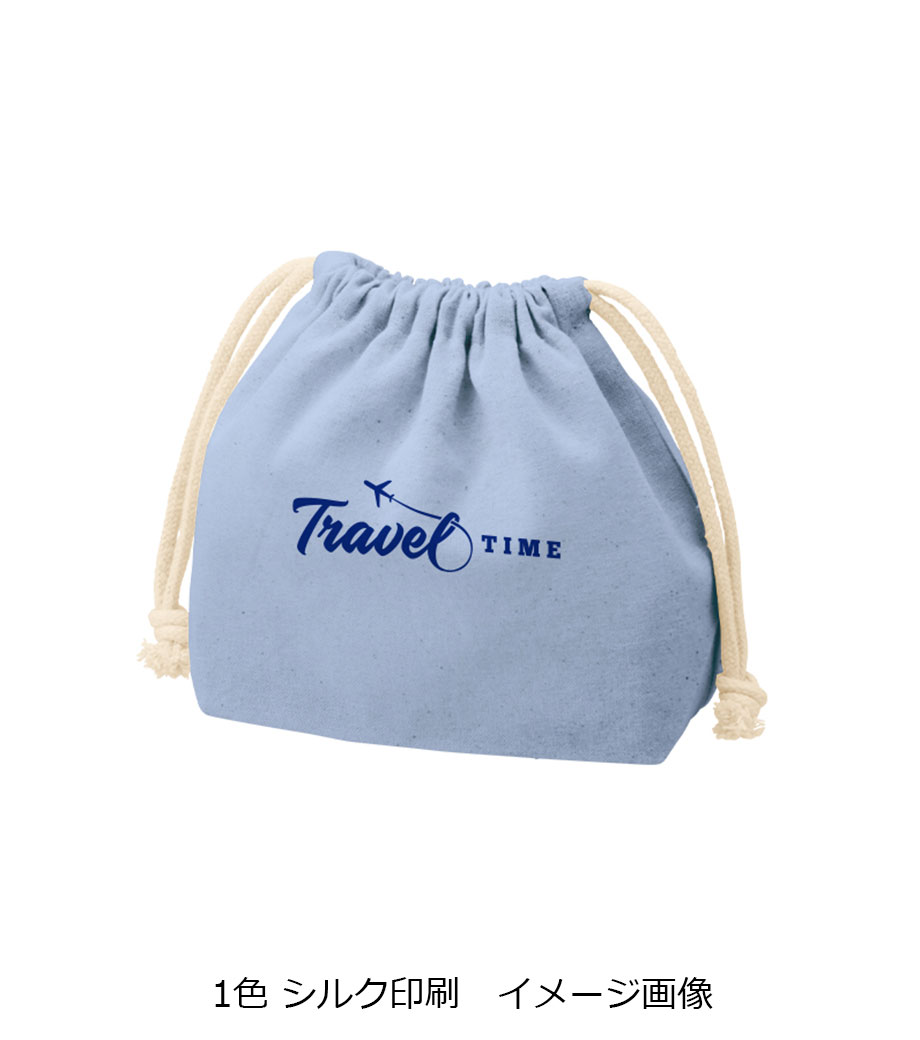 巾着下部のコットン生地にシルク1色印刷かフルカラー印刷ができます。企業ロゴやイラストを印刷すればオリジナル巾着ができます!エコに関連したイベントやキャンペーンのノベルティ、ホテルの宿泊者特典にもおすすめです。