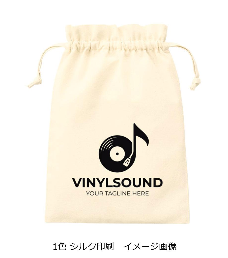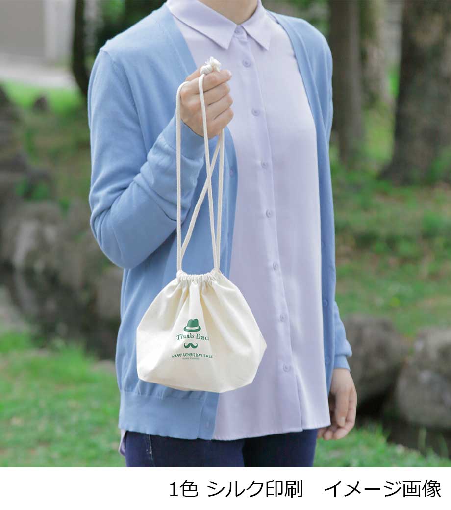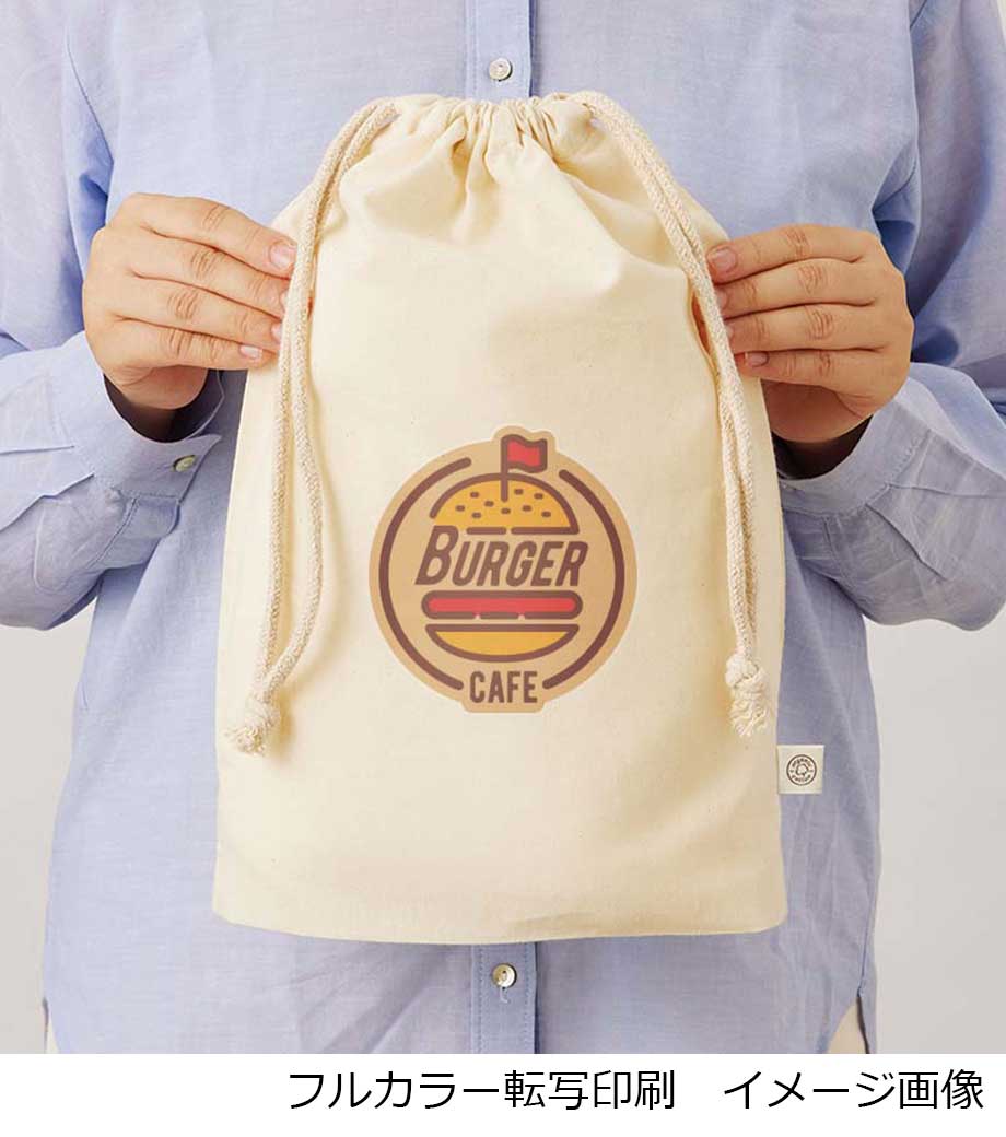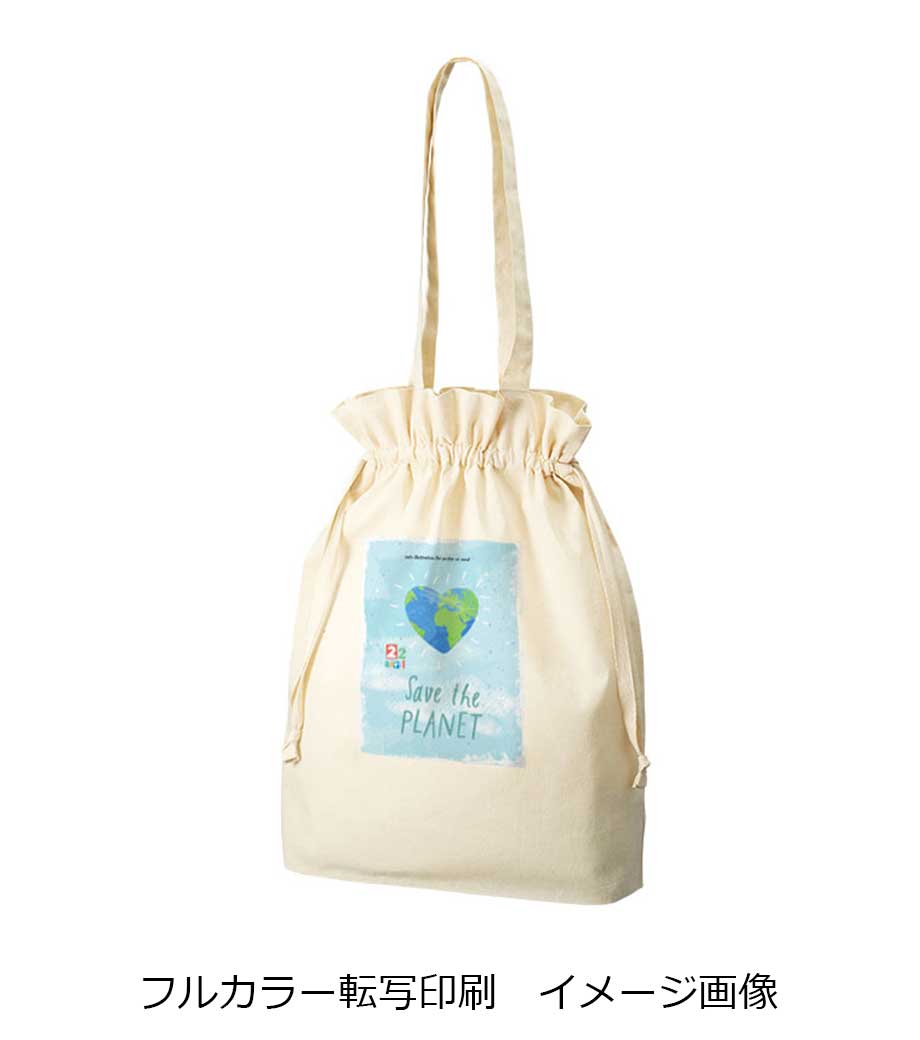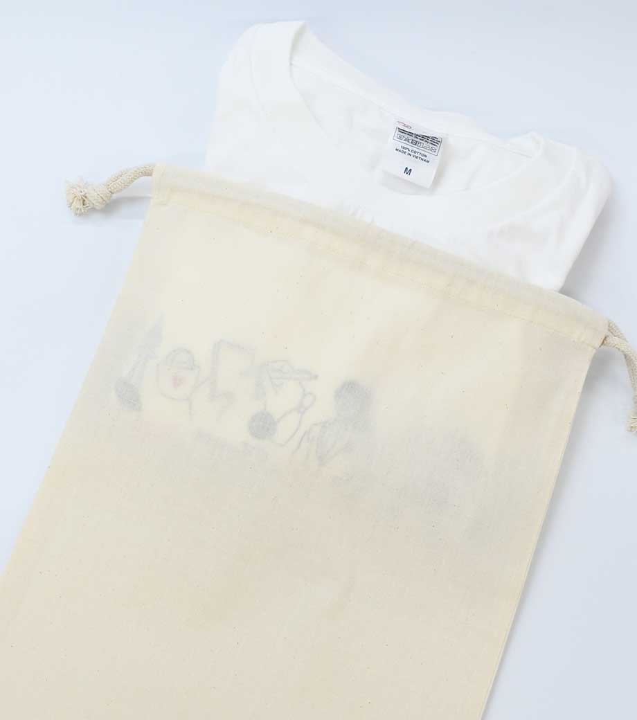 巾着下部のコットン生地にシルク1色印刷かフルカラー印刷ができます。企業ロゴやイラストを印刷すればオリジナル巾着ができます!エコに関連したイベントやキャンペーンのノベルティ、ホテルの宿泊者特典にもおすすめです。