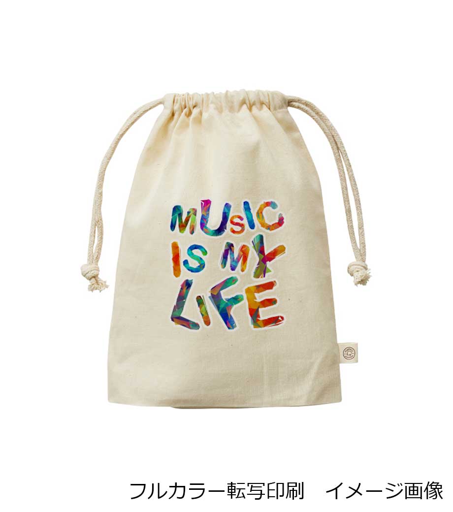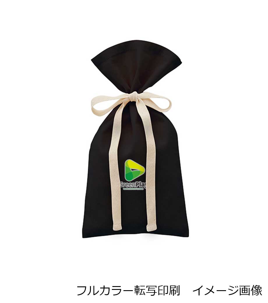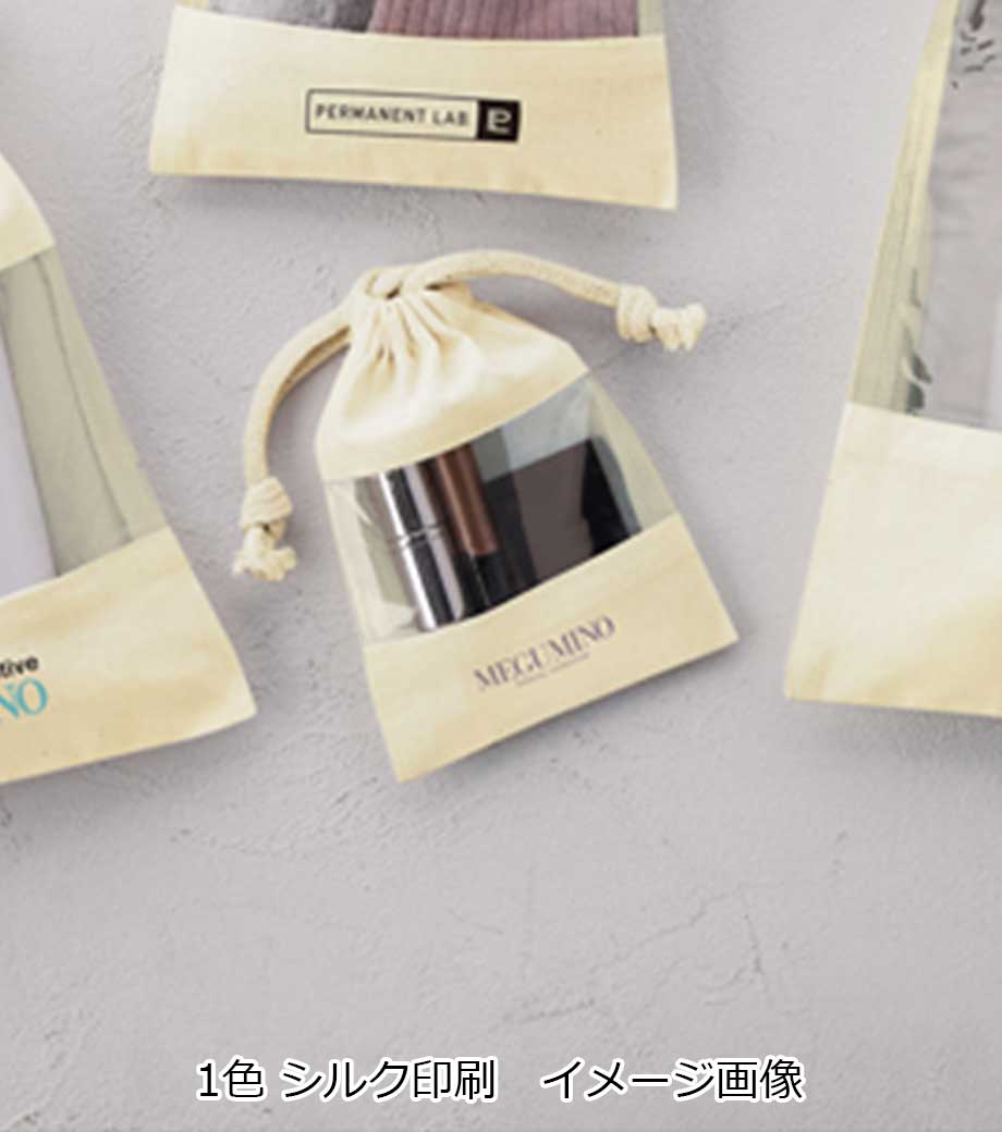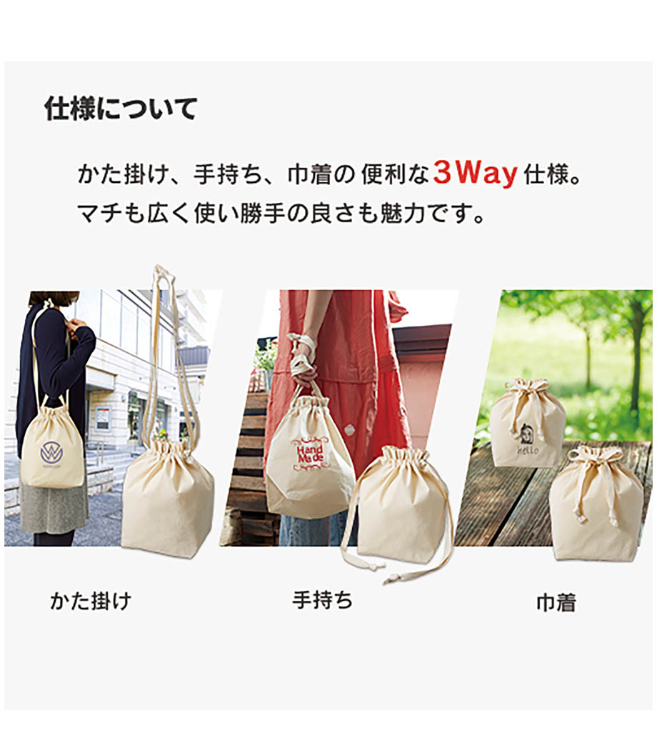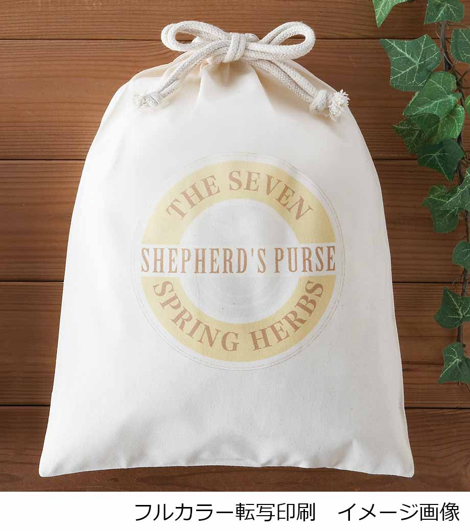 巾着下部のコットン生地にシルク1色印刷かフルカラー印刷ができます。企業ロゴやイラストを印刷すればオリジナル巾着ができます!エコに関連したイベントやキャンペーンのノベルティ、ホテルの宿泊者特典にもおすすめです。