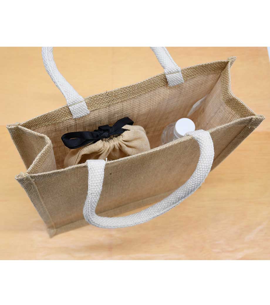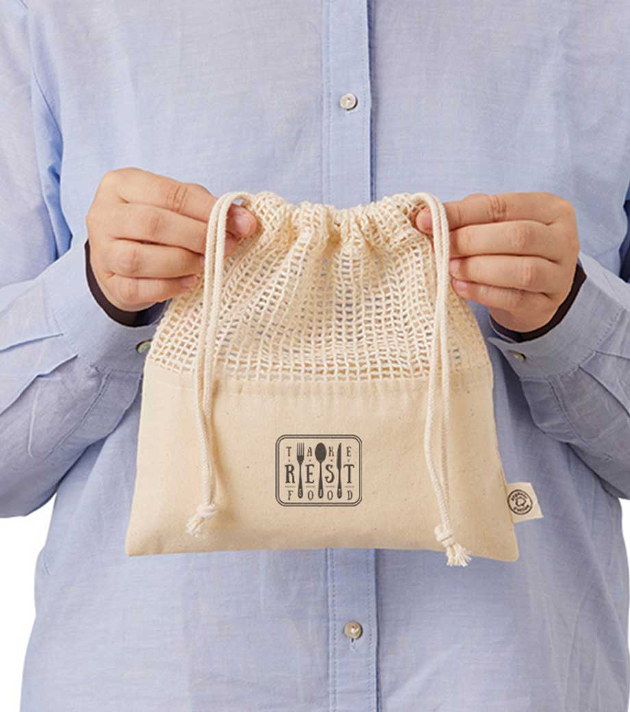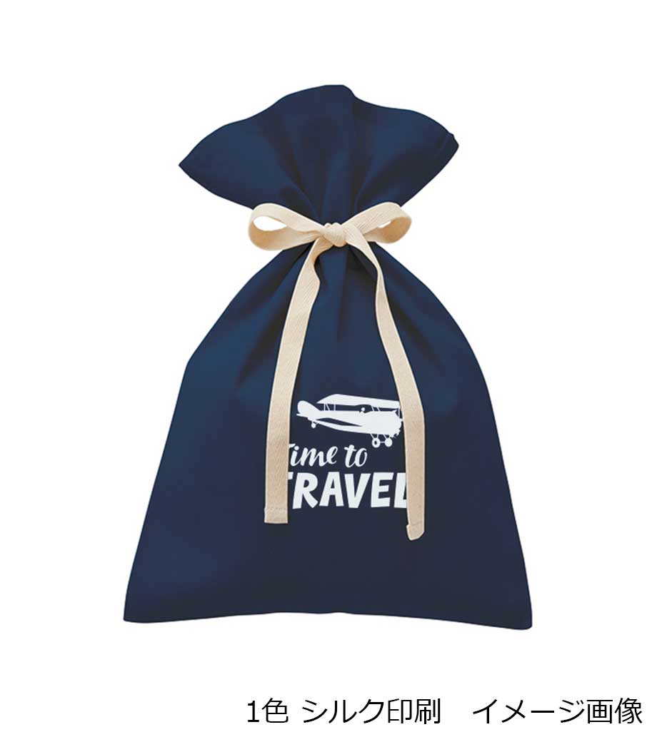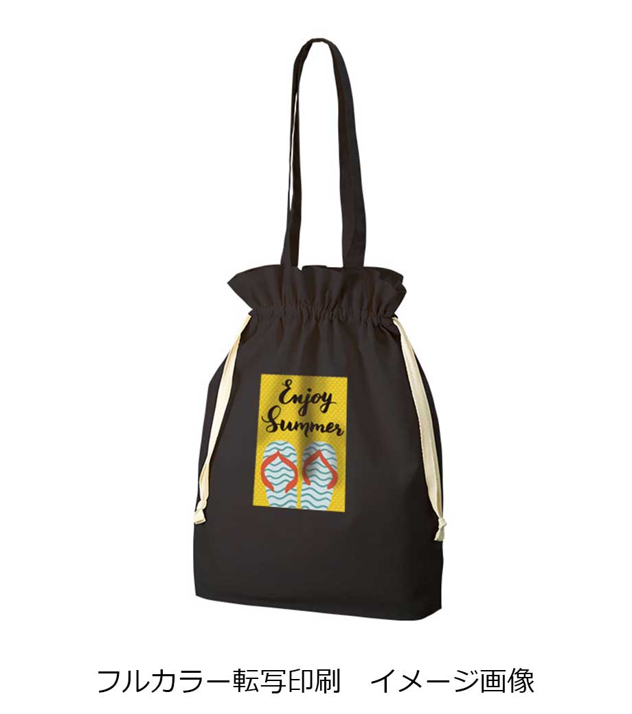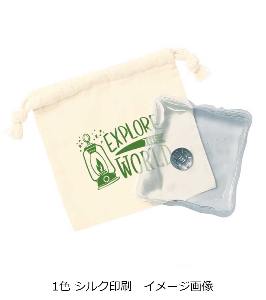 巾着下部のコットン生地にシルク1色印刷かフルカラー印刷ができます。企業ロゴやイラストを印刷すればオリジナル巾着ができます!エコに関連したイベントやキャンペーンのノベルティ、ホテルの宿泊者特典にもおすすめです。