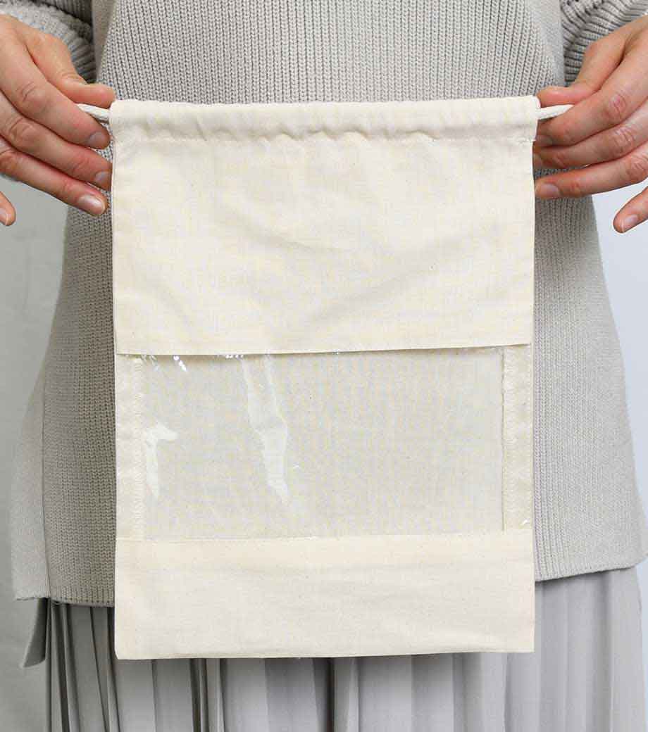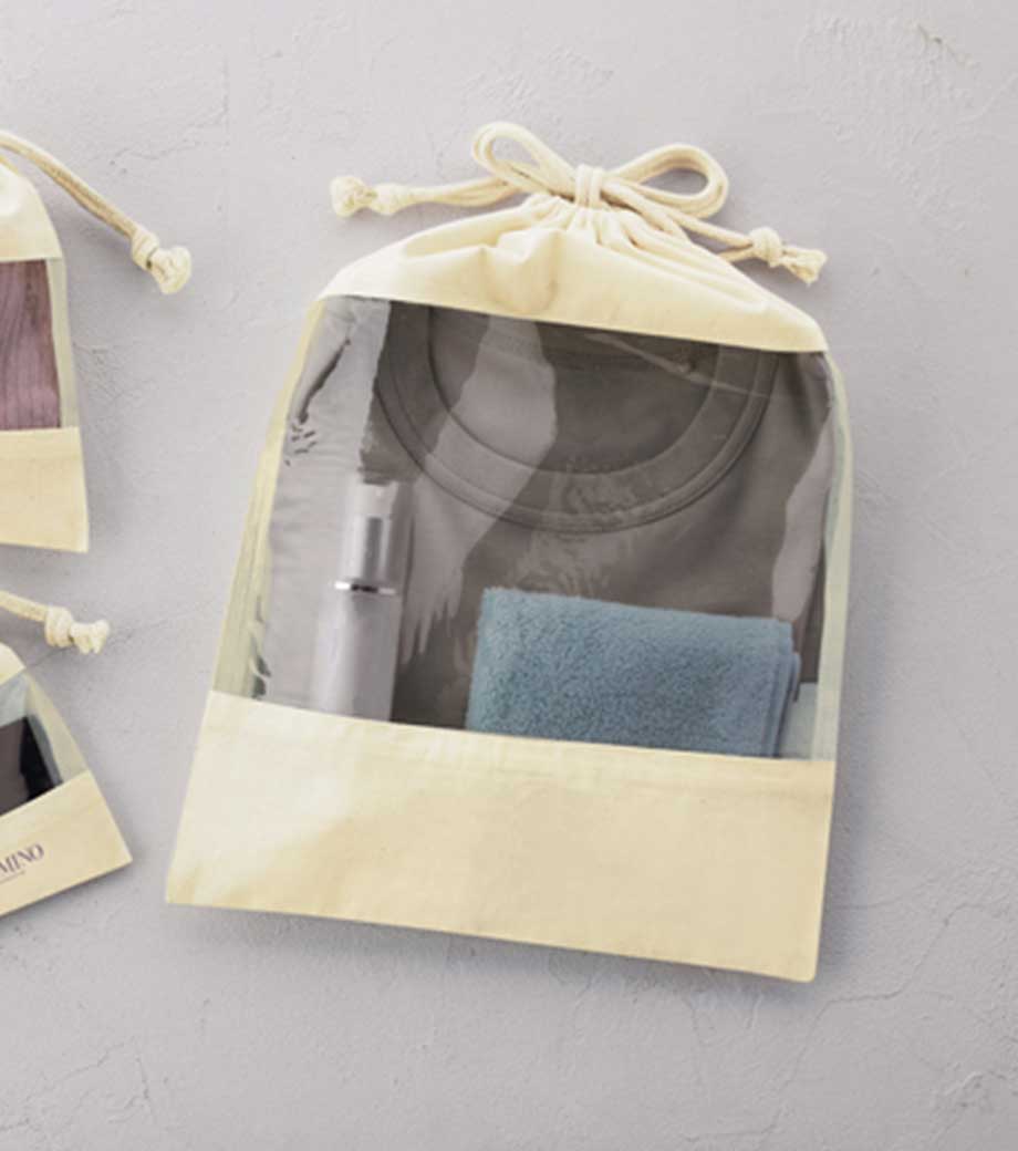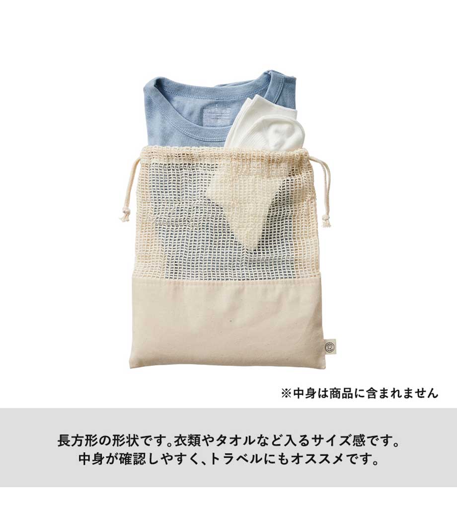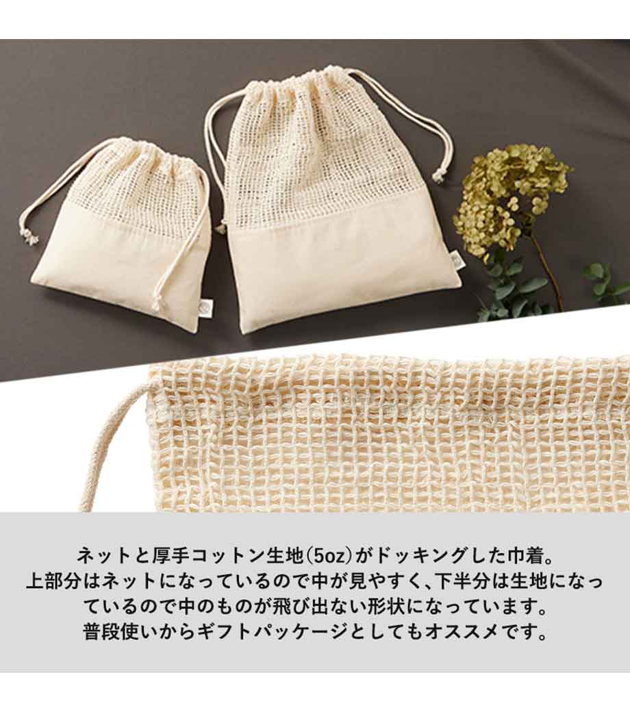 ネット素材と5オンスのコットン生地がドッキング。巾着上部のネットから中身が見えるのでギフトパッケージやラッピングに使ってもおしゃれです。コットン生地は5オンスで程よい薄さ。A4サイズで衣類やタオルが入るサイズ感。普段使いはもちろん、旅行にも使いやすいですね。