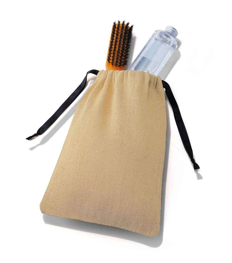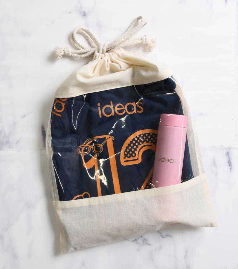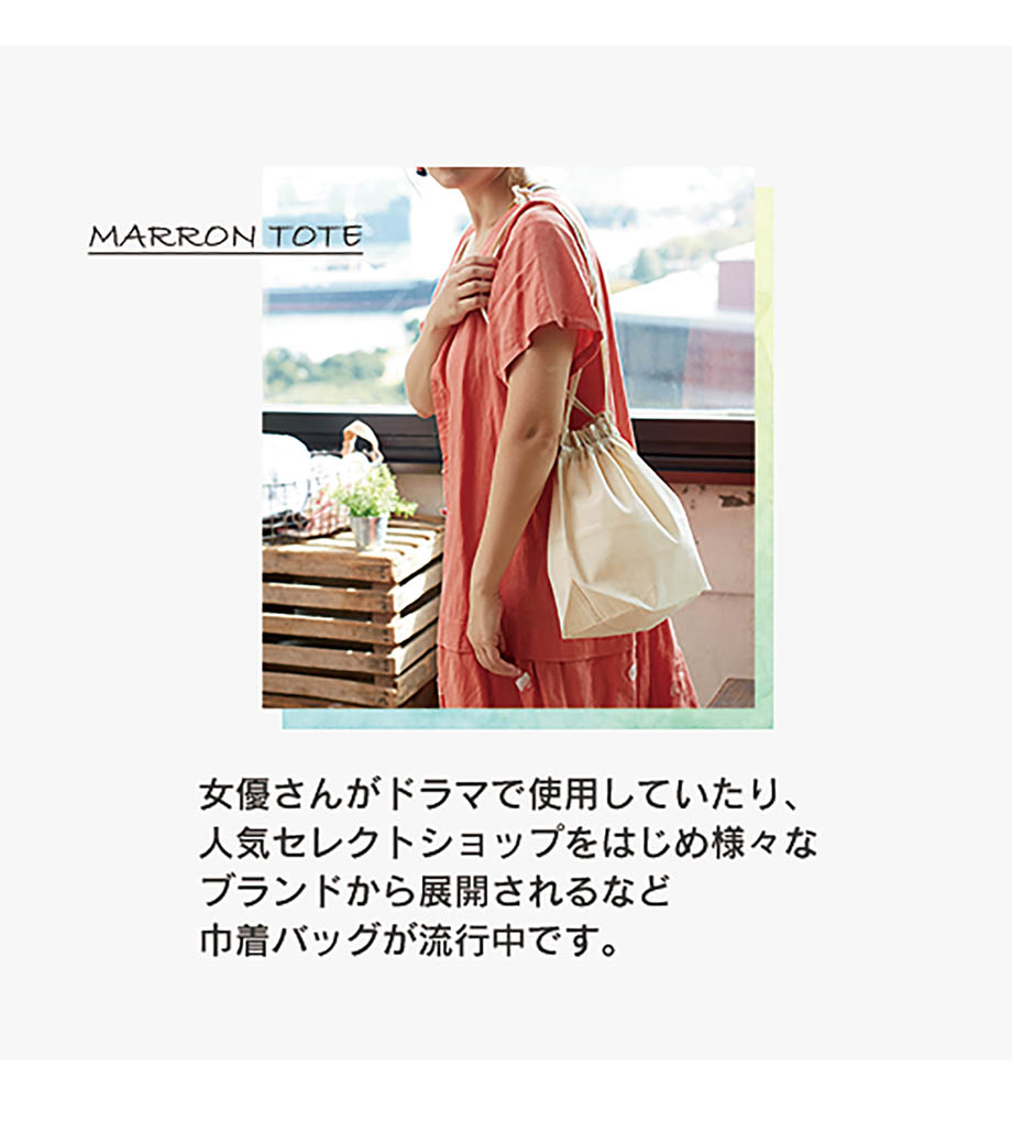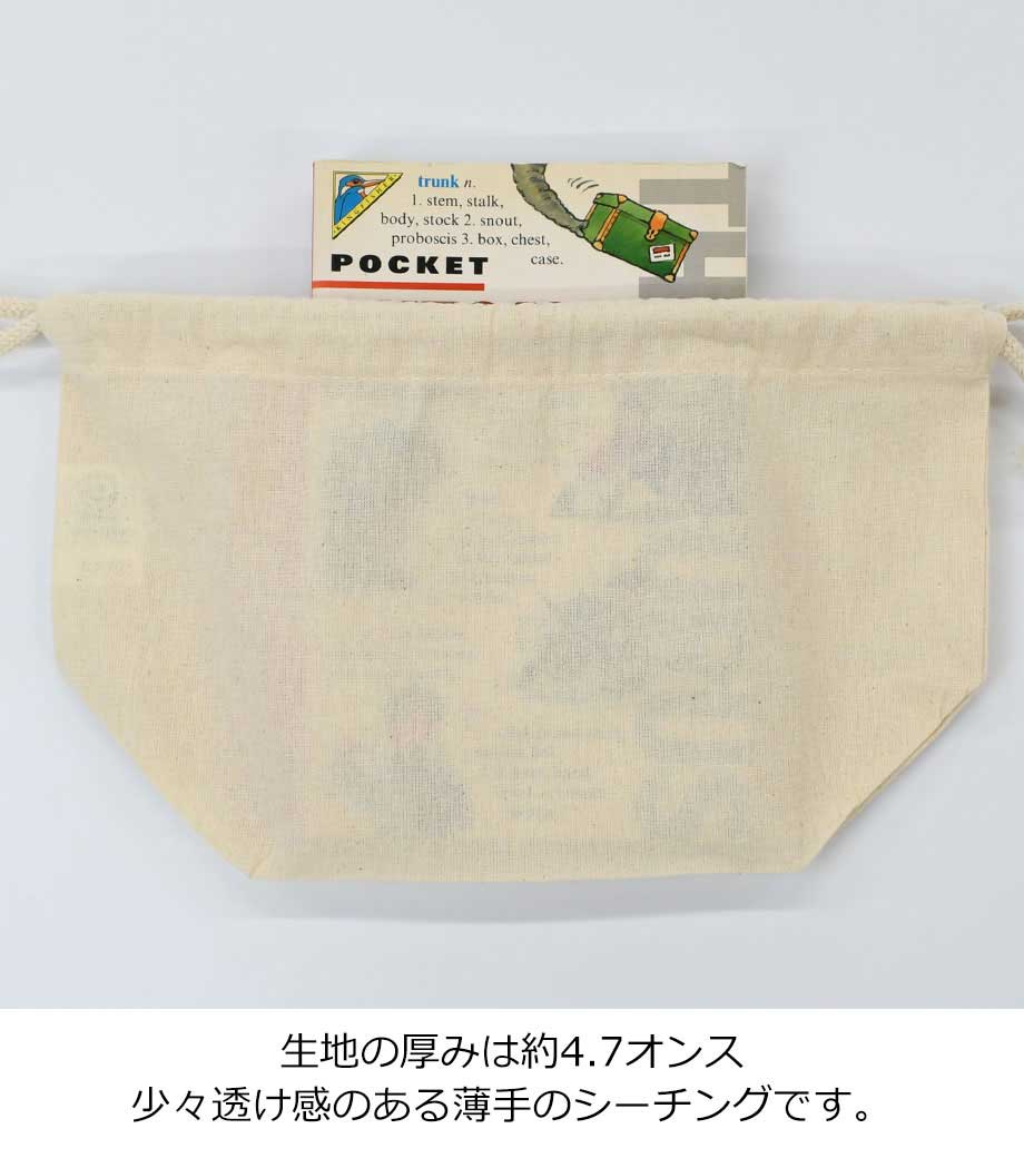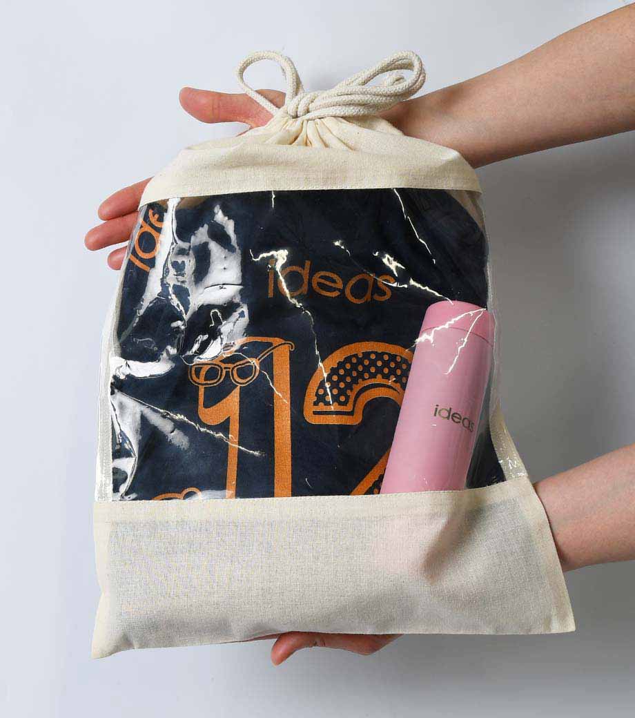 ネット素材と5オンスのコットン生地がドッキング。巾着上部のネットから中身が見えるのでギフトパッケージやラッピングに使ってもおしゃれです。コットン生地は5オンスで程よい薄さ。A4サイズで衣類やタオルが入るサイズ感。普段使いはもちろん、旅行にも使いやすいですね。