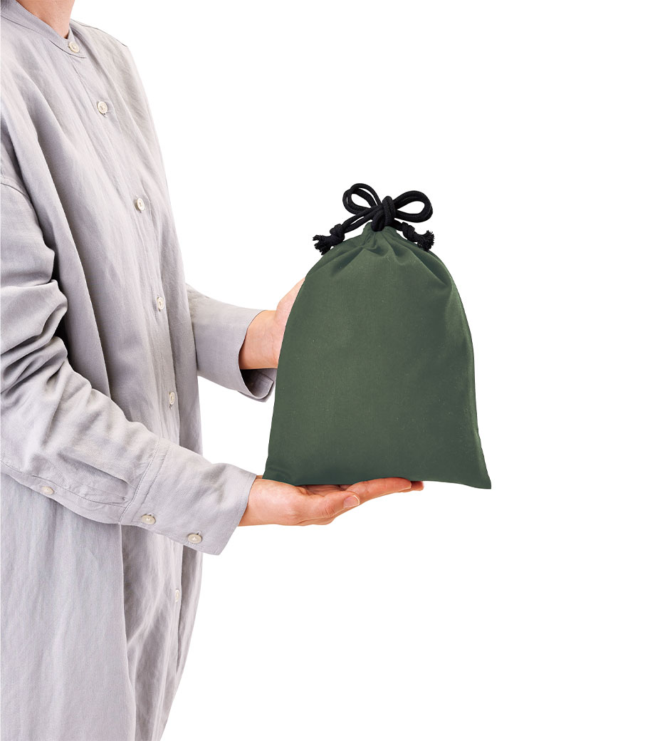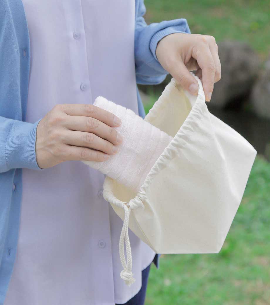 巾着タイプなので一緒に入れる箸ケースやおしぼり等の小物が飛び出さず便利。巾着紐は長めなのでそのまま持ち歩いたり、結んでおくことも可能です。タオルや衛生商品を収納する小物入れにも活用できます。