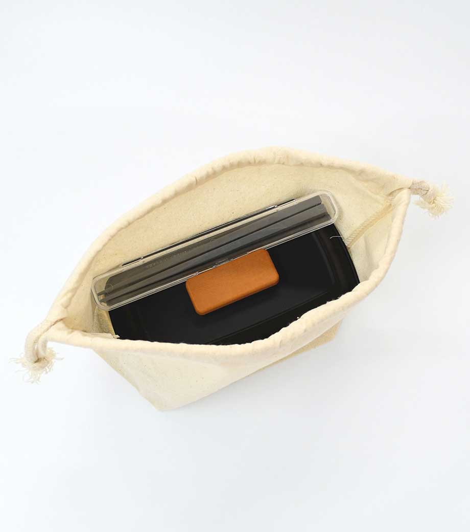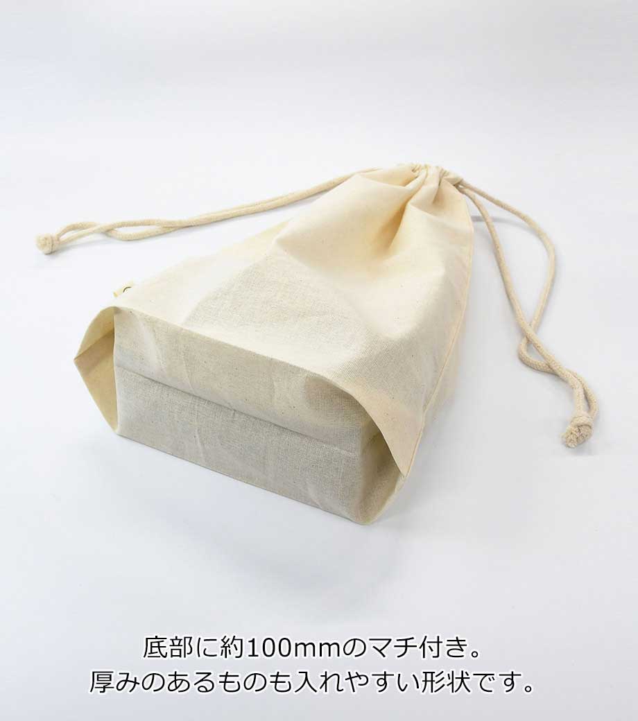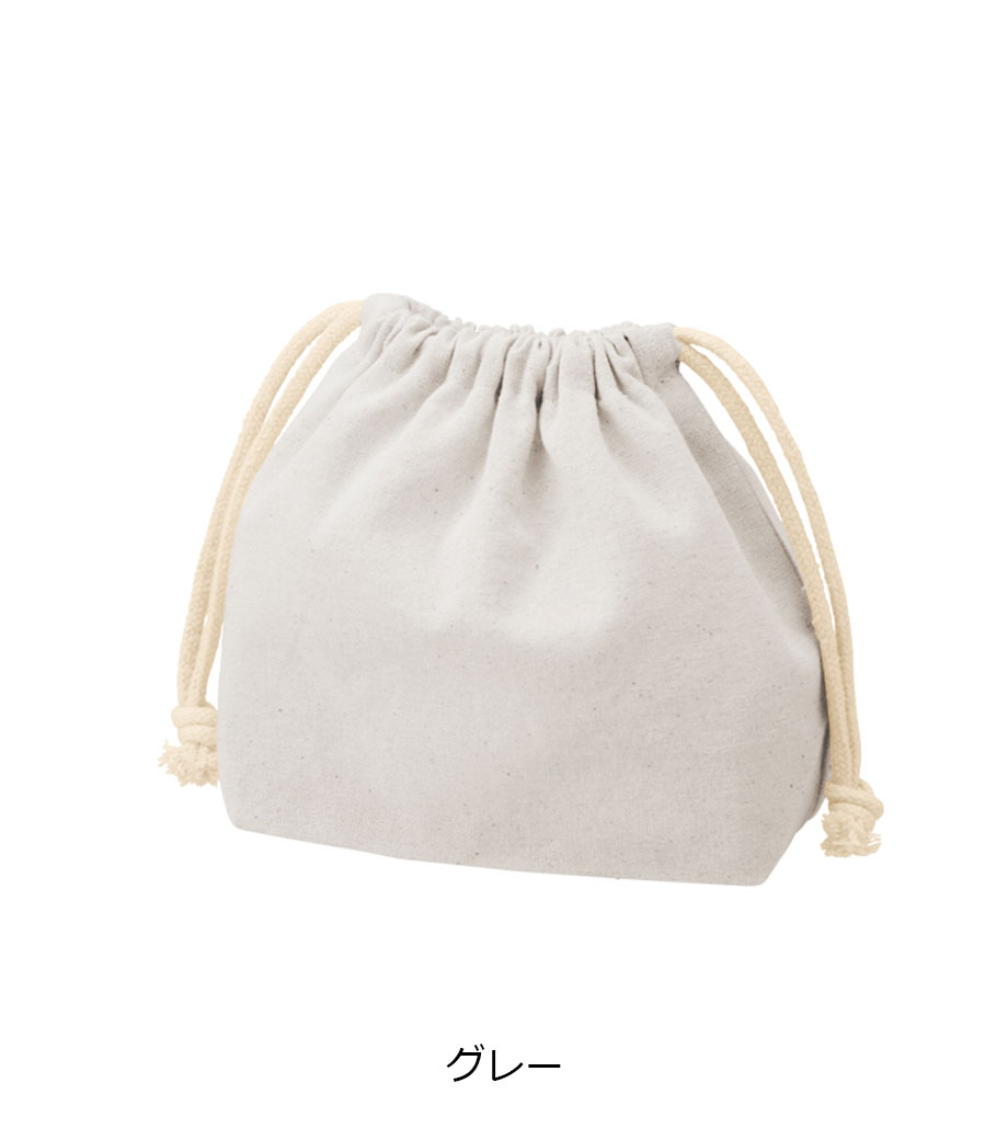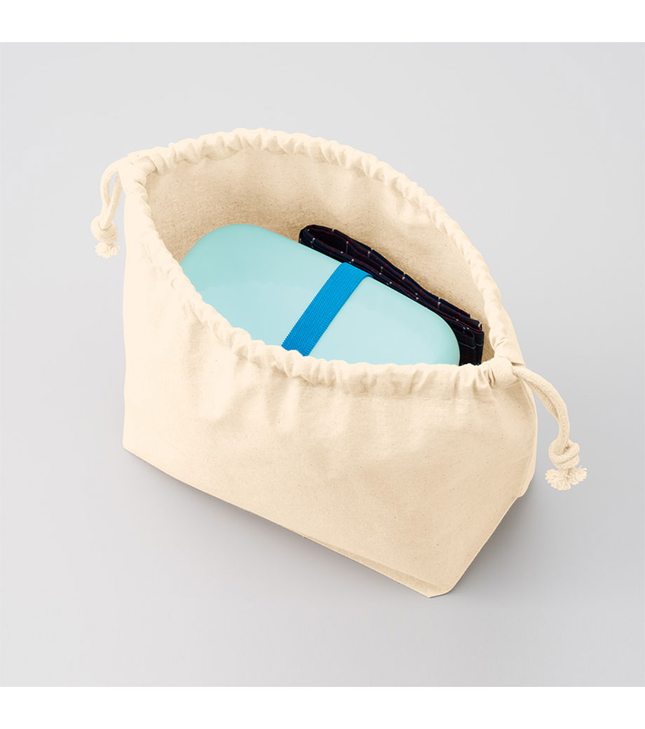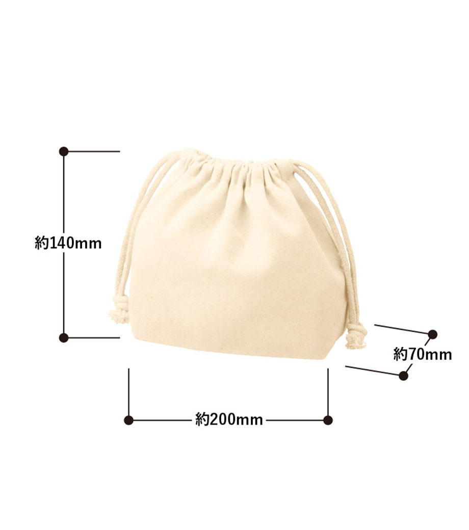 コットンランチ巾着は底にたっぷり約120mmのマチが付いたお弁当入れにぴったりな商品です。生地は約4.7オンスの柔らかいシーチング素材で、地球に優しい無漂白コットンを使用しています。