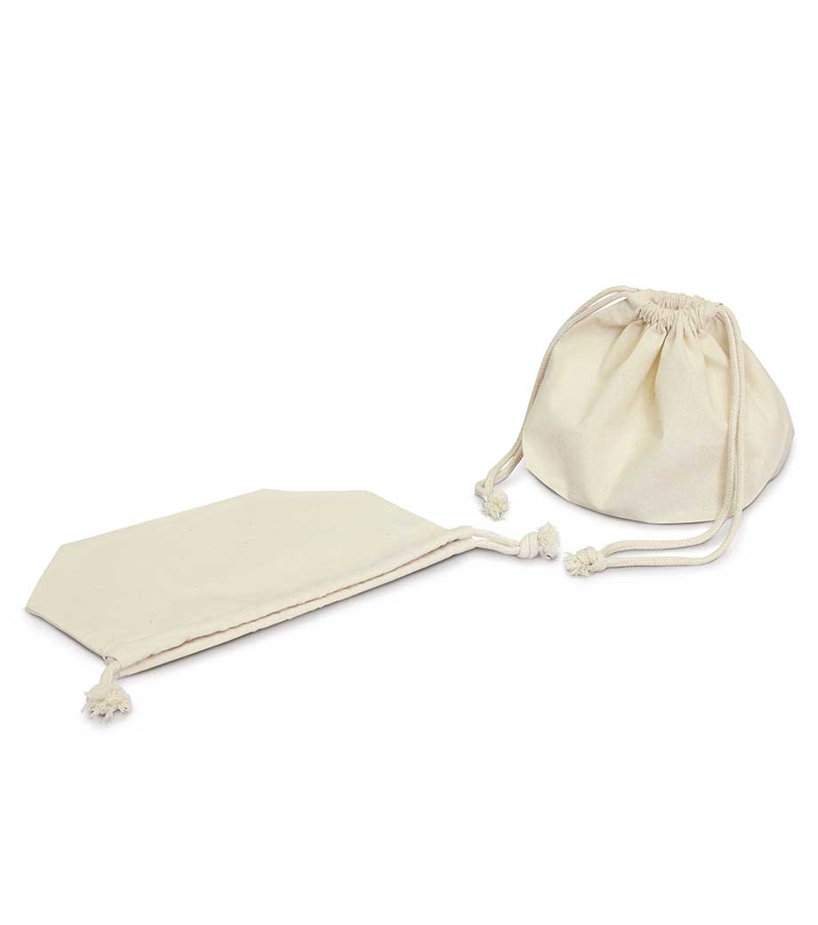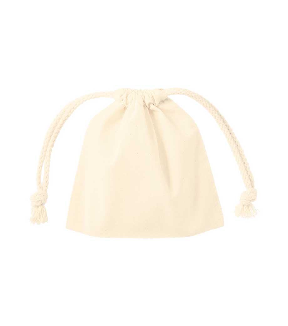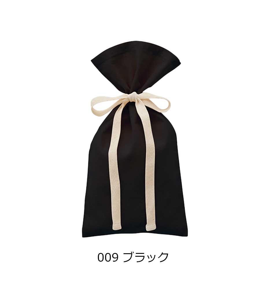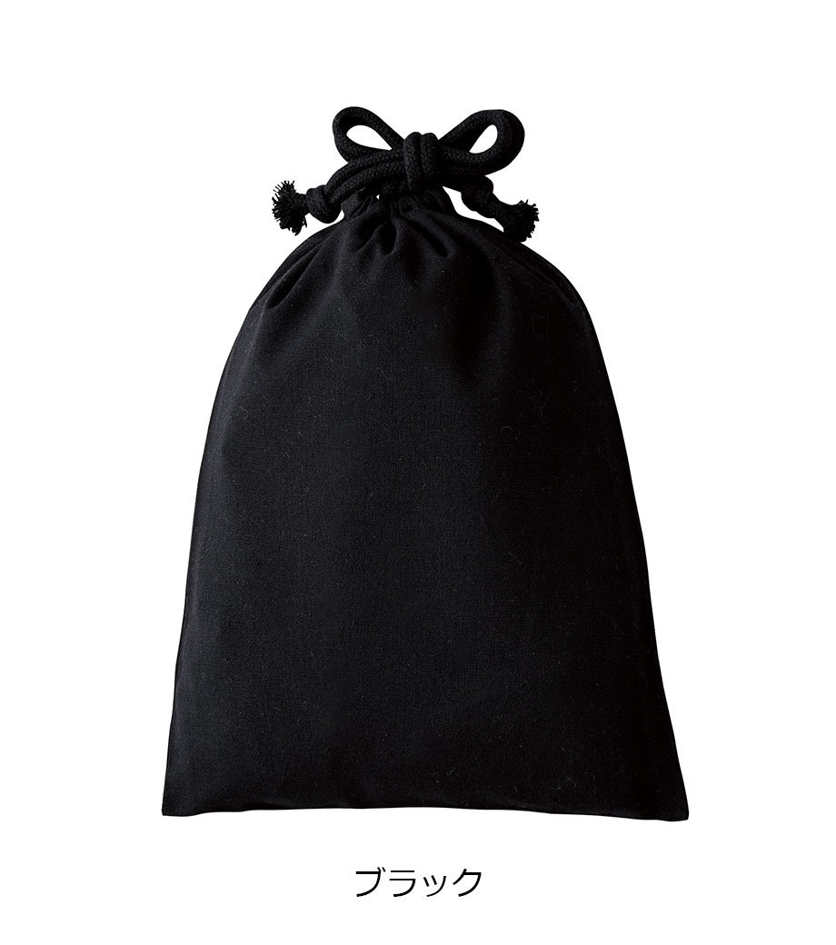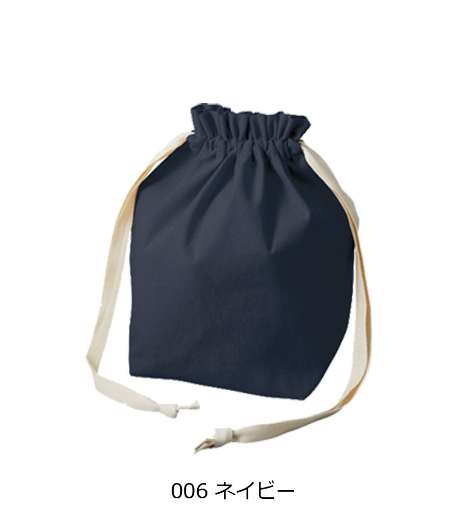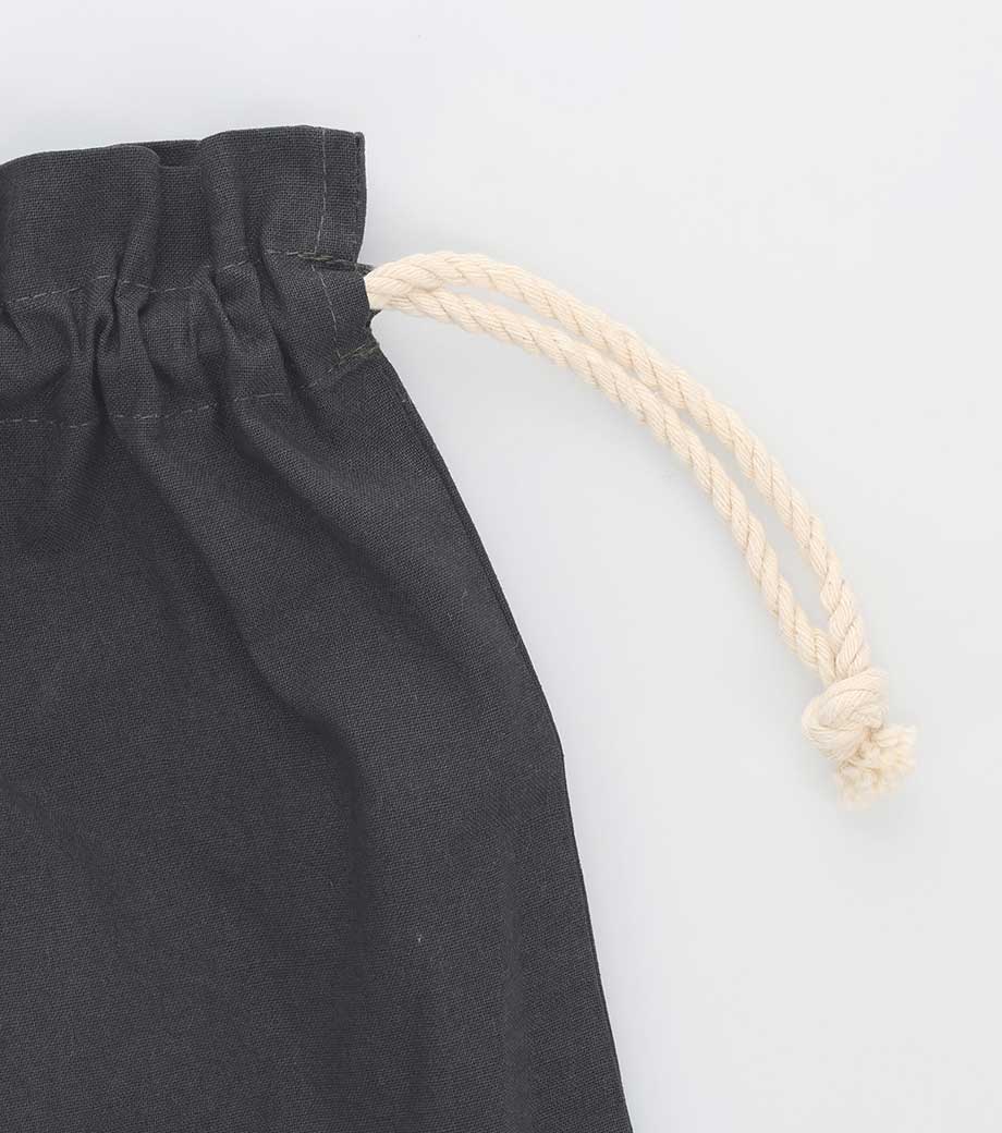 ベーシックで使いやすい5オンスの厚手コットン巾着。マチなしでちょっとしたガジェット入れや、詰め合わせギフト用袋にぴったりです。紐部分は共生地を使用。高級感のある印象です。